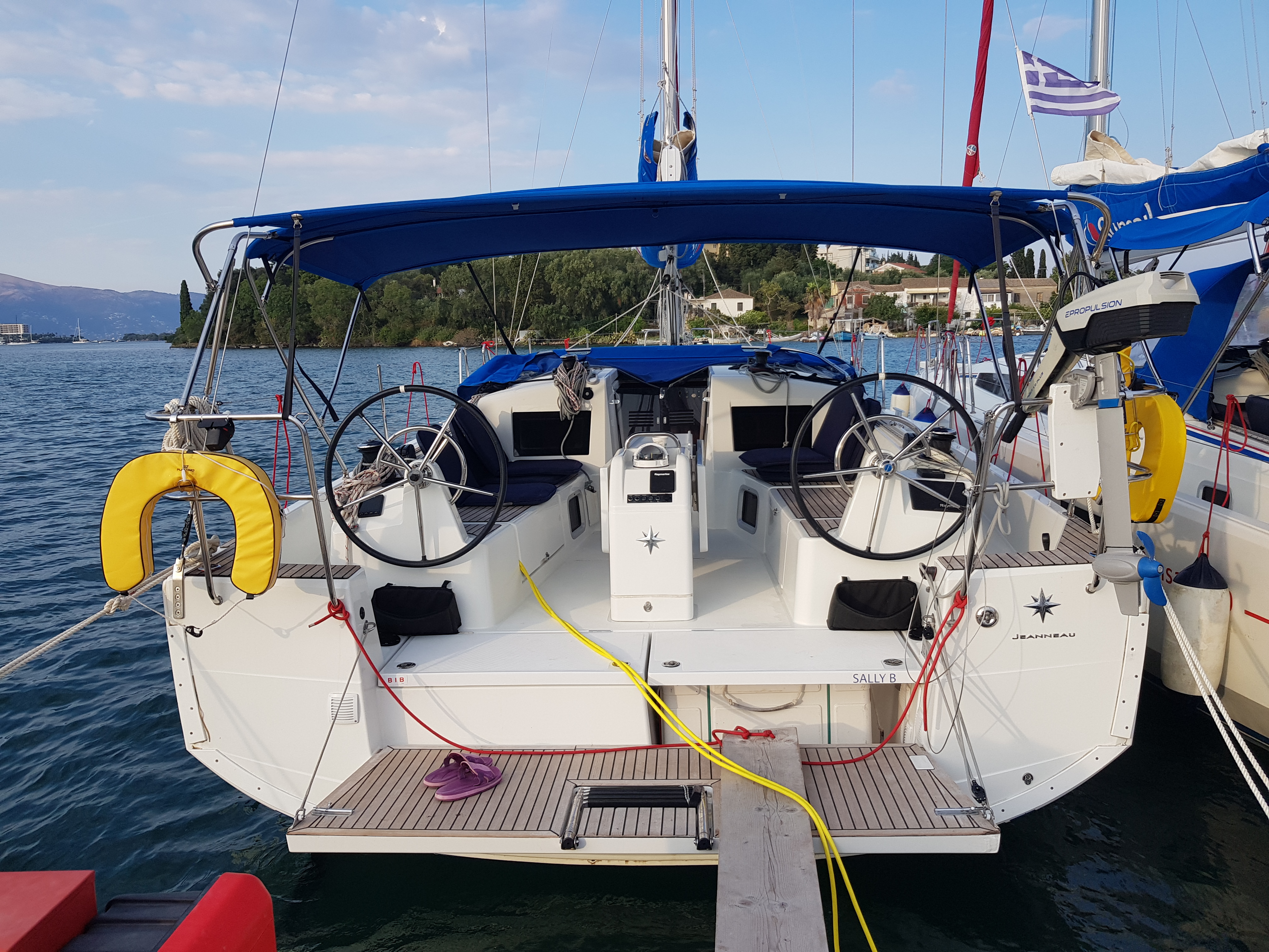 | Outside | 12 V-Anschluss, 220 V Landstromkabel mit Ladegerät, 220 V-Landanschluss, Badeleiter, Badeplattform, Biminitop, Bootshaken, Cockpitlautsprecher, Cockpitpolster, Deckbürste, elektr. Ankerwinsch, Fender, Festmacherleinen, Gangway, Heckdusche, Kunststoff-Eimer (Pütz), Lifeline System, Schnorchelausrüstung, Selbstholende Winschen, Solaranlage, Sprayhood, Wasserschlauch, Windex, Winschen |