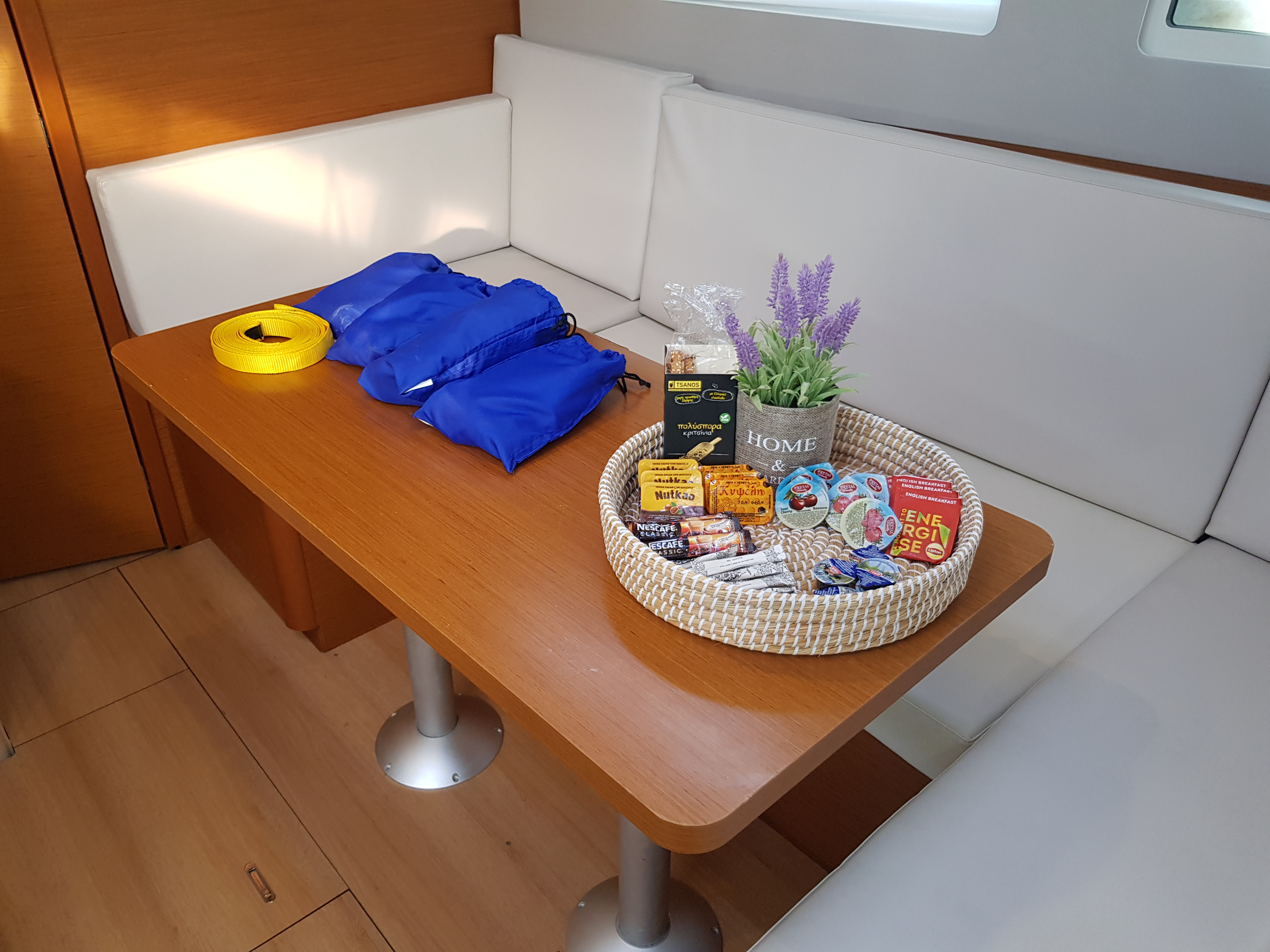 | Inside | Borduhr, CD-Player, Eisbox, Espresso Maschine, Fäkalientank, Frischwasserpumpe, FUSION Sound System, Gasherd mit Backofen, Klimaanlage (Landstrom), Kühlschrank, Ladegerät, Landstromkabel, LED-Innenleuchten, Pantryausstattung, Radio, Salontisch absenkbar, Spüle mit 2 Becken, Trichter, USB Steckdosen in den Kabinen, Ventilatoren in Salon und Kabinen, Warmwasser, WC (elektr.) |