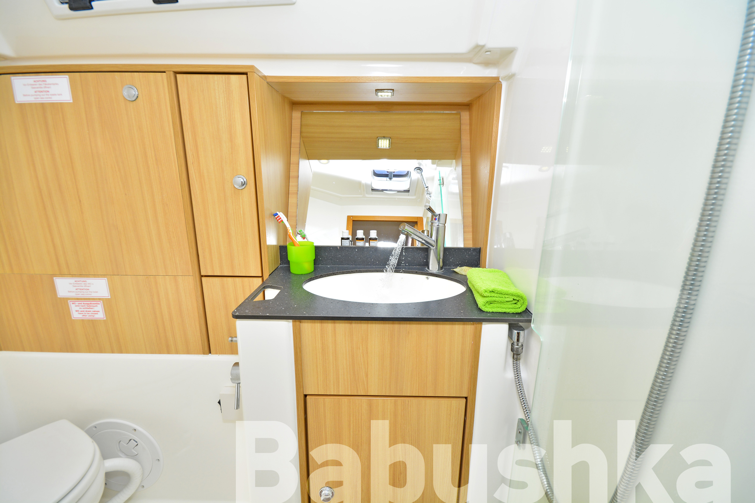 | Inside | Backofen, Borduhr, Gasherd, Kühlschrank, Ladegerät, Pantryausstattung, Radio mit CD, AUX und USB, USB Steckdose, Ventilatoren in Kabinen, Warmwasser, WC (elektr.) |