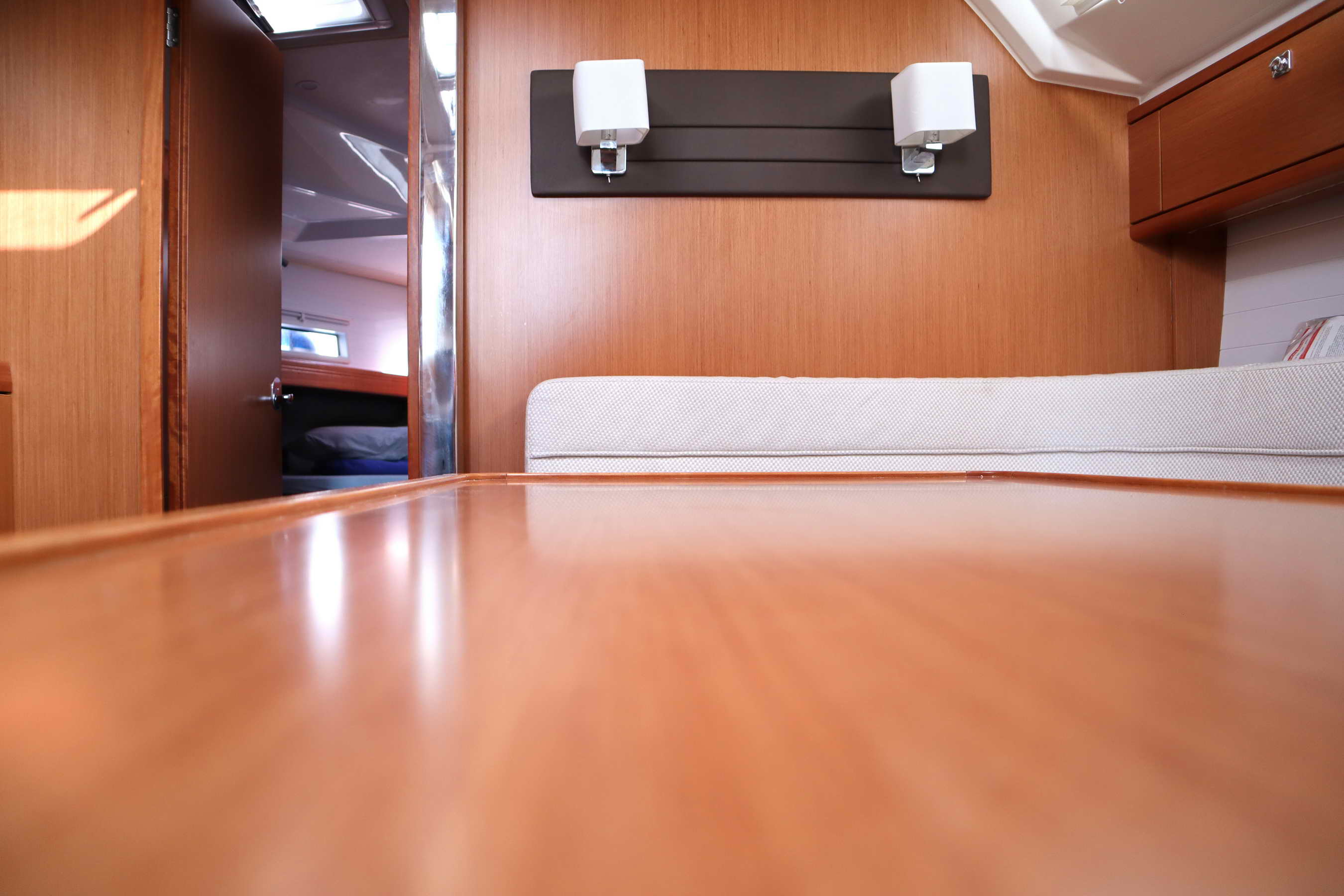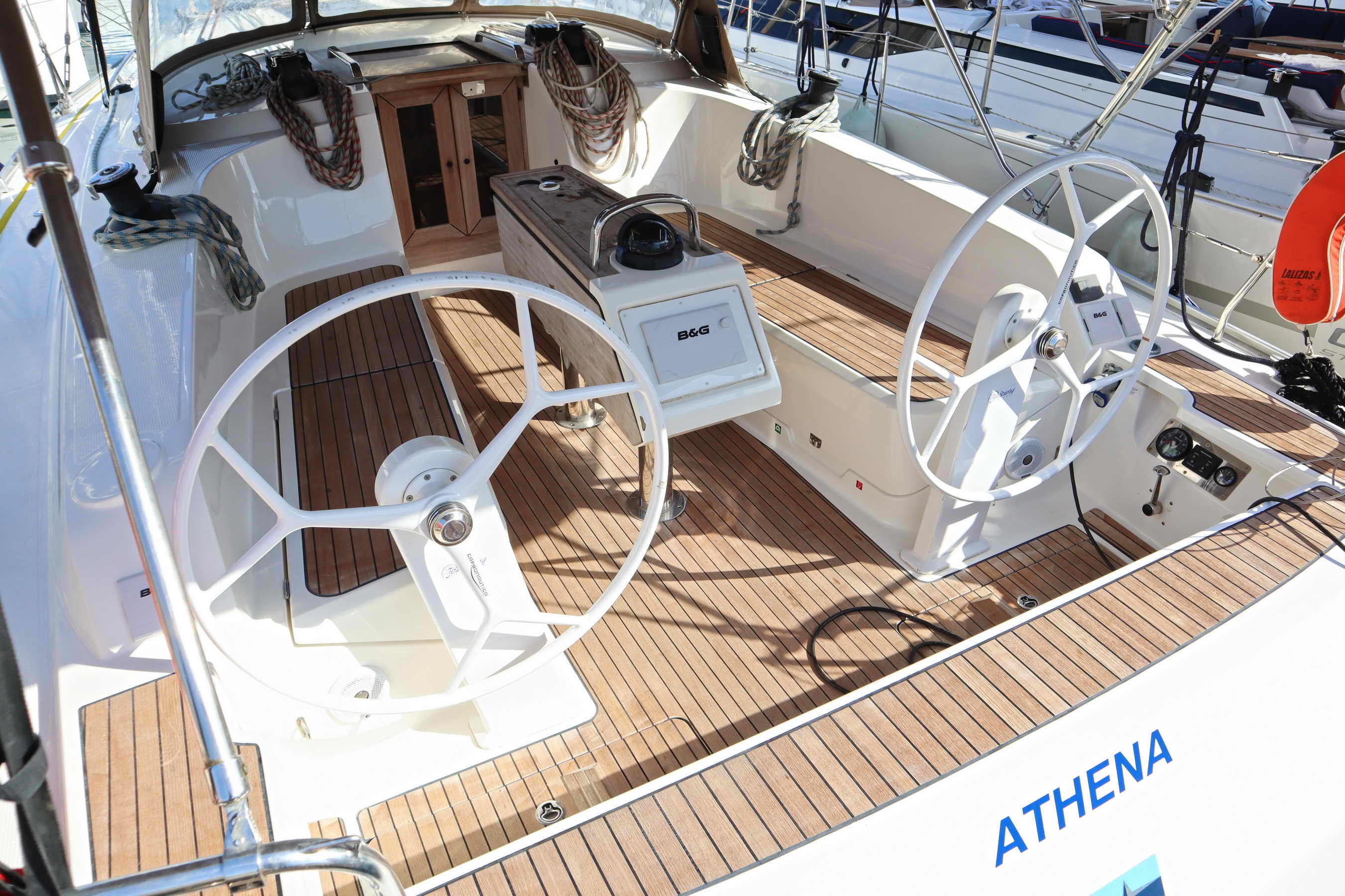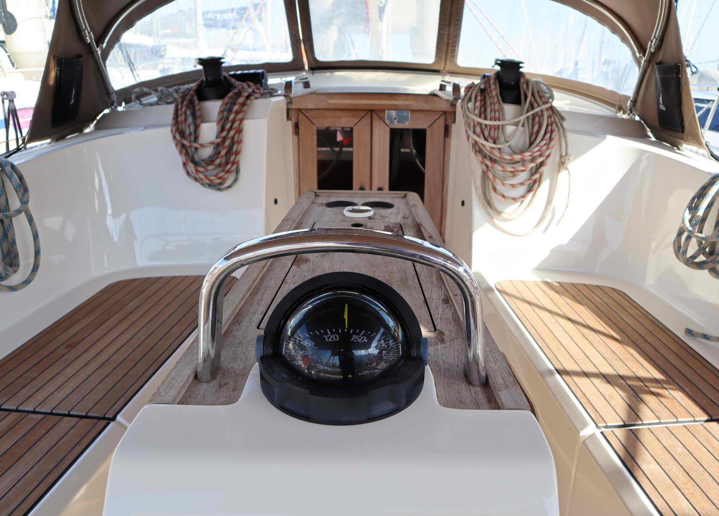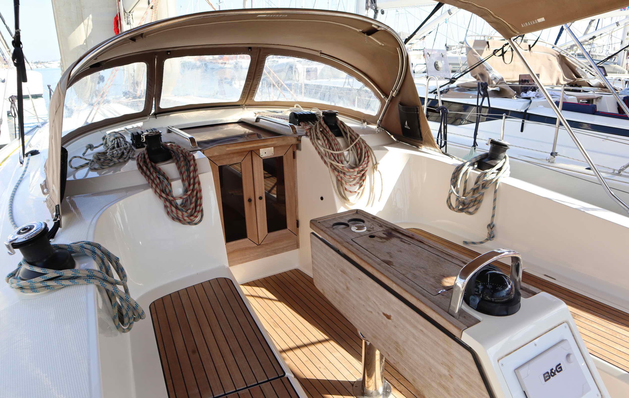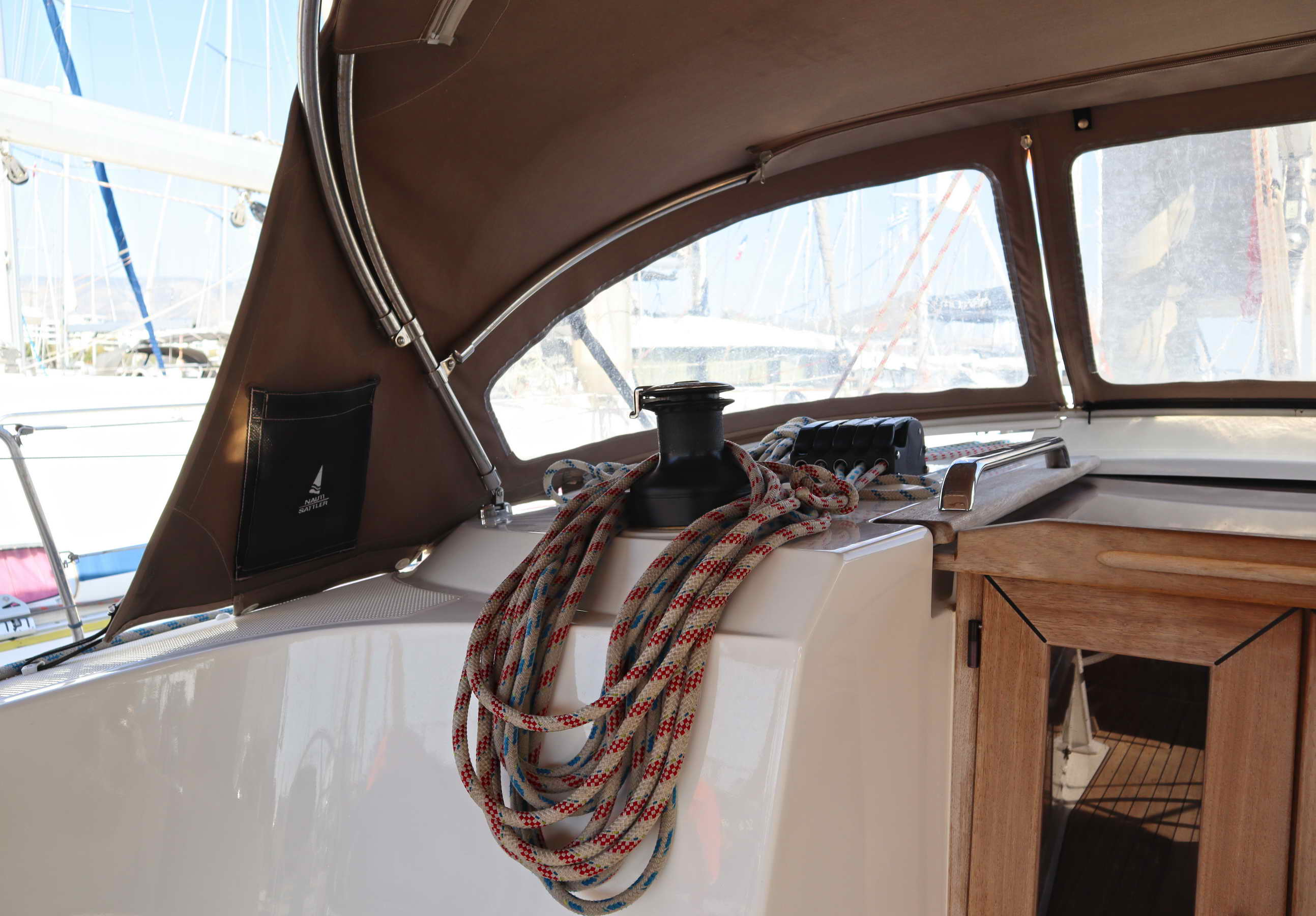 | Outside | Badeplattform, Biminitop, Cockpitdusche, Cockpitpolster, Cockpittisch (klappbar), elektr. Ankerwinsch, Sprayhood |