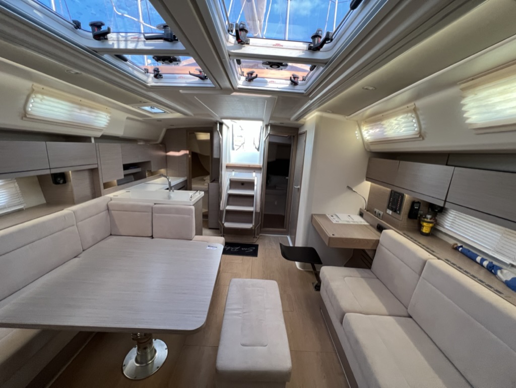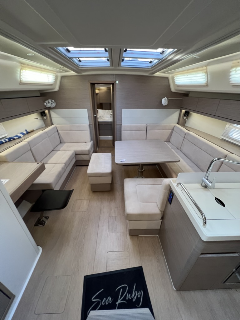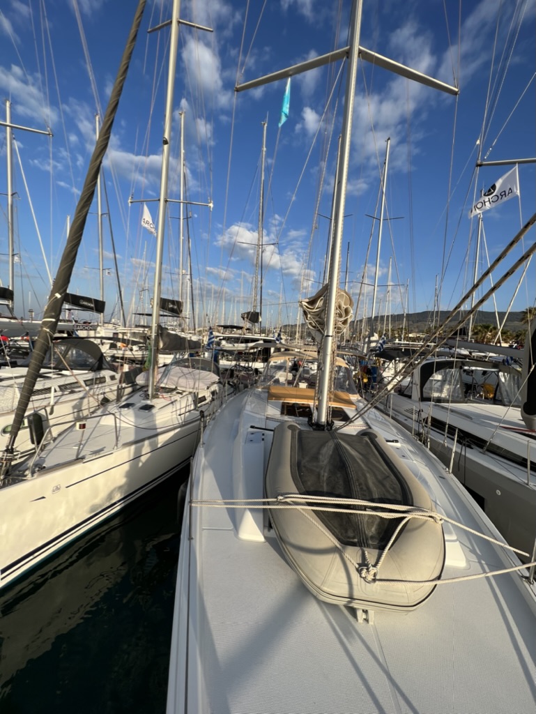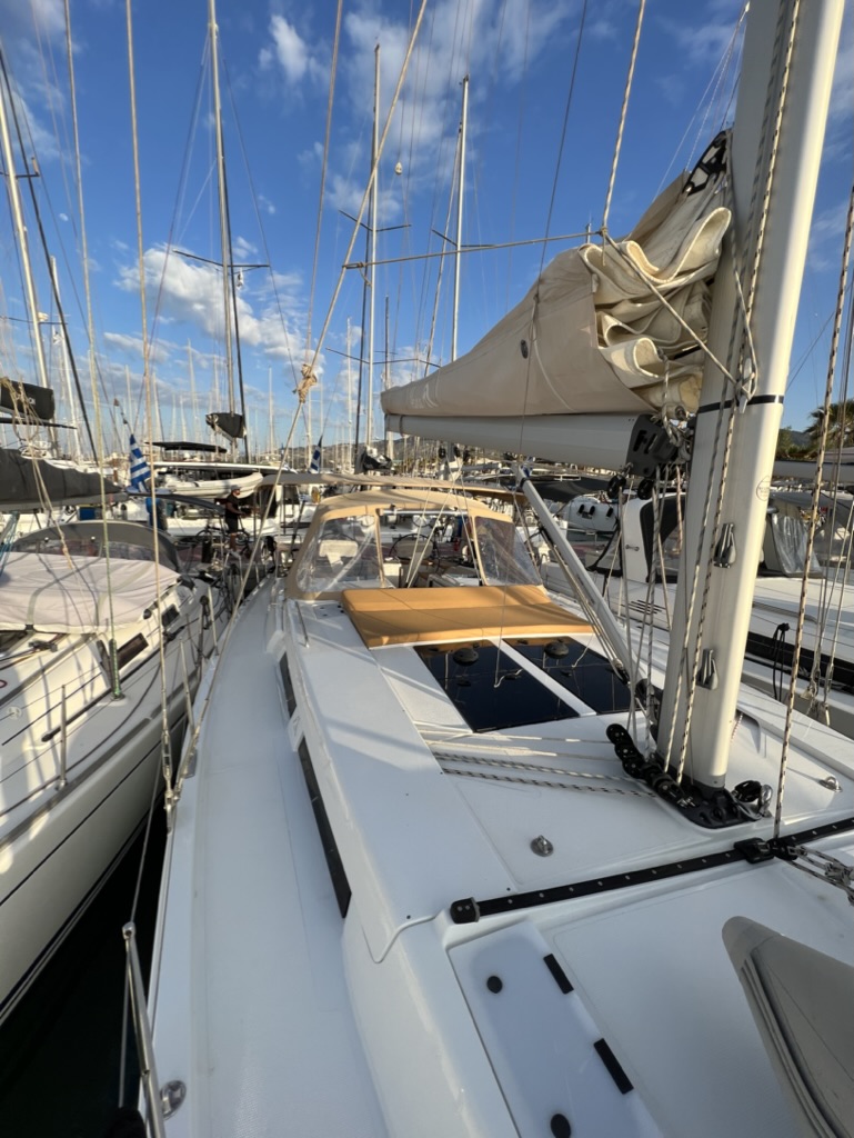 | Outside | Badeleiter, Biminitop, Cockpitdusche, Cockpitlautsprecher, Cockpitpolster, Cockpittisch, elektr. Ankerwinsch, Fender, Solaranlage, Sprayhood, Teak im Cockpit, Teakdeck |