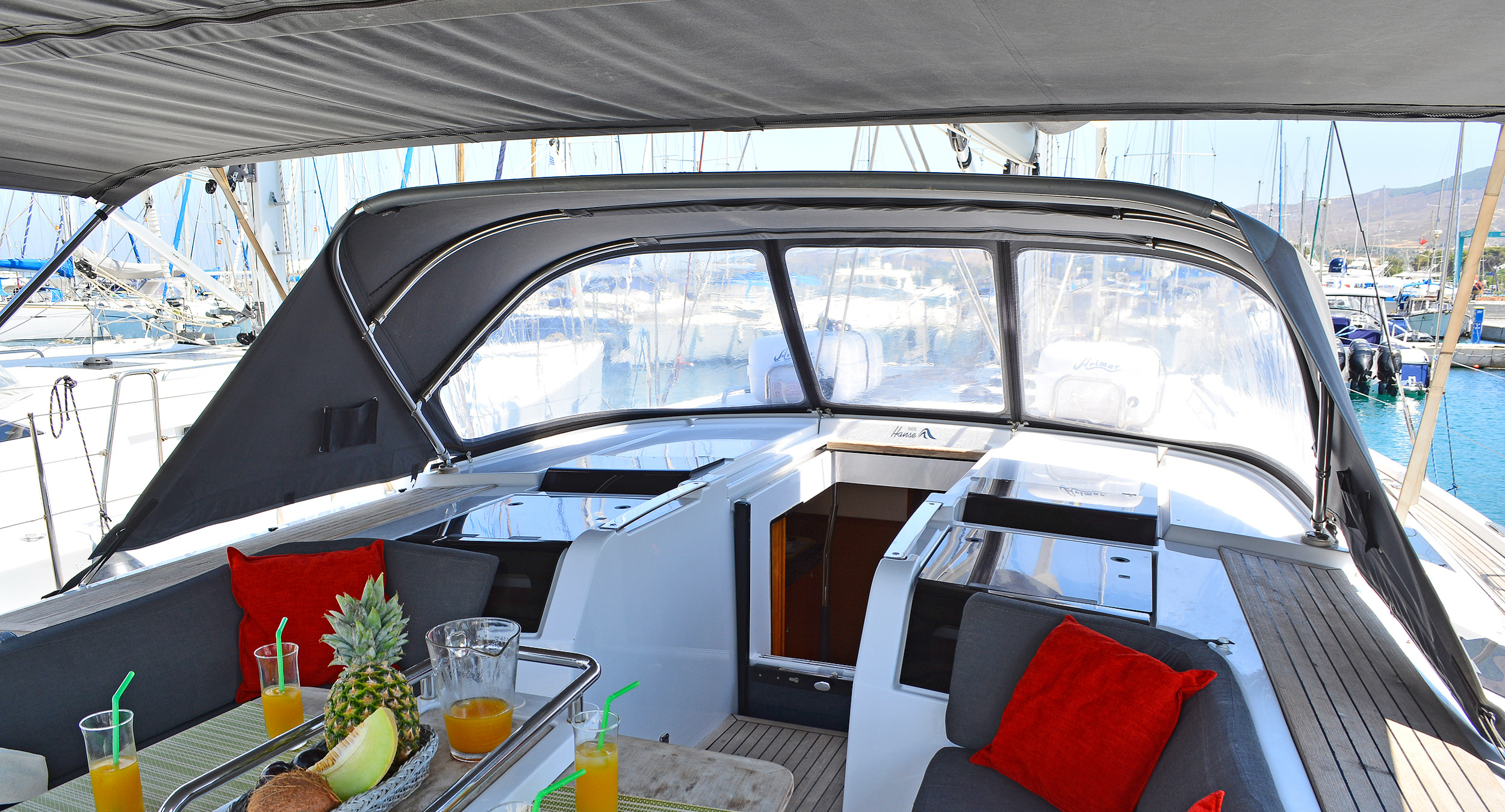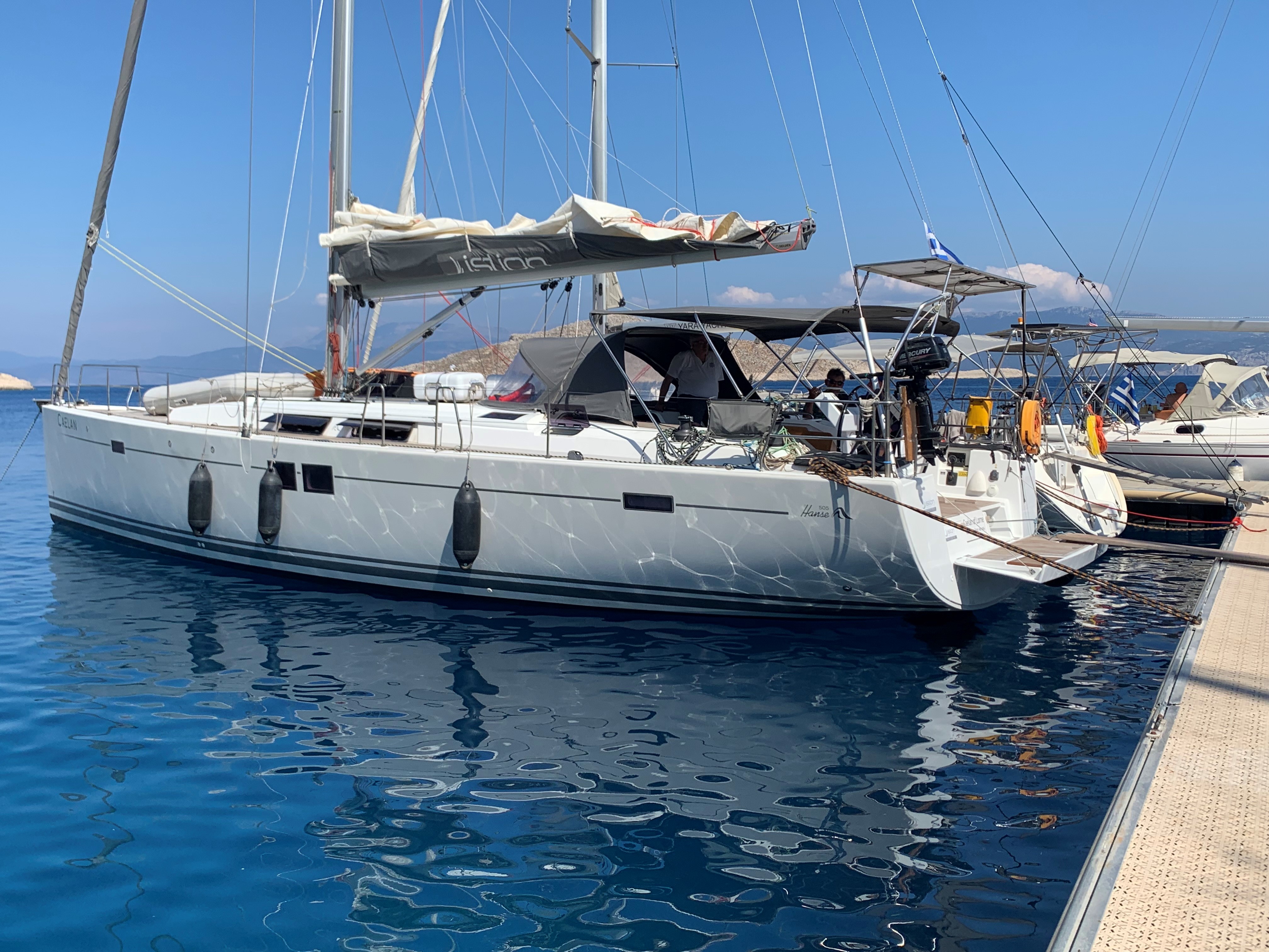 Der technische Zustand des Bootes wurde durch das defekte Bugstrahlruder etwas beeinträchtigt. Das Bugstrahlruder ist nicht, wie üblich, im Steven angebracht sondern wird nach unten ausgefahren und damit sehr beschädigungsanfällig. Die polnische Torcrew riss es ab als sie beim achterausfahren in die Mooringleine kam. Auch das Starten des Volvo-PentaMotors war nur zeitverzögernd möglich. Schwierig war auch das Manövrieren auf engem Raum. da der Rückwärtsgang nur nach 3-5 Sekunden eingelegt werden kann um den Faltpropeller aufgehen zu lassen. Das Bergen des Großsegels kompliziert. Istion wird jetzt eine Sorgleine anbringen um das Bergen zu erleichtern. Insgesamt ist zu bemerken, dass das Boot zwar gut segelt, im Innenraum insb. in den Kabinen ist aber nur sehr wenig Platz. Wie man in dieses Boot mehr als sechs Personen buchen kann ist für mich unverständlich. Die Technik ist hochcomputerisiert und für ältere Segler nicht leicht zu bedienen. Dies gilt ins. für die Navigationsbildschirme. Ich würde eine Hanse nicht mehr buchen sondern reumütig zu Jeaneau bzw. Beneteau zurückkehren.