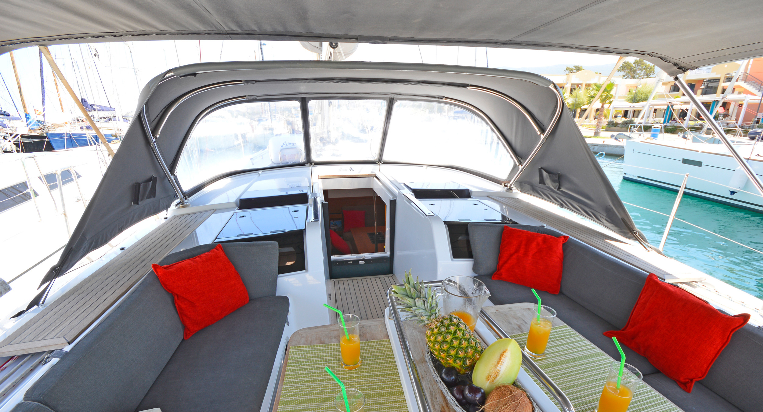 | Outside | 220 V-Landanschluss, Anker mit Kette, Badeleiter, Biminitop, Bootshaken, Cockpitpolster, Cockpittisch, elektr. Ankerwinsch, elektr. Winsch, Fender, Festmacherleinen, Gangway, Schnorchelausrüstung, Solaranlage, Sprayhood, Teakdeck, Unterwasserbeleuchtung, Wantenschneider, Wasserschlauch, Winschen |
