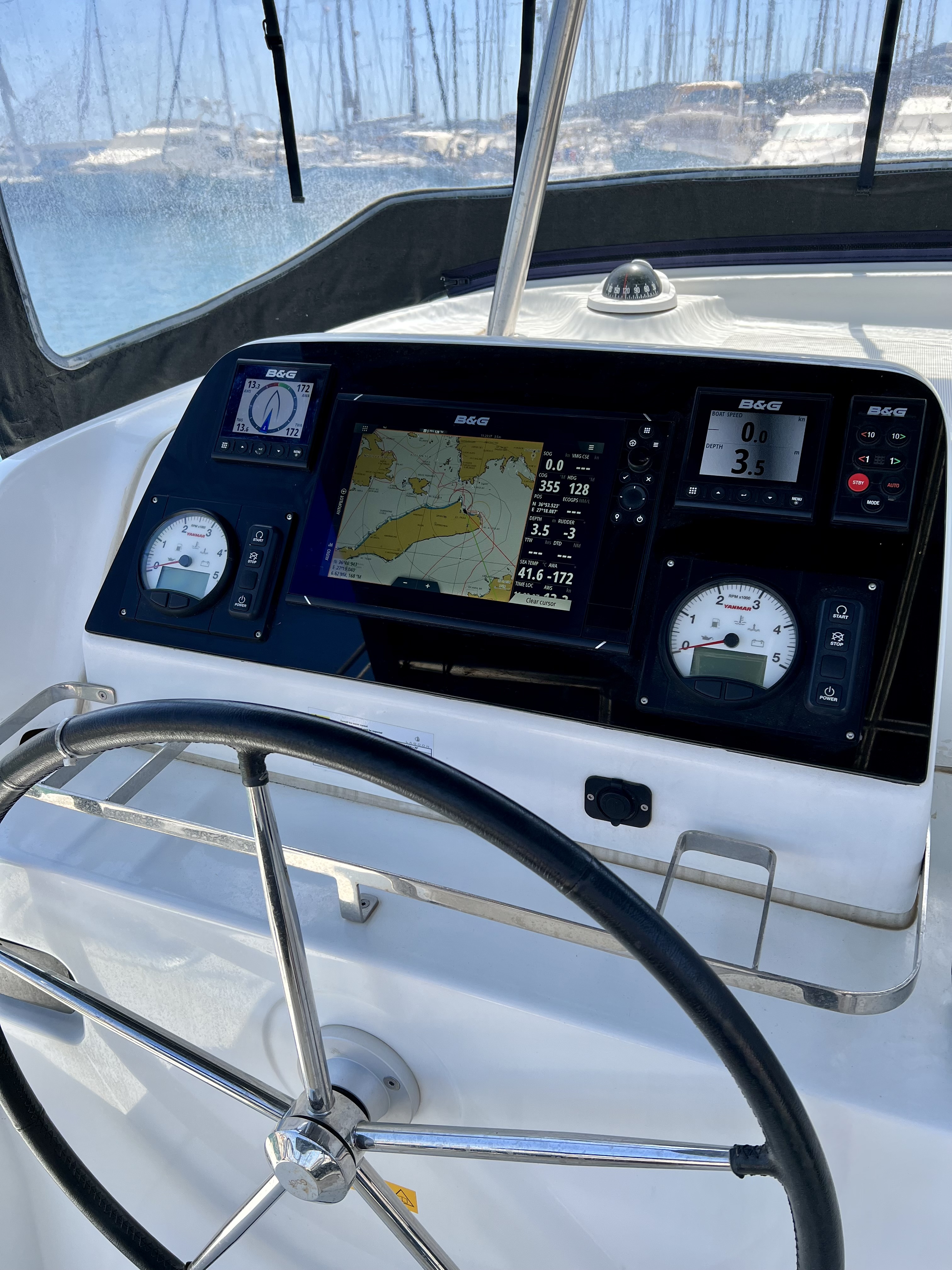 | Navigation | Echolot, GPS mit Kartenplotter im Cockpit, Hafenhandbücher, Seekarten, Sumlog, Windmesser |