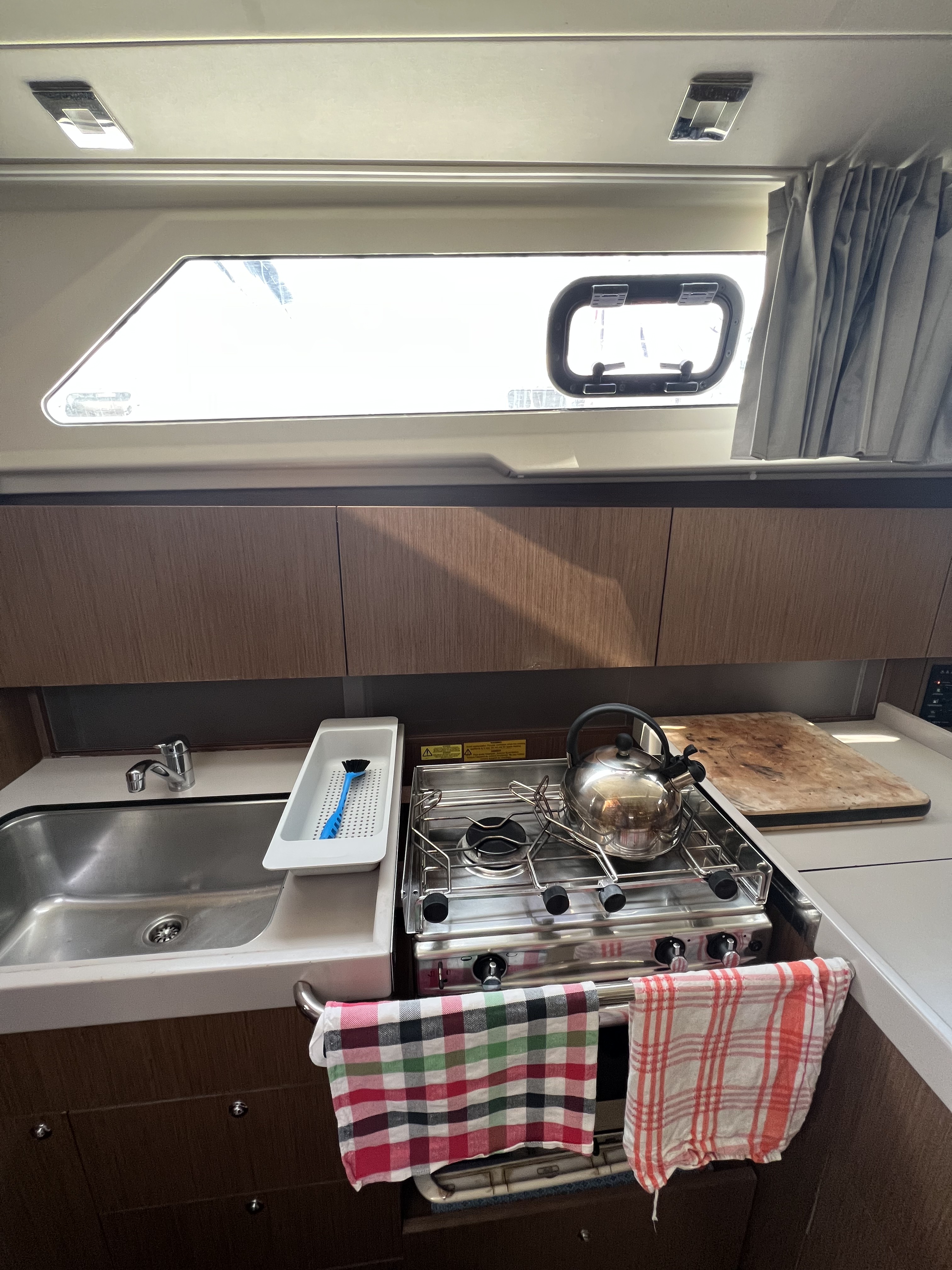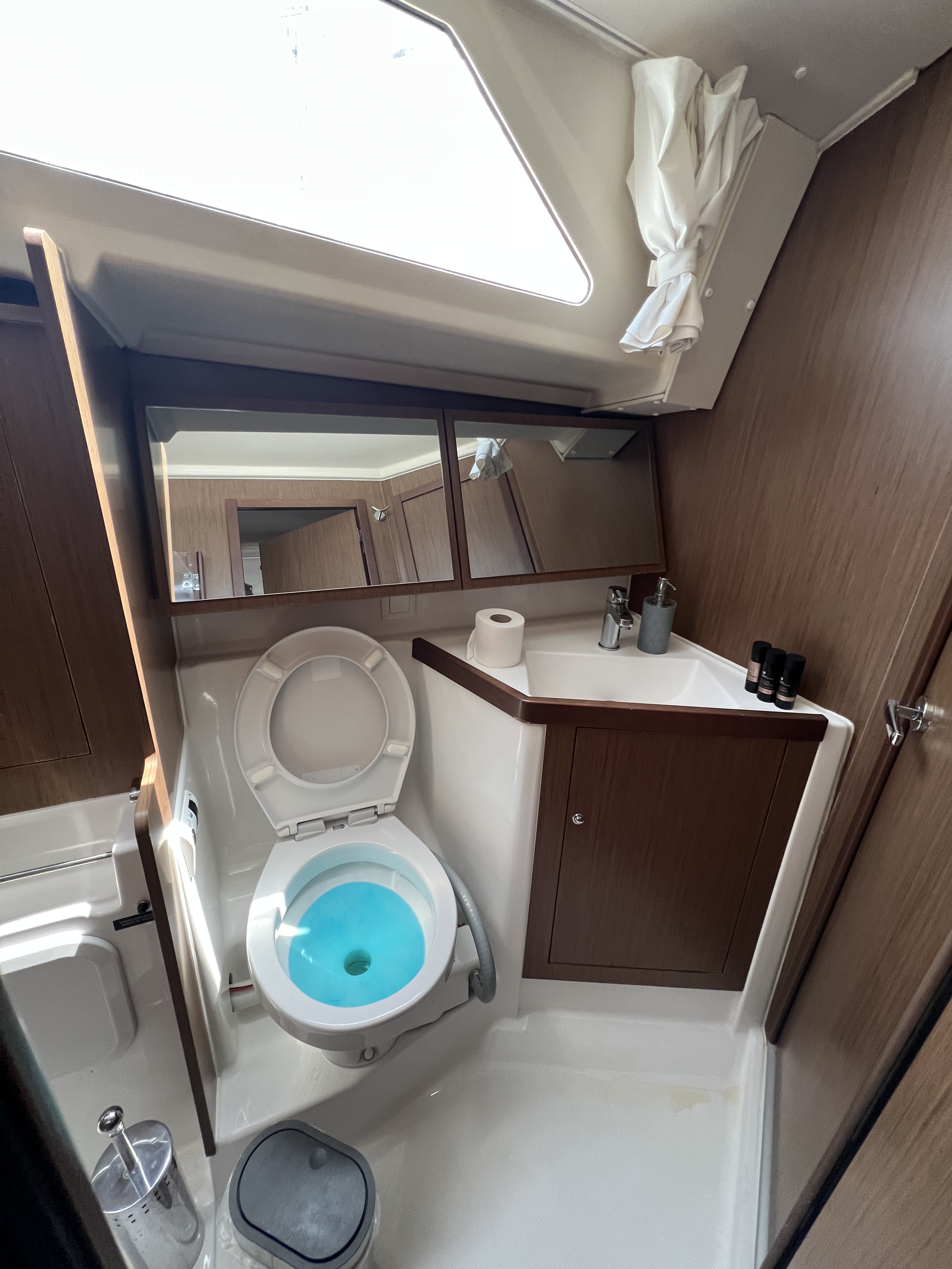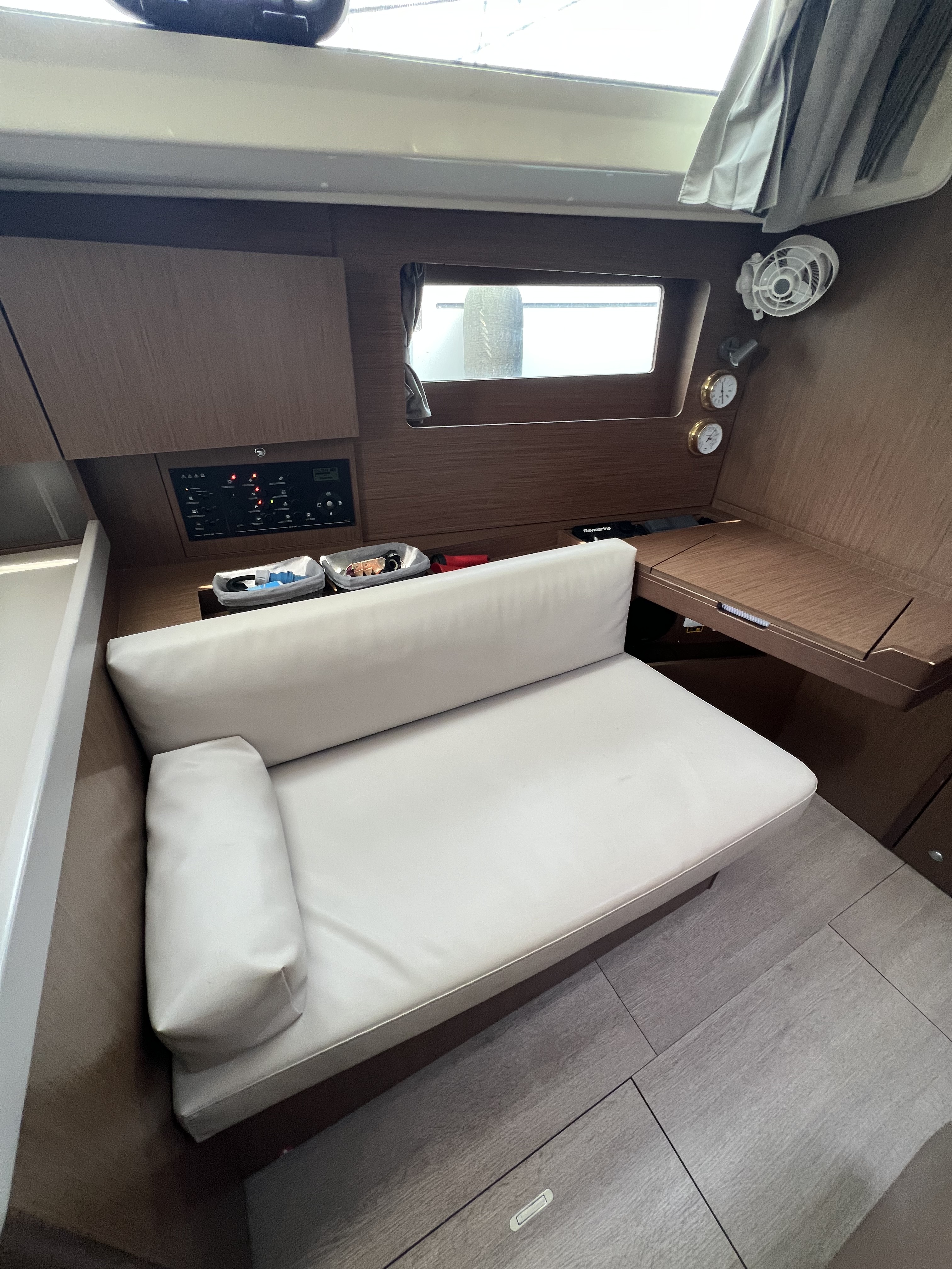 | Navigation | Echolot, GPS mit Kartenplotter im Cockpit, Hafenhandbücher, Seekarten, Sumlog, Windmesser |