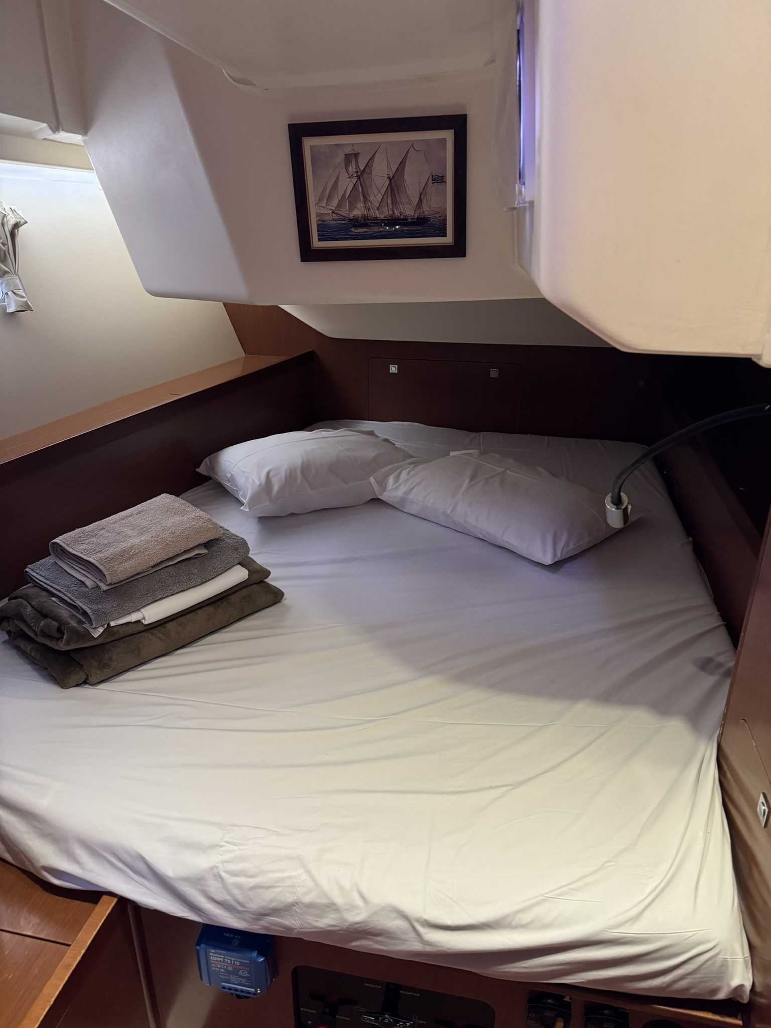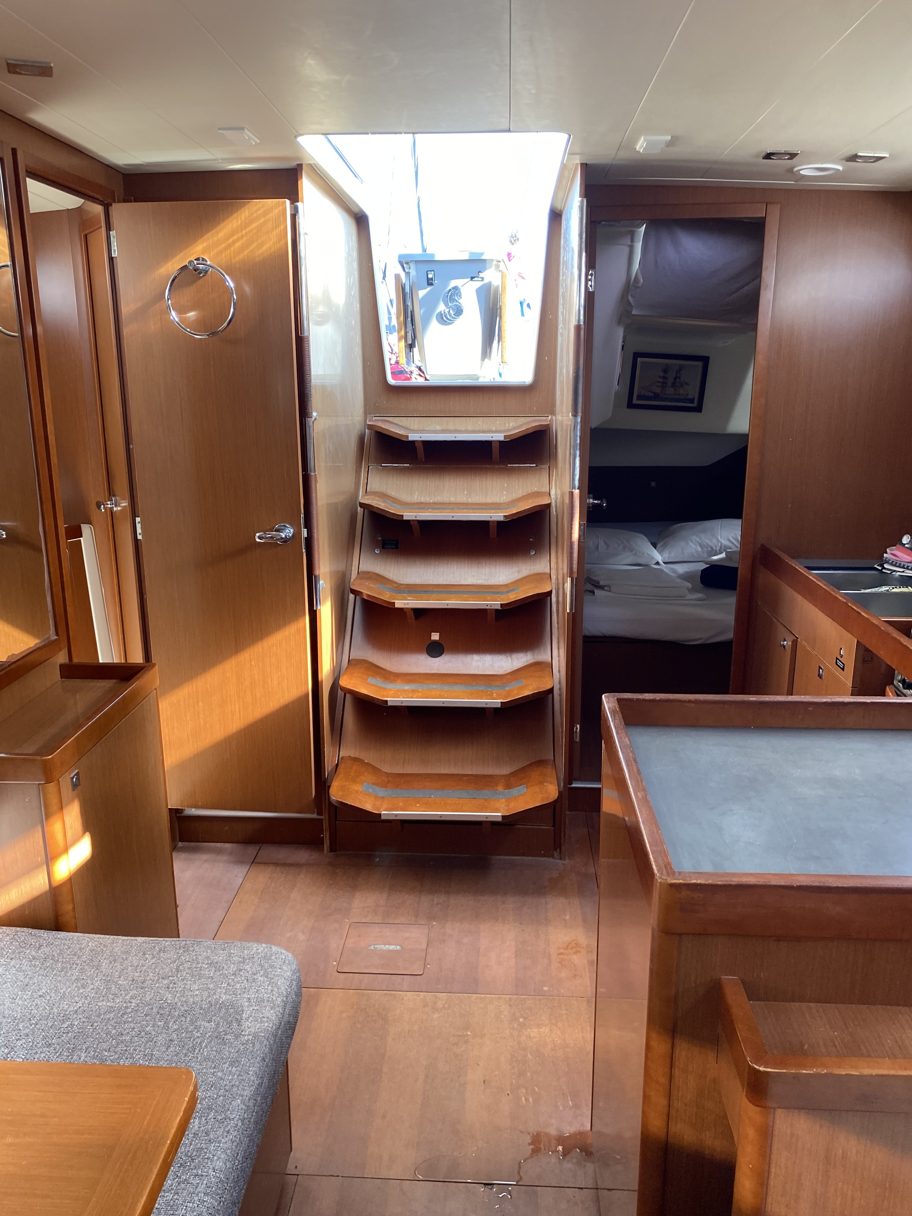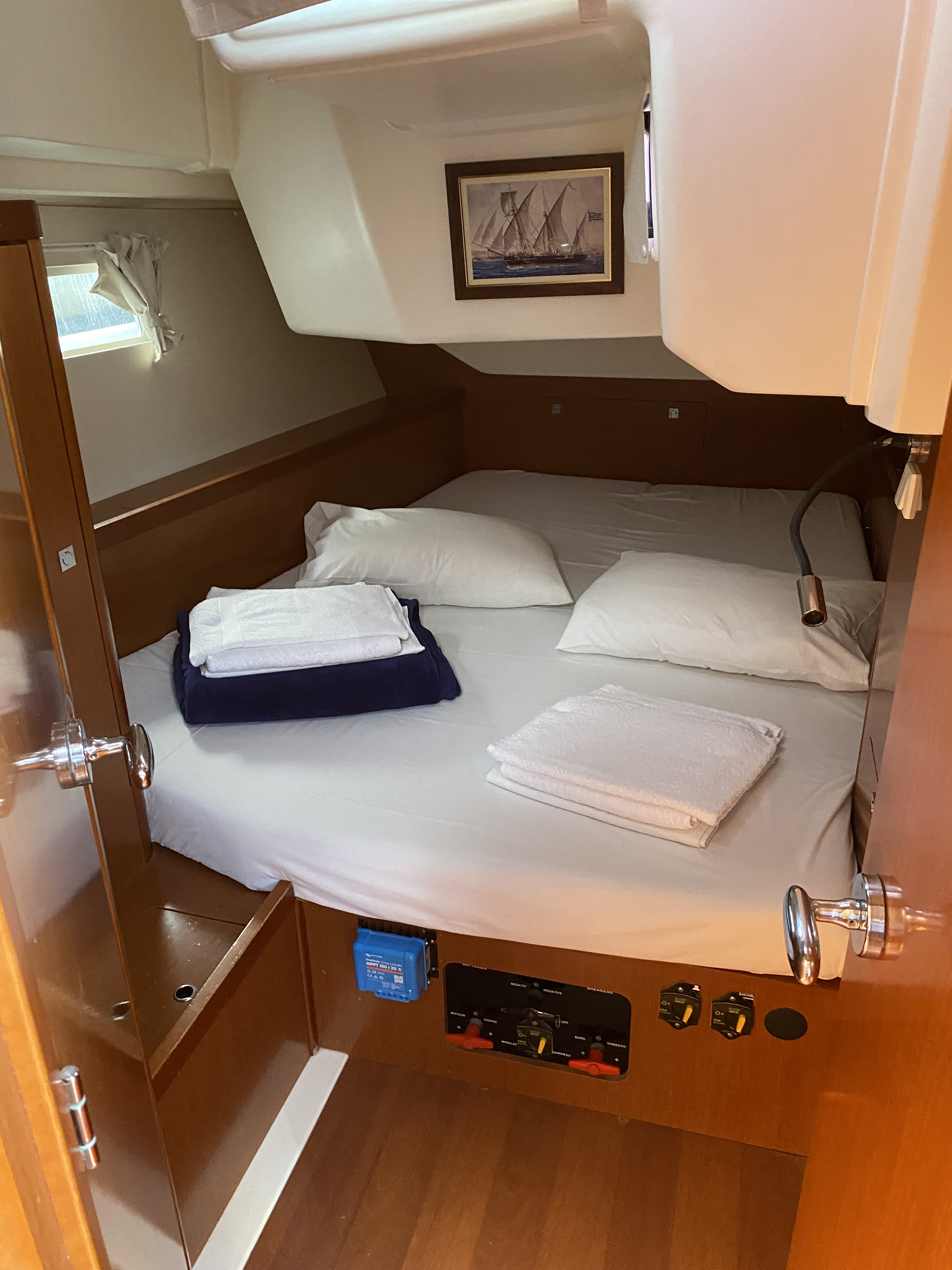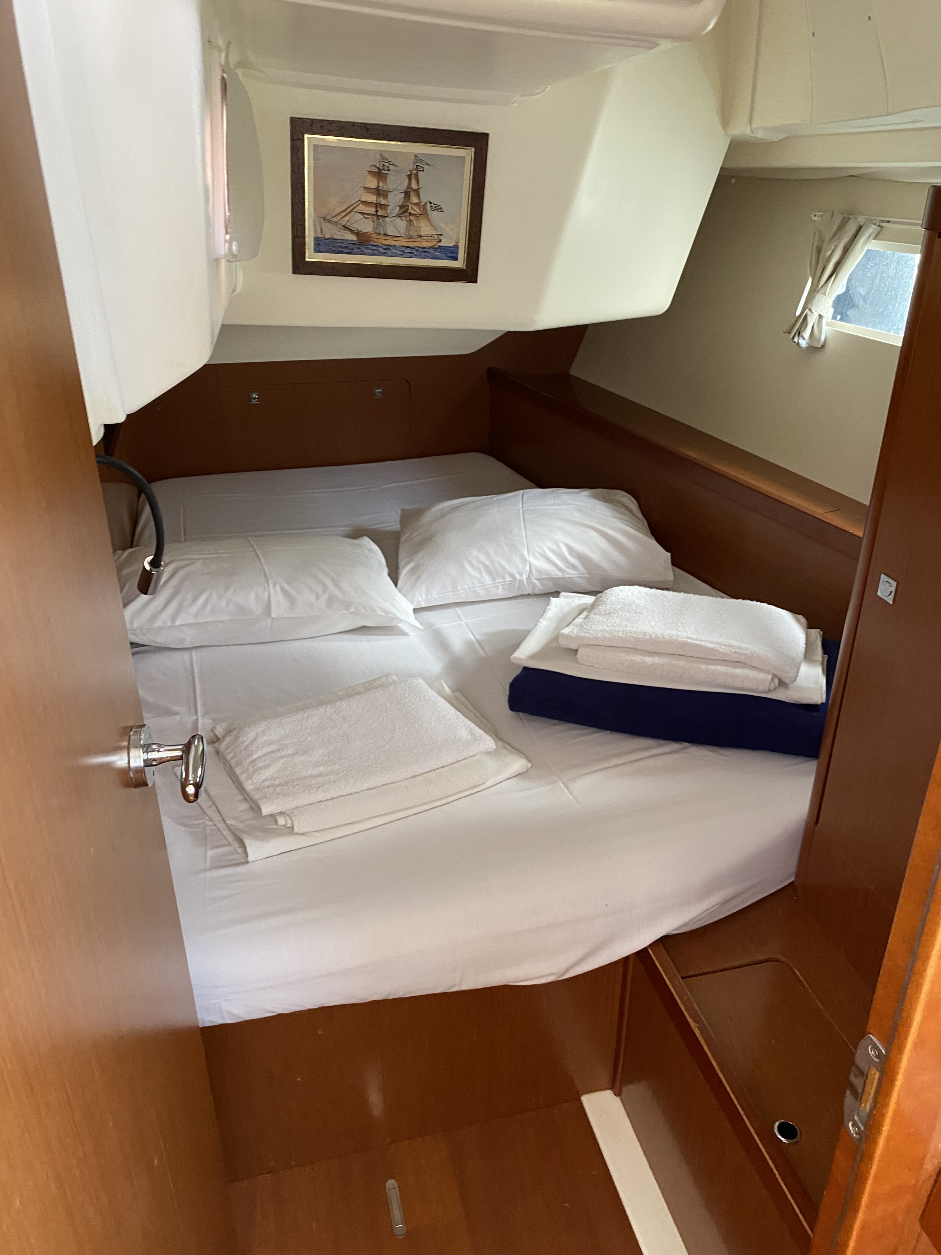 | Navigation | Barometer, Echolot, elektr. Seekarten, Fernglas, GPS mit Kartenplotter im Cockpit, Hafenhandbücher, Handpeilkompass, Seekarten, Sumlog, Tridata (Log, Echolot, Windm.), Windmesser |