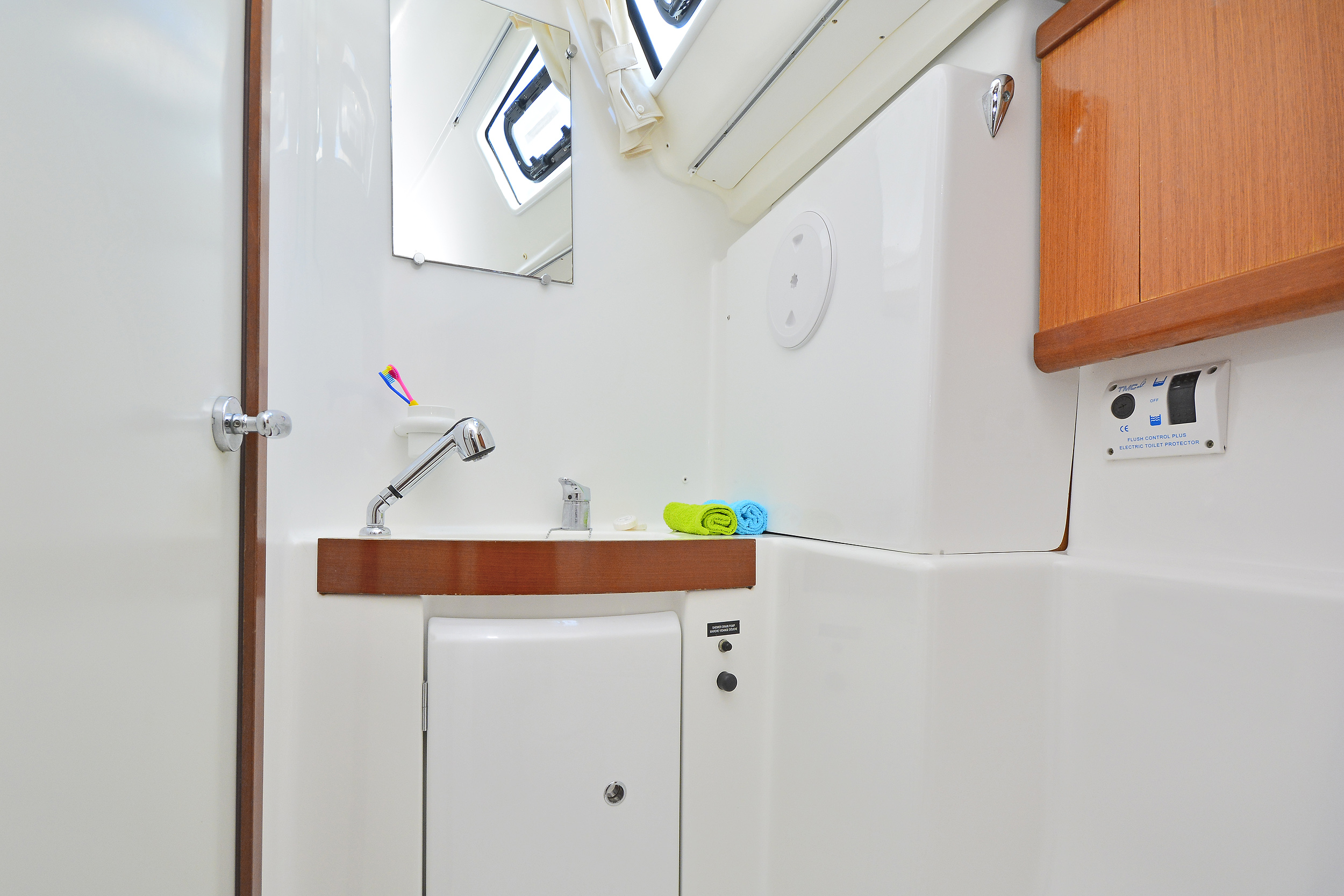 | Outside | 220 V-Landanschluss, Anker mit Kette, Badeleiter, Badeplattform, Biminitop, Bootshaken, Cockpitpolster, elektr. Ankerwinsch, Fender, Gangway, Schnorchelausrüstung, Solaranlage, Sprayhood, Wantenschneider, Wasserschlauch, Winschen |