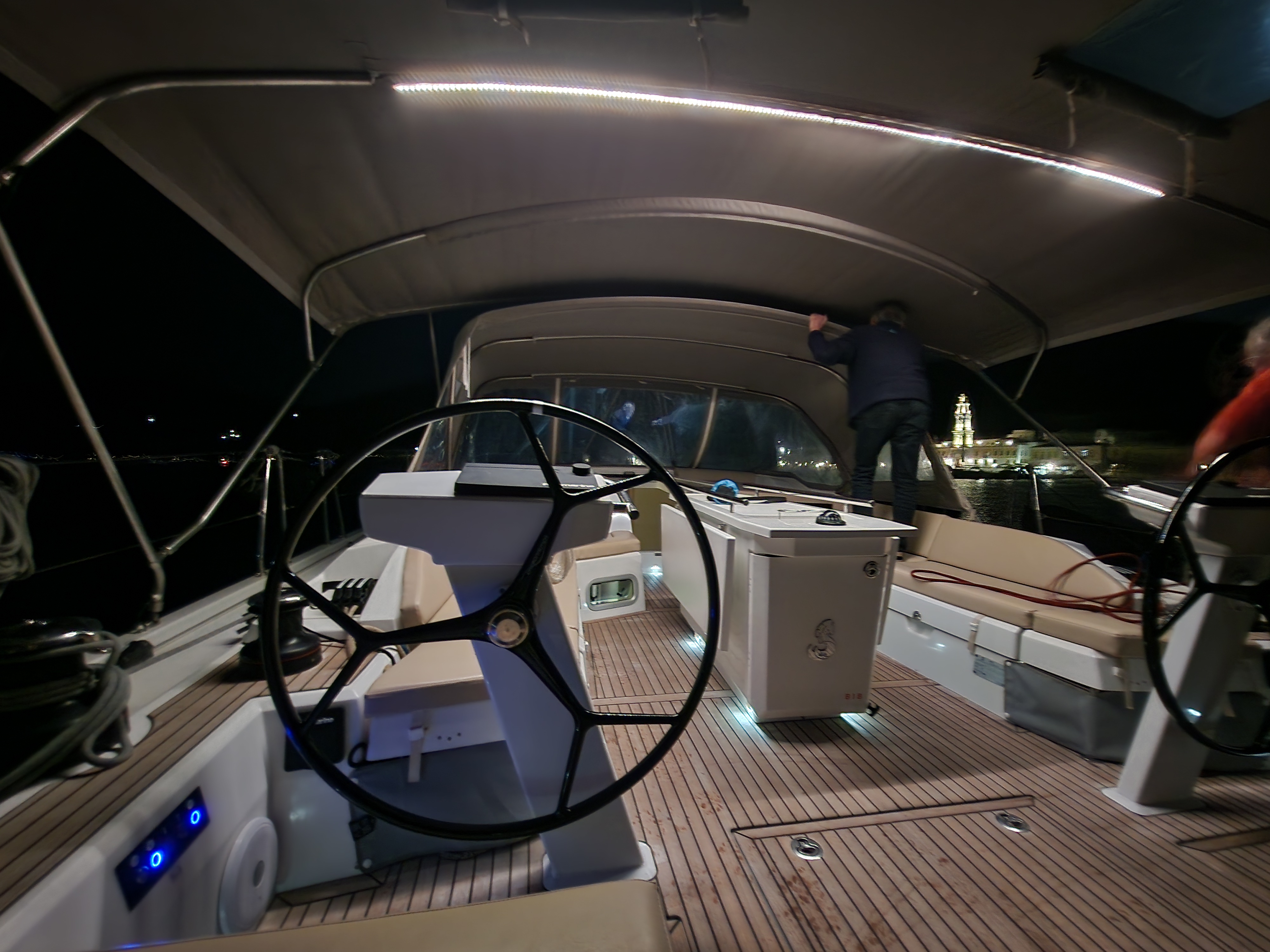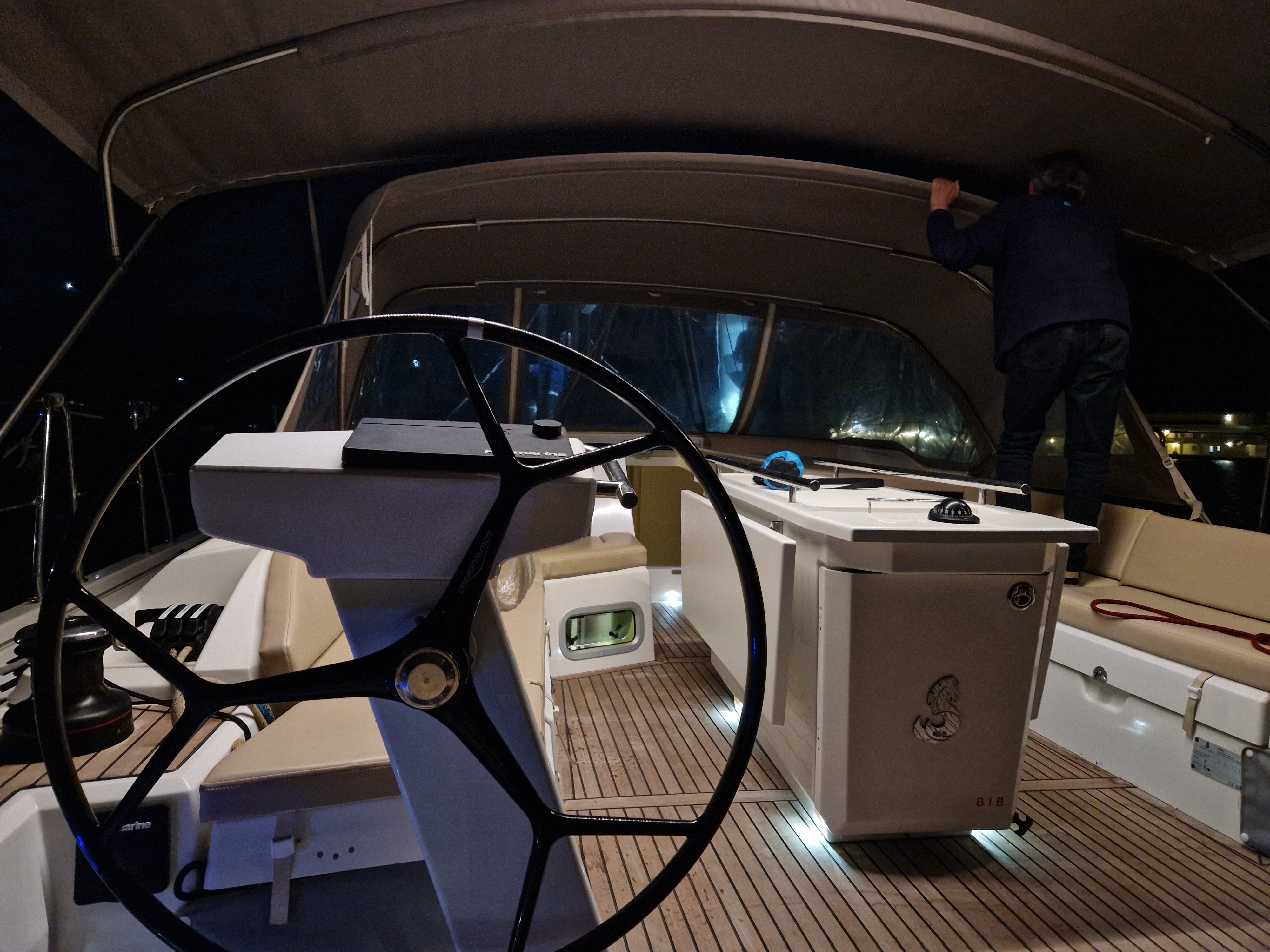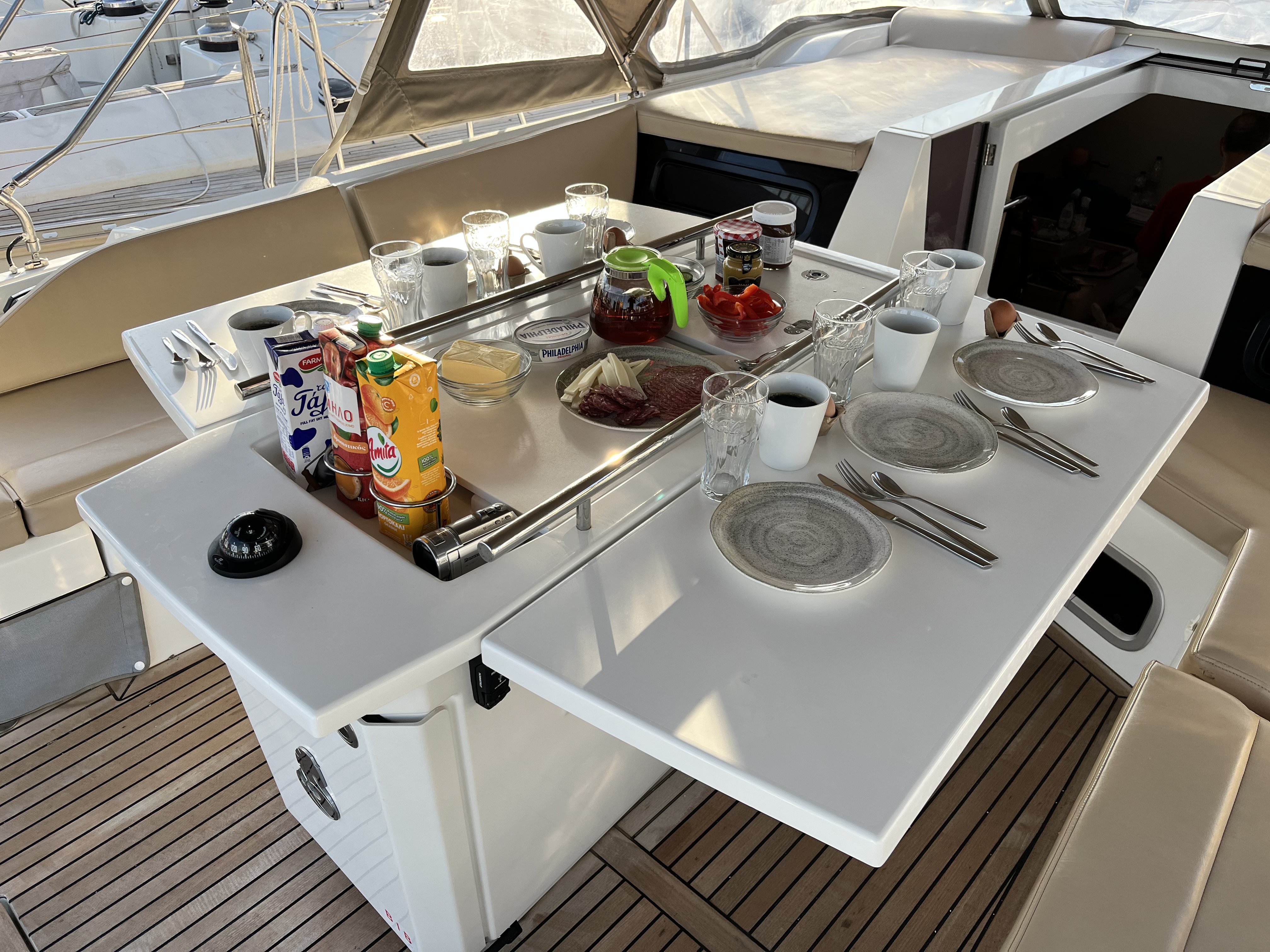 | Outside | Badeleiter, Biminitop, Cockpitdusche, Cockpitlautsprecher, Cockpitpolster, Cockpittisch, elektr. Ankerwinsch, Fender, Solaranlage, Sprayhood, Teak im Cockpit |