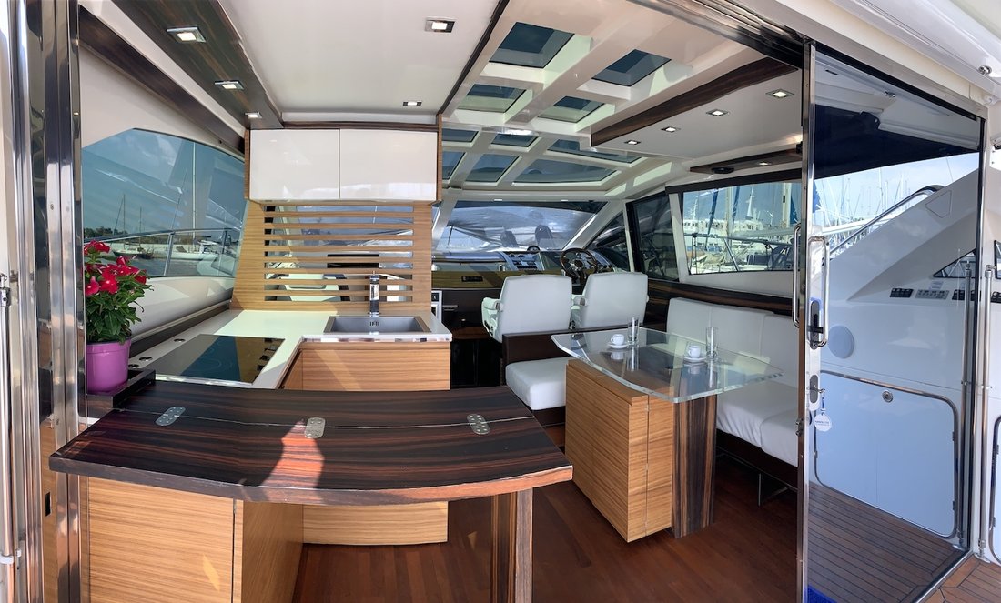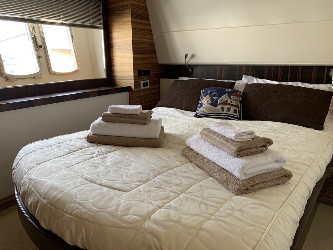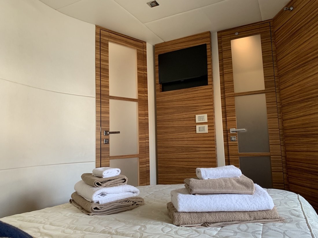 | Outside | 220 V-Landanschluss, Cockpitlautsprecher, elektr. Ankerwinsch, Fender, Festmacherleinen, hydraul. Gangway |