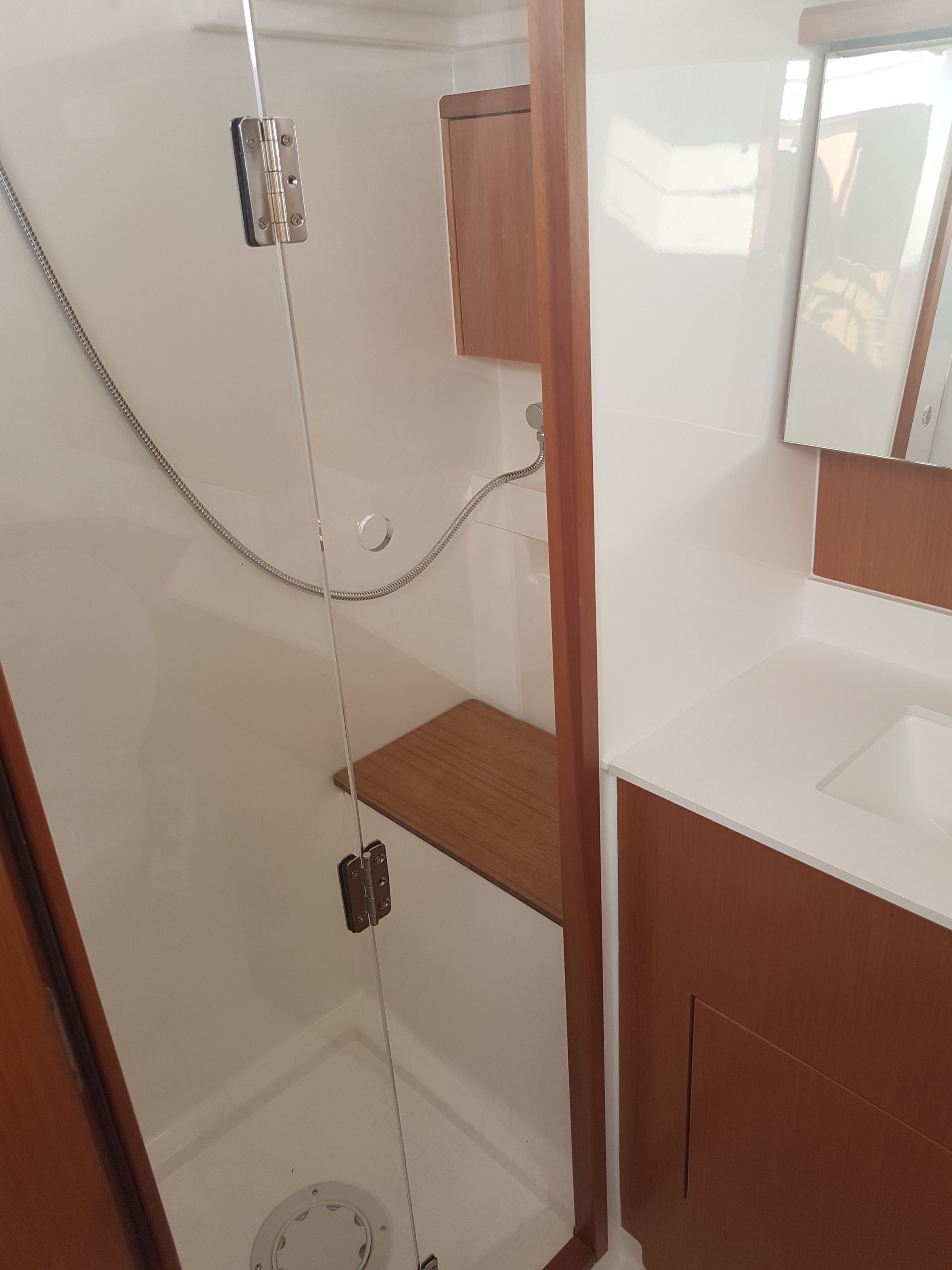 | Outside | 220 V-Landanschluss, Anker mit Kette, Badeleiter, Badeplattform (hydr.), Biminitop, Bootshaken, Cockpitlautsprecher, Cockpitleuchte, Cockpitpolster, Cockpittisch, Deckbürste, Fender, Festmacherleinen, Gangway, Kunststoff-Eimer (Pütz), Segel-Flickwerkzeug, Solaranlage, Sprayhood, Treibanker, Wantenschneider, Wasserschlauch, Winschen |