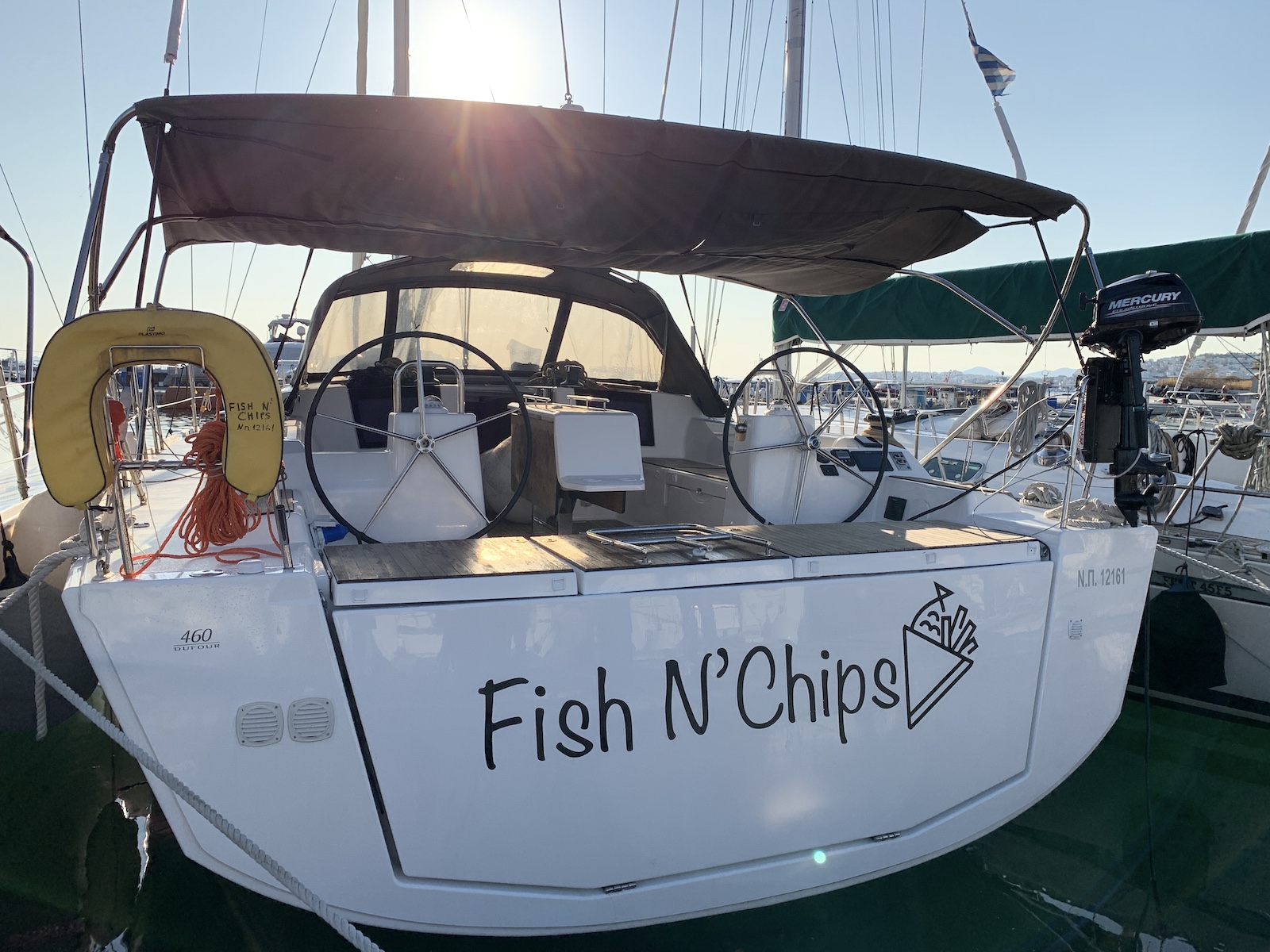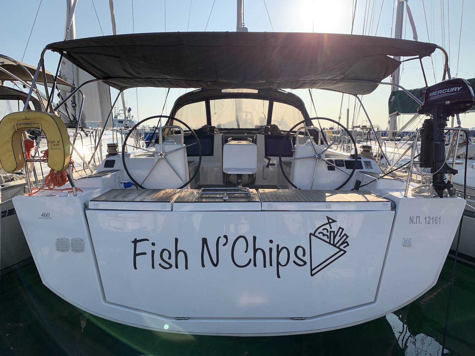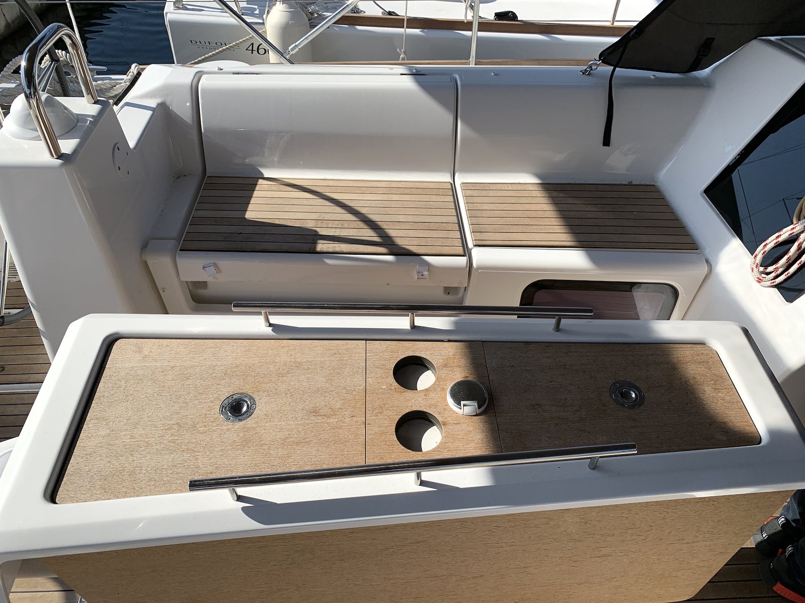 | Outside | Anker mit Kette, Ankerkettenzähler, Badeleiter, Badeplattform, Biminitop, Cockpitdusche warm/kalt, Cockpitkühlschrank, Cockpitlautsprecher, Cockpitpolster, Cockpittisch, Delta-Anker, elektr. Ankerwinsch, Fender, Festmacherleinen, Gas-Barbecue-Grill im Cockpit, Schnorchelausrüstung, Solaranlage, Sprayhood, Teak im Cockpit, Windex, Winschen |