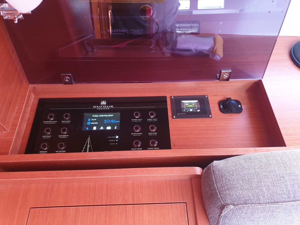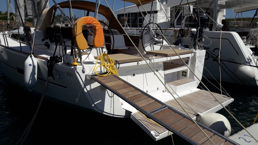 | Inside | Inverter 12V/220V, Kühlschrank, Ladegerät, Luftpumpe für Beiboot, Pantryausstattung, Radio mit CD, AUX und USB, Ventilatoren in Kabinen, Warmwasser, Watermaker, WC (elektr.) |