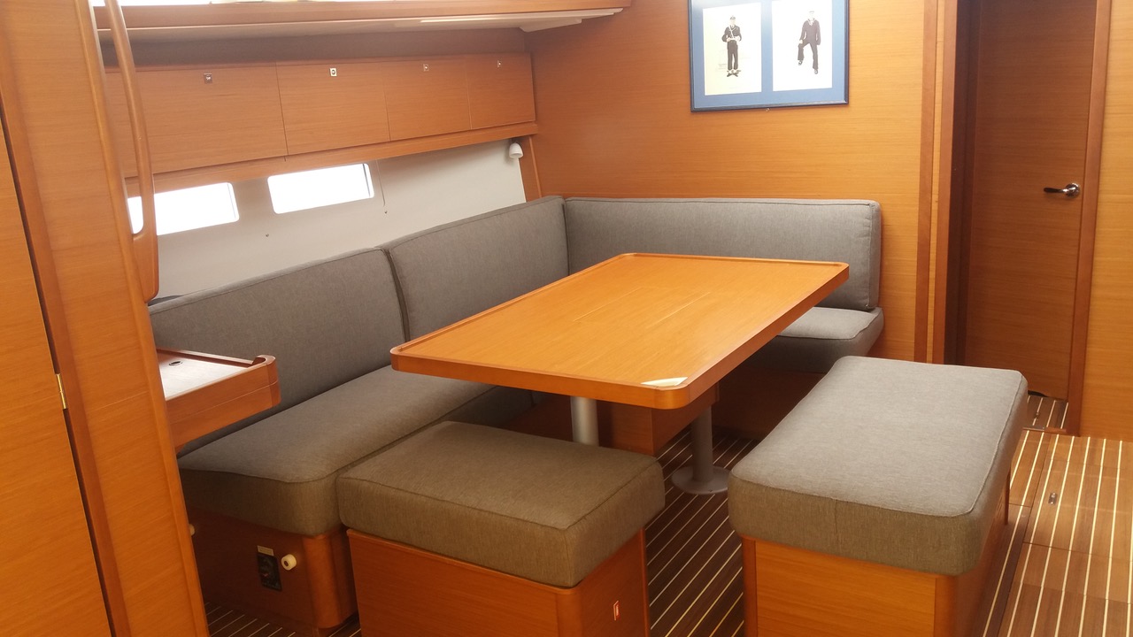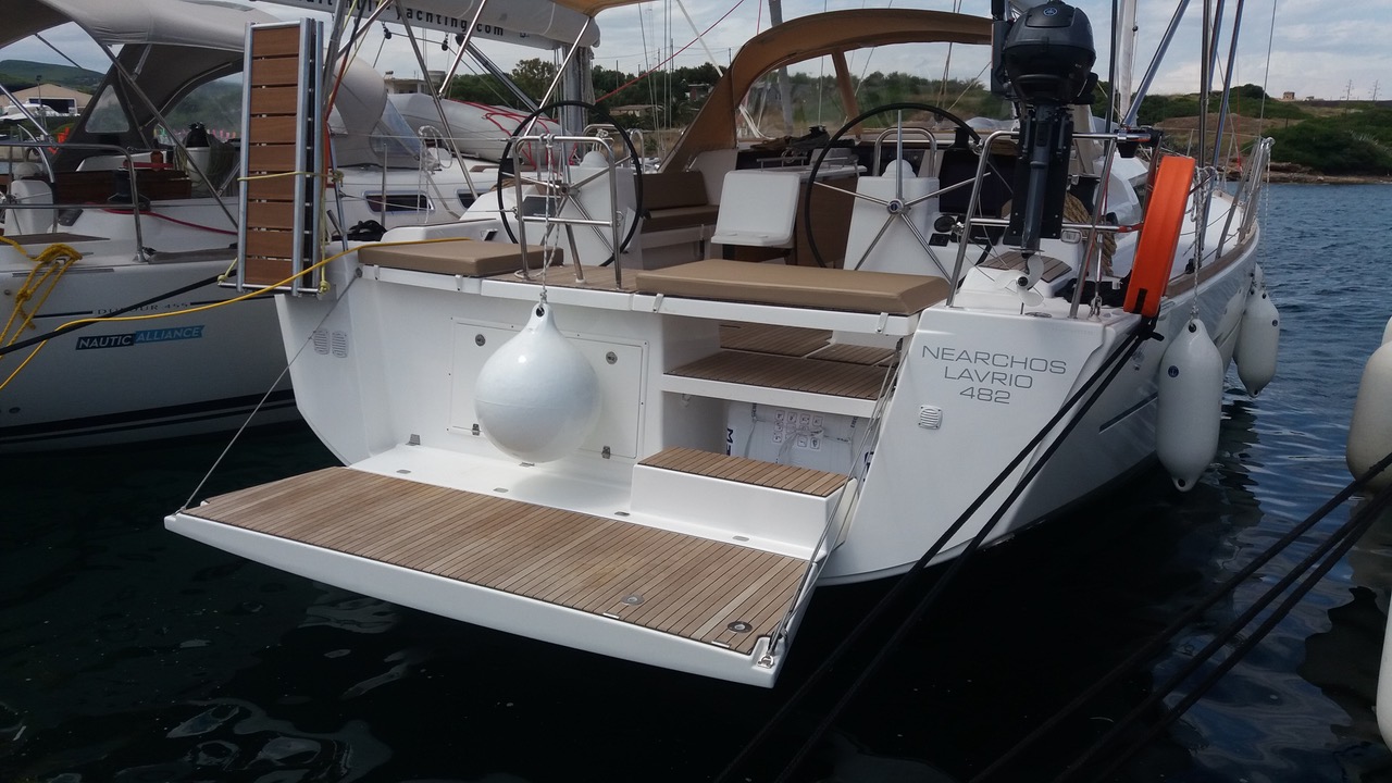 | Outside | 220 V-Landanschluss, Anker mit Kette, Badeplattform, Biminitop, Bootshaken, Cockpitlautsprecher, Cockpitpolster, Cockpittisch, Dieselkanister , Fender, Festmacherleinen, Kunststoff-Eimer (Pütz), Solaranlage, Sprayhood, Teak im Cockpit, Wantenschneider, Wasserschlauch, Windex |