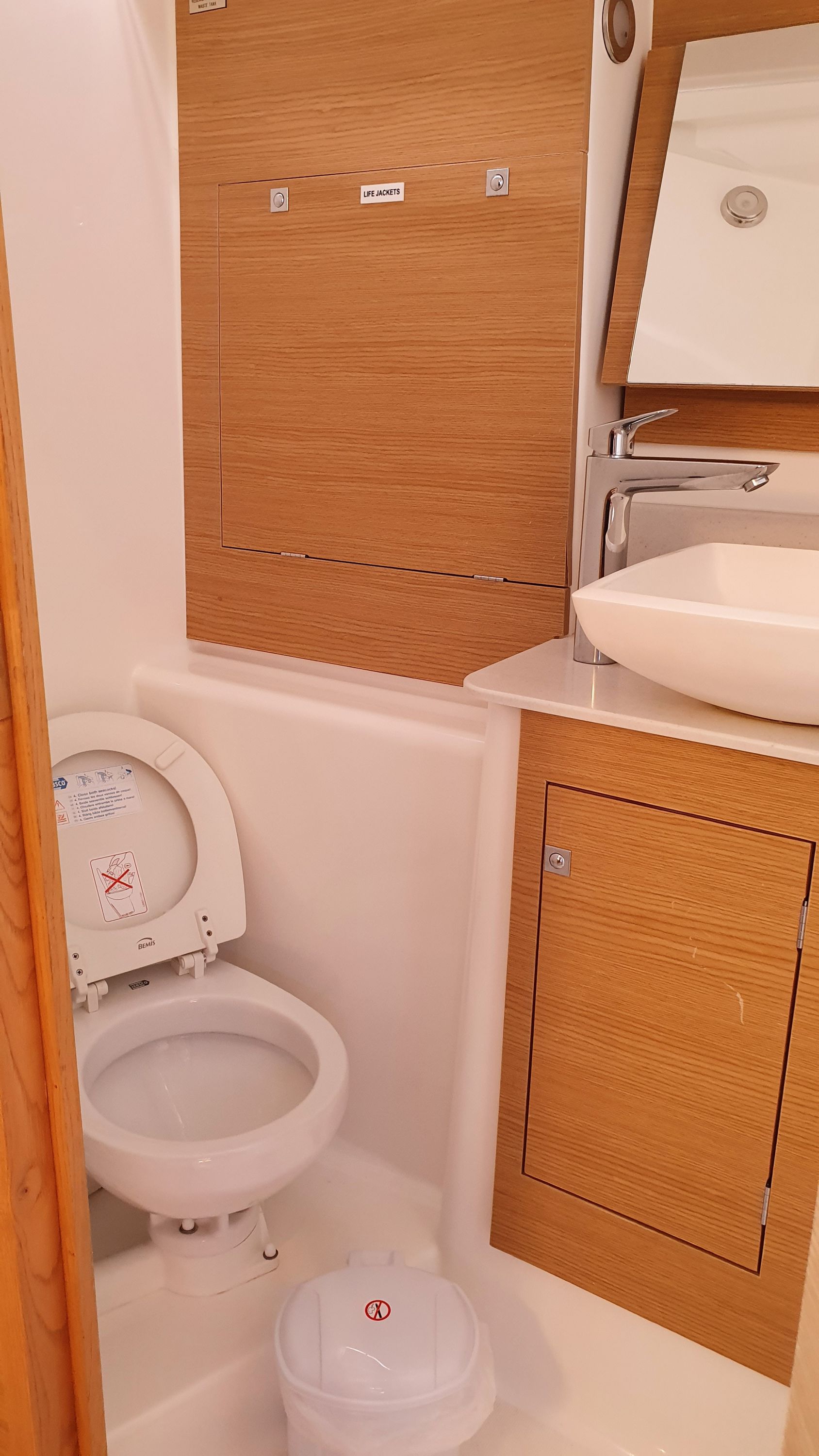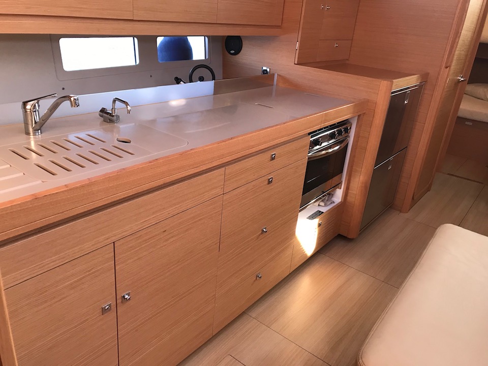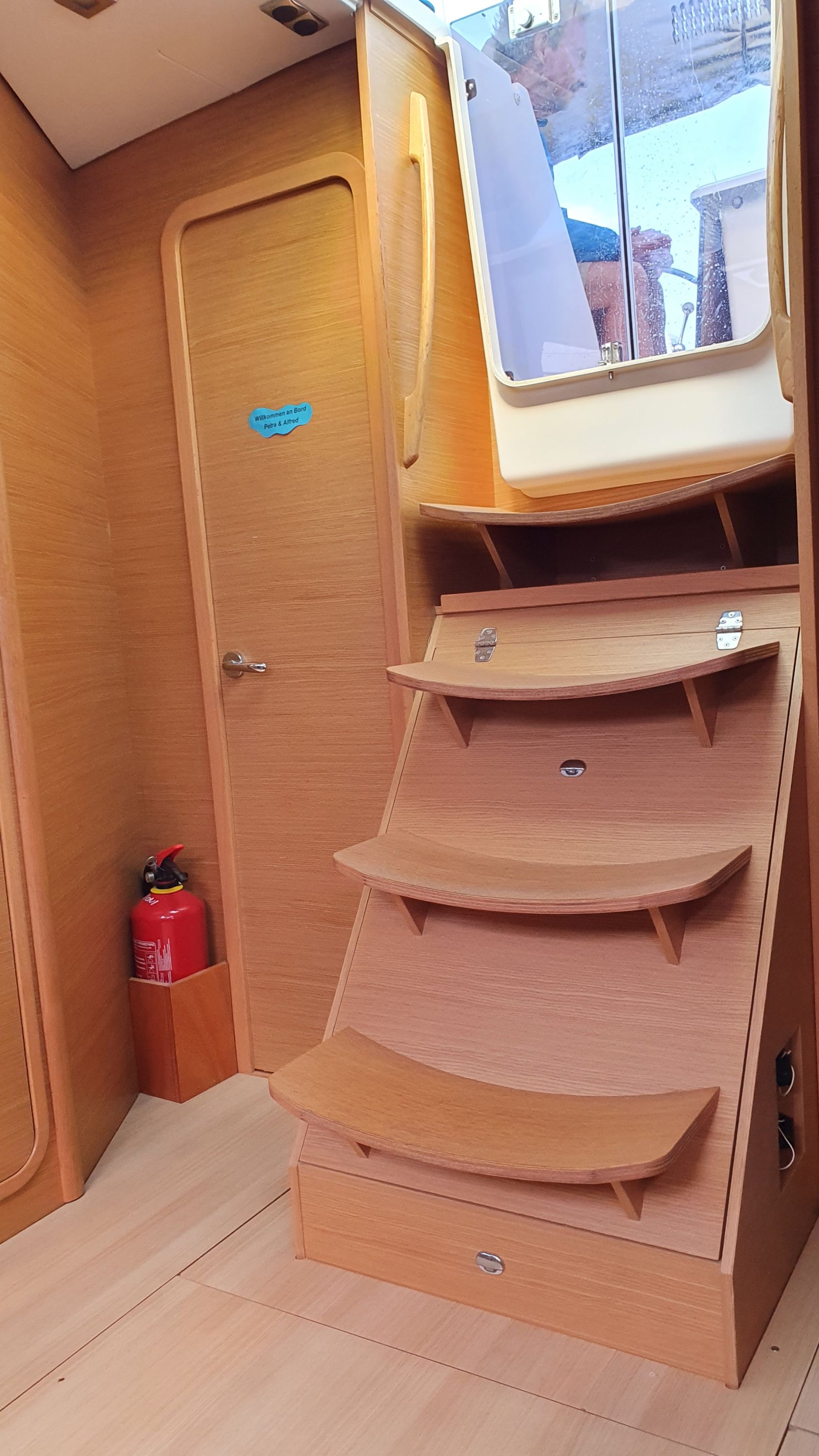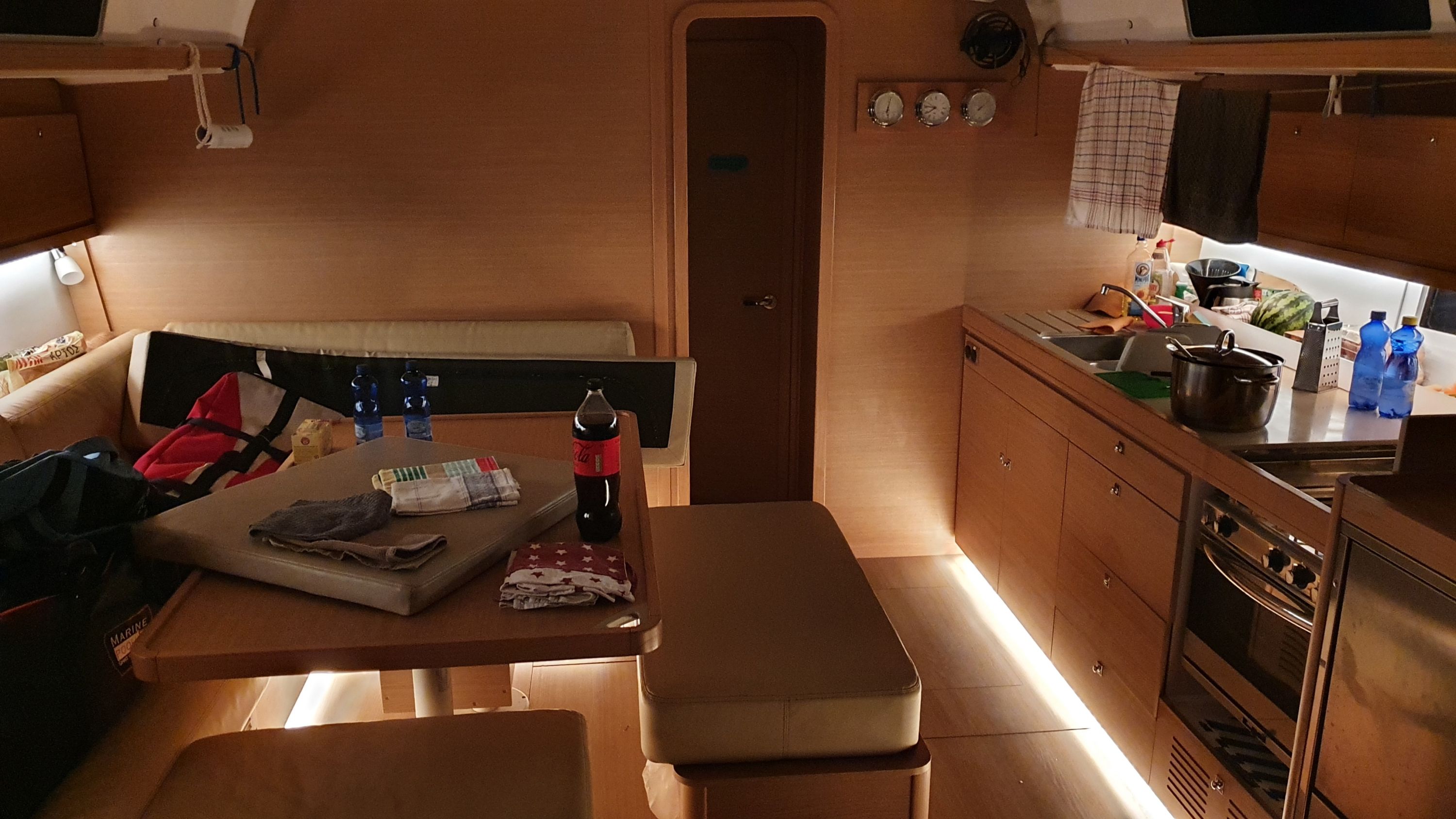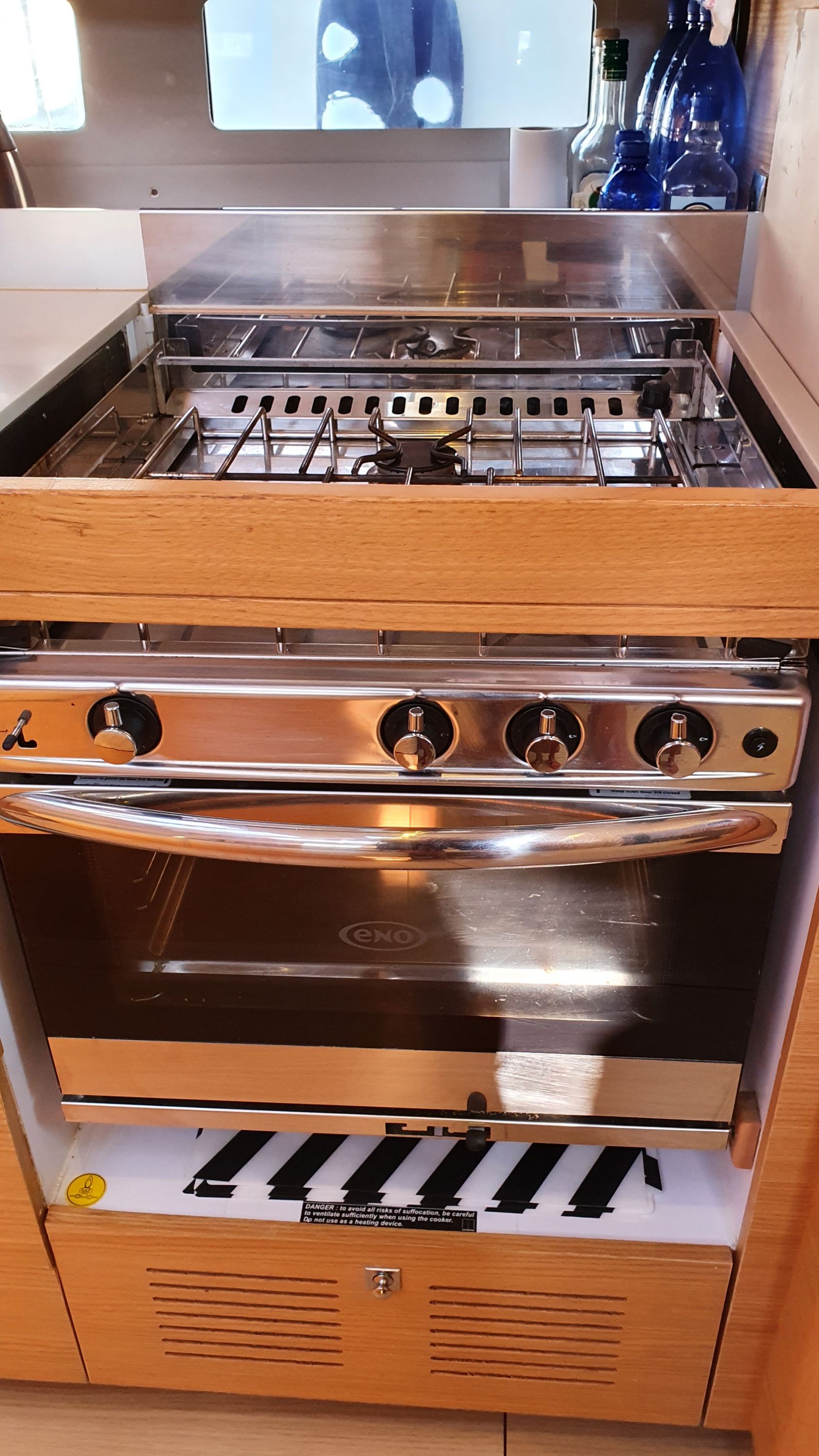| Inside | 12V/220V-Steckdosen, 220V Steckdosen, Gasherd mit Backofen, Generator, Inverter 12V/220V, Klimaanlage (ohne Landstrombedarf), Kühlschrank, Lautsprecher im Salon, LED-Innenleuchten, Moskitonetze, Radio mit USB, Salontisch absenkbar, Spülbecken, USB Steckdosen in den Kabinen, Ventilatoren in Salon und Kabinen, Warmwasser, Weinkühlschrank |