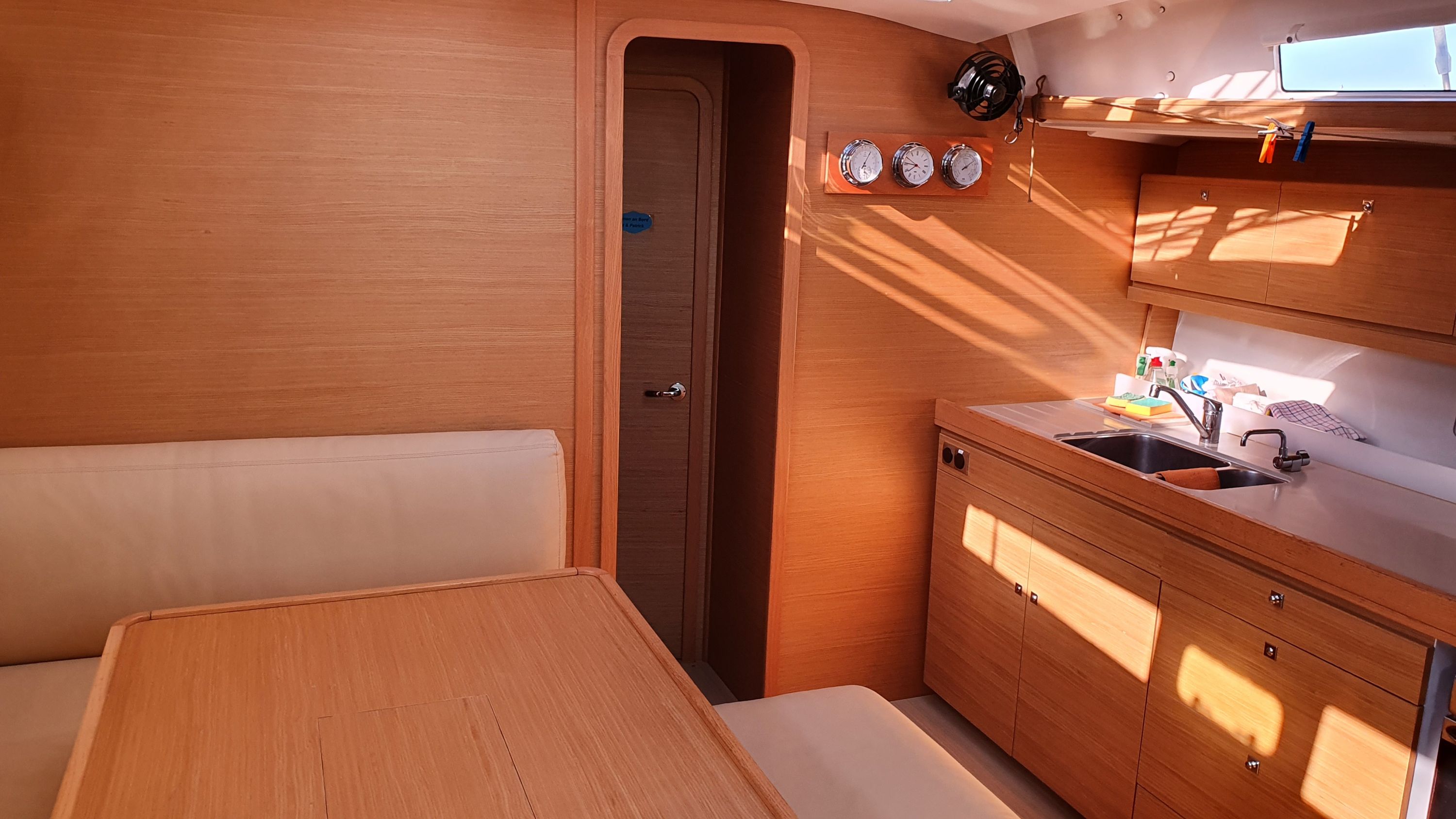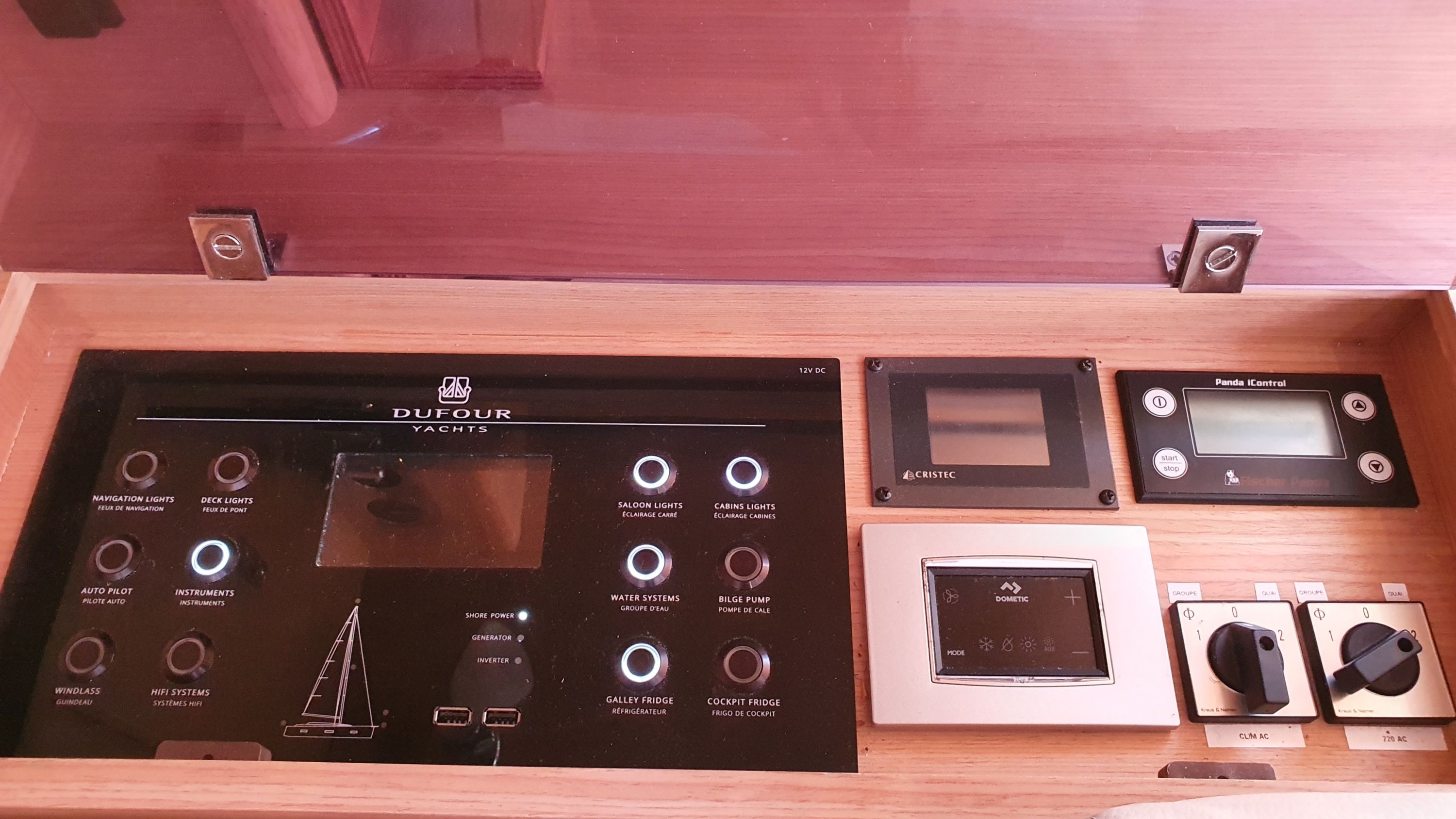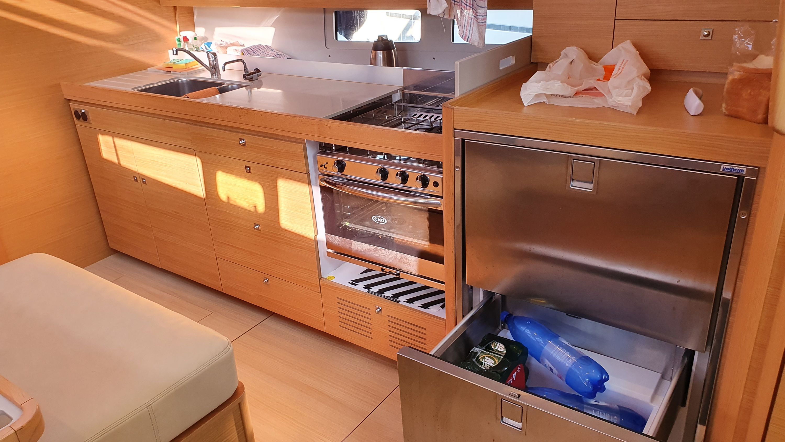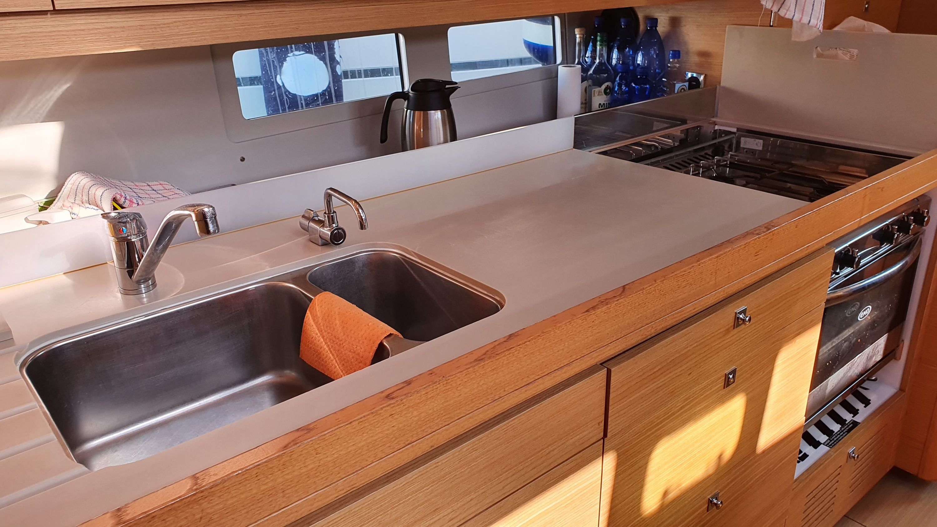 | Inside | 12V/220V-Steckdosen, 220V Steckdosen, Gasherd mit Backofen, Generator, Inverter 12V/220V, Klimaanlage (ohne Landstrombedarf), Kühlschrank, Lautsprecher im Salon, LED-Innenleuchten, Moskitonetze, Radio mit USB, Salontisch absenkbar, Spülbecken, USB Steckdosen in den Kabinen, Ventilatoren in Salon und Kabinen, Warmwasser, Weinkühlschrank |
