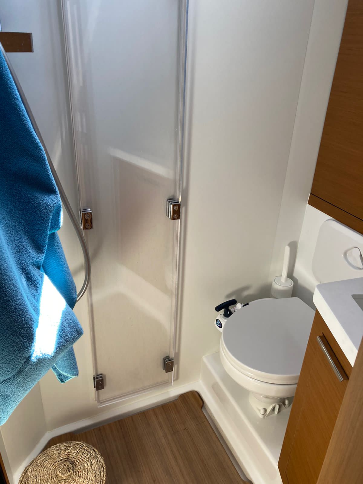| Outside | Badeplattform elektr., Biminitop, Cockpitdusche, Cockpitlautsprecher, elektr. Ankerwinsch, elektr. Winsch, Gangway, Sprayhood, Teak im Cockpit |