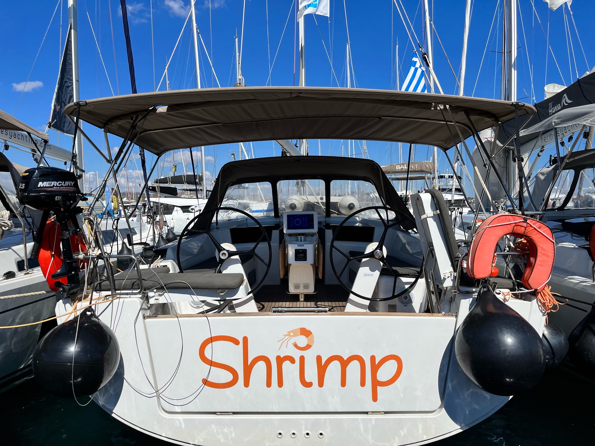 | Outside | Anker mit Kette, Badeleiter, Badeplattform, Biminitop, Cockpitdusche warm/kalt, Cockpitkühlschrank, Cockpitlautsprecher, Cockpitpolster, elektr. Ankerwinsch, Fender, Festmacherleinen, Schnorchelausrüstung, Solaranlage, Sprayhood, Teak im Cockpit, Windex, Winschen |