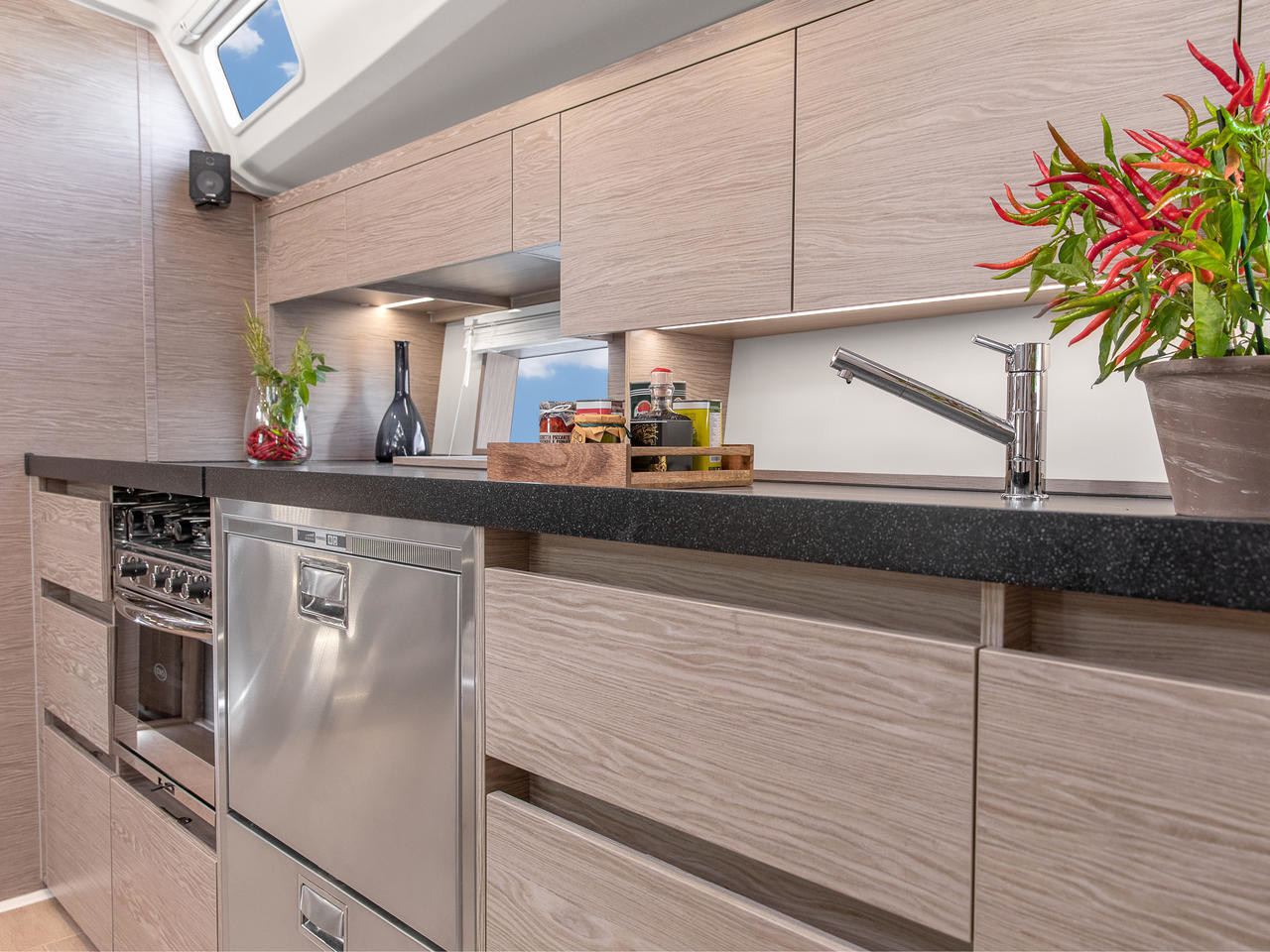 12V/220V-Steckdosen, 220V Steckdosen, Fäkalientank, Frischwasserpumpe, Gasherd mit Backofen, Gefrierschrank, Kühlschrank, Landstromkabel, Moskitonetze, Pantryausstattung, Salontisch absenkbar, USB Steckdose, USB Steckdosen in den Kabinen, Ventilatoren in Kabinen, Warmwasser, Weinschrank |