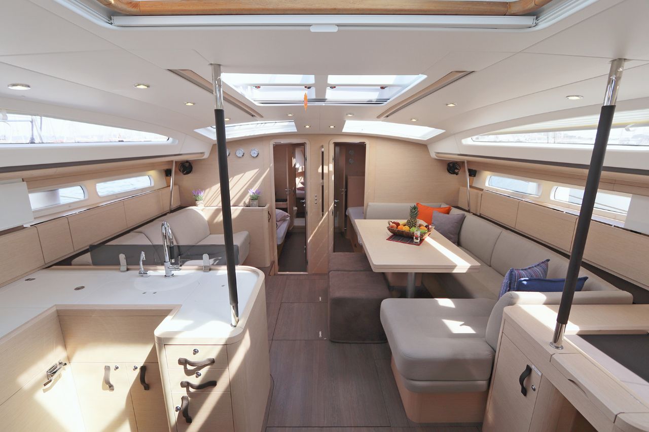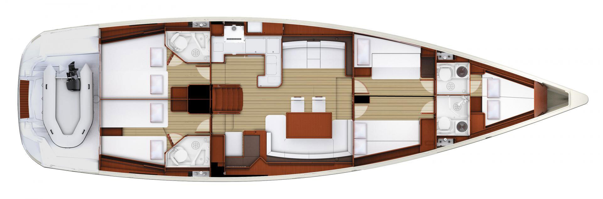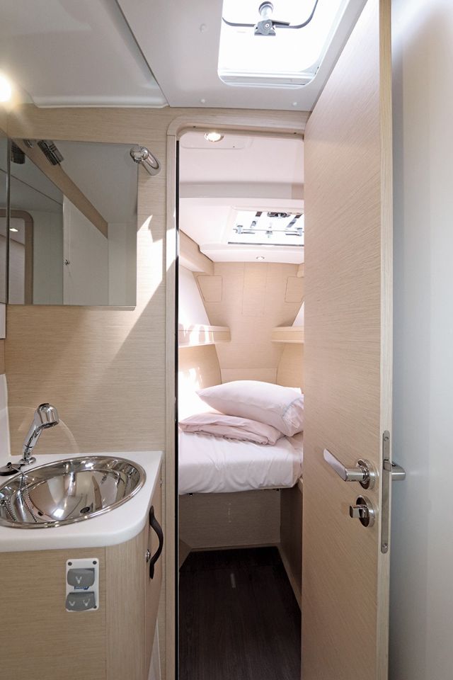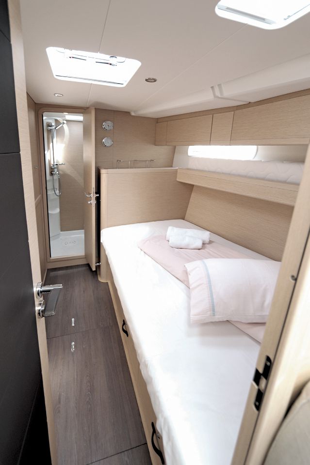 Die Mittschiff-Kabine auf der Backbordseite hat zwei Kojen nebeneinander und optional eine weitere Koje darüber (klappbar). Die Kabine im Bug ist entweder von außen erreichbar oder als Durchgang über die Mittschiff-Kabine backbord.