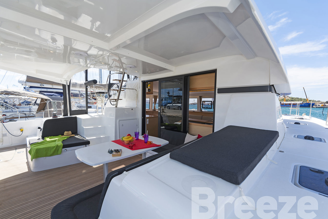 | Outside | Anker mit Kette, Badeleiter, Biminitop, Cockpitdusche, Cockpitpolster, Cockpittisch, elektr. Ankerwinsch, elektr. Winsch, Fender, Gangway, Solaranlage, Sprayhood, Teak im Cockpit, Wantenschneider |