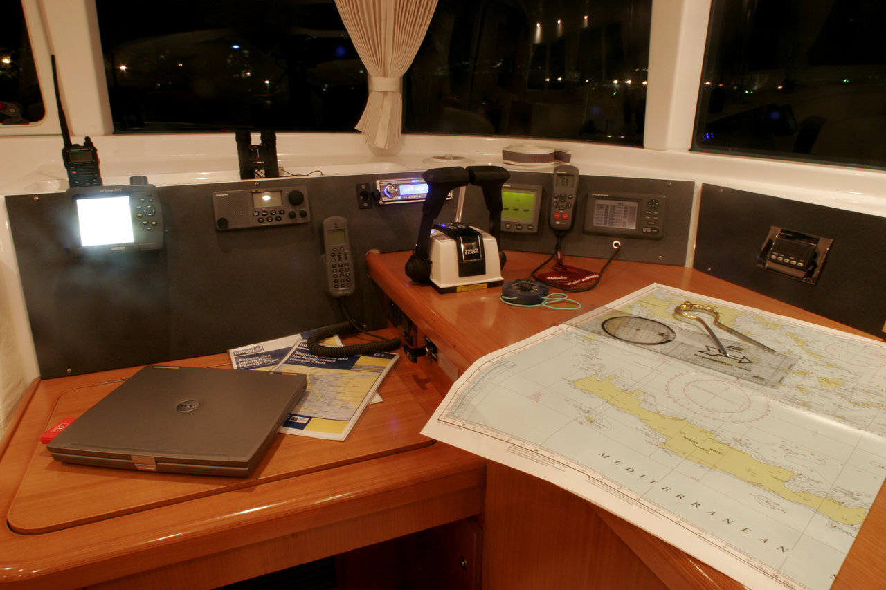 | Navigation | Barometer, Fernglas, GPS mit Kartenplotter im Cockpit, Handpeilkompass, Kompass, Navigationsbesteck, Radar, Seekarten, Tridata (Log, Echolot, Windm.) |