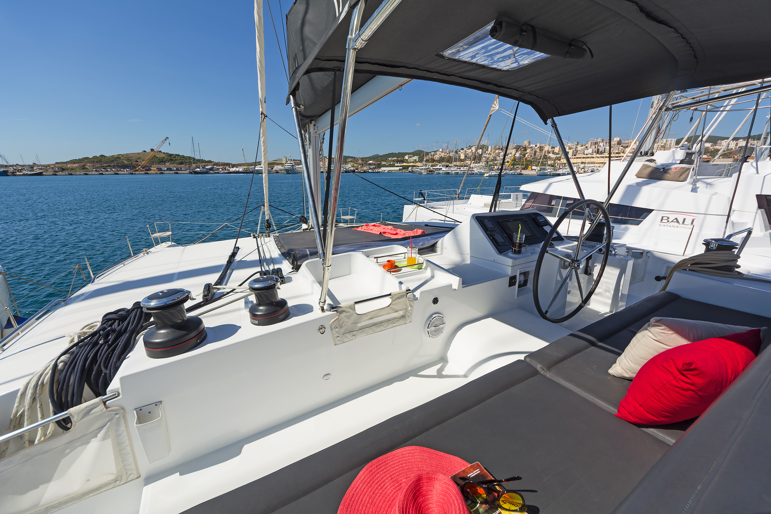 | Outside | 220 V-Landanschluss, Anker mit Kette, Badeleiter, Biminitop, Bootshaken, Cockpitpolster, Cockpittisch, Delta-Anker, elektr. Ankerwinsch, Fender, Flybridge, Gangway, hydraul. Gangway, Schnorchelausrüstung, Solaranlage, Sprayhood, Wantenschneider, Wasserschlauch, Winschen |