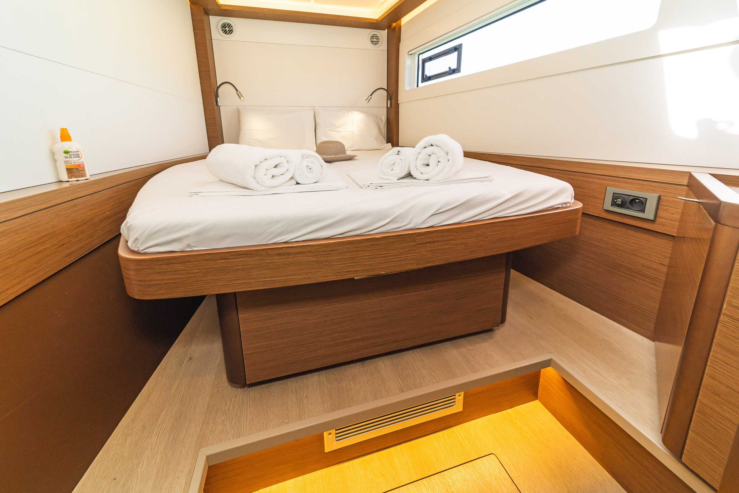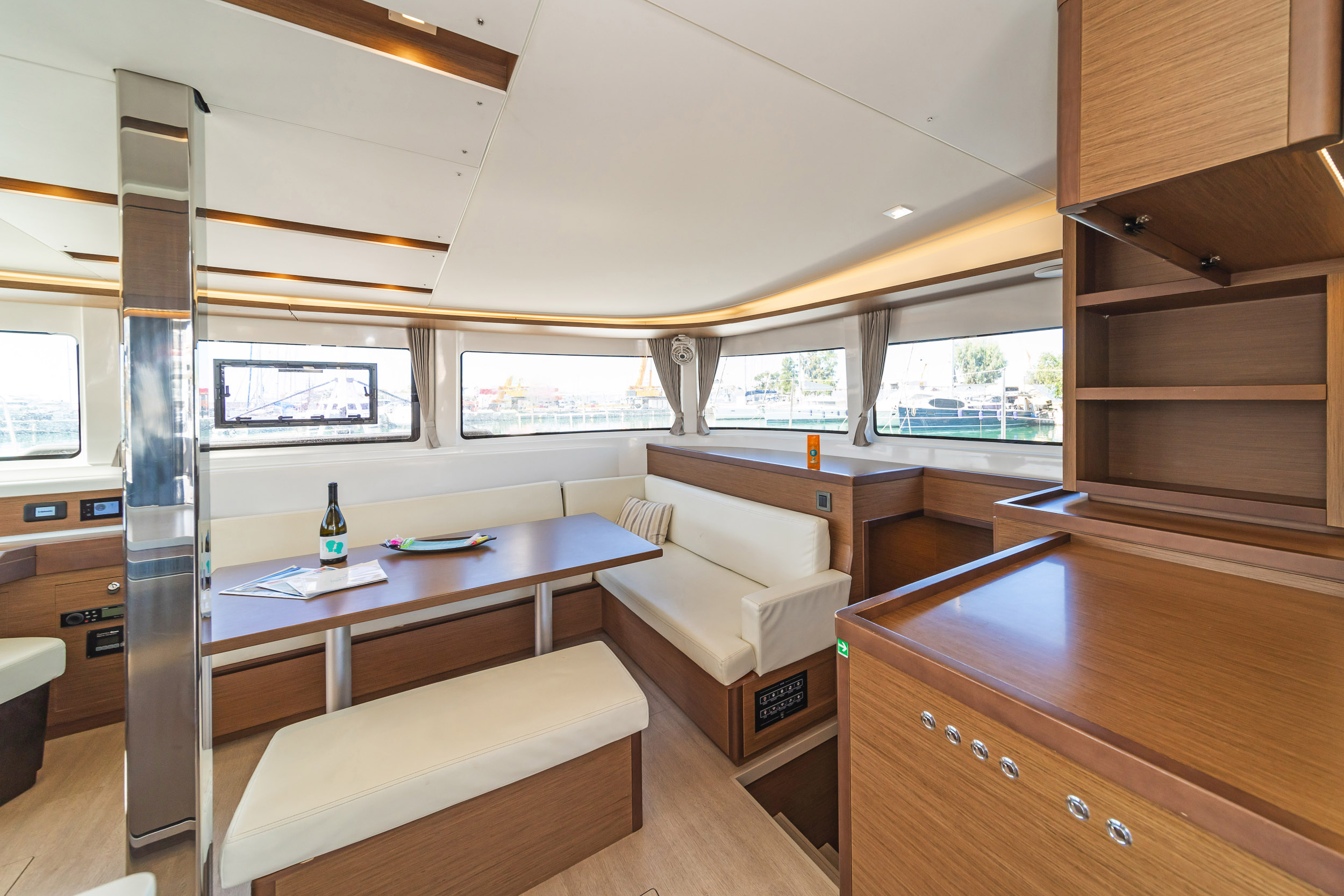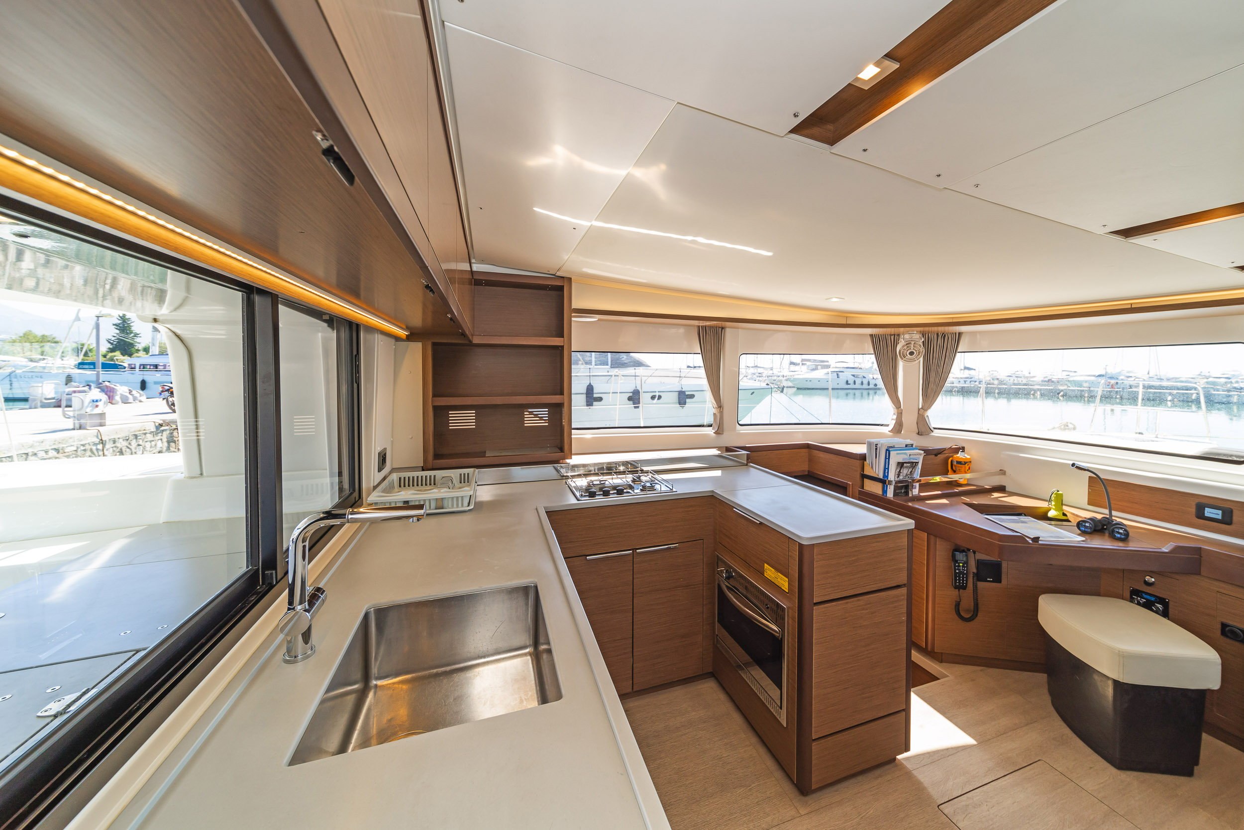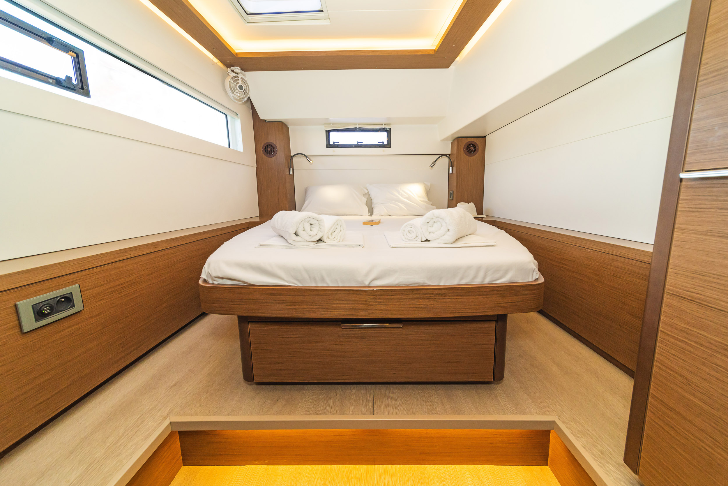 | Inside | 220V Steckdosen, Generator, Heizung, Inverter 12V/220V, Kaffeemaschine, Klimaanlage (ohne Landstrombedarf), Ladegerät, Lautsprecher im Salon, Pantryausstattung, Radio, Radio mit CD, AUX und USB, Radio mit CD, USB, Bluetooth, Watermaker, WC (elektr.) |
