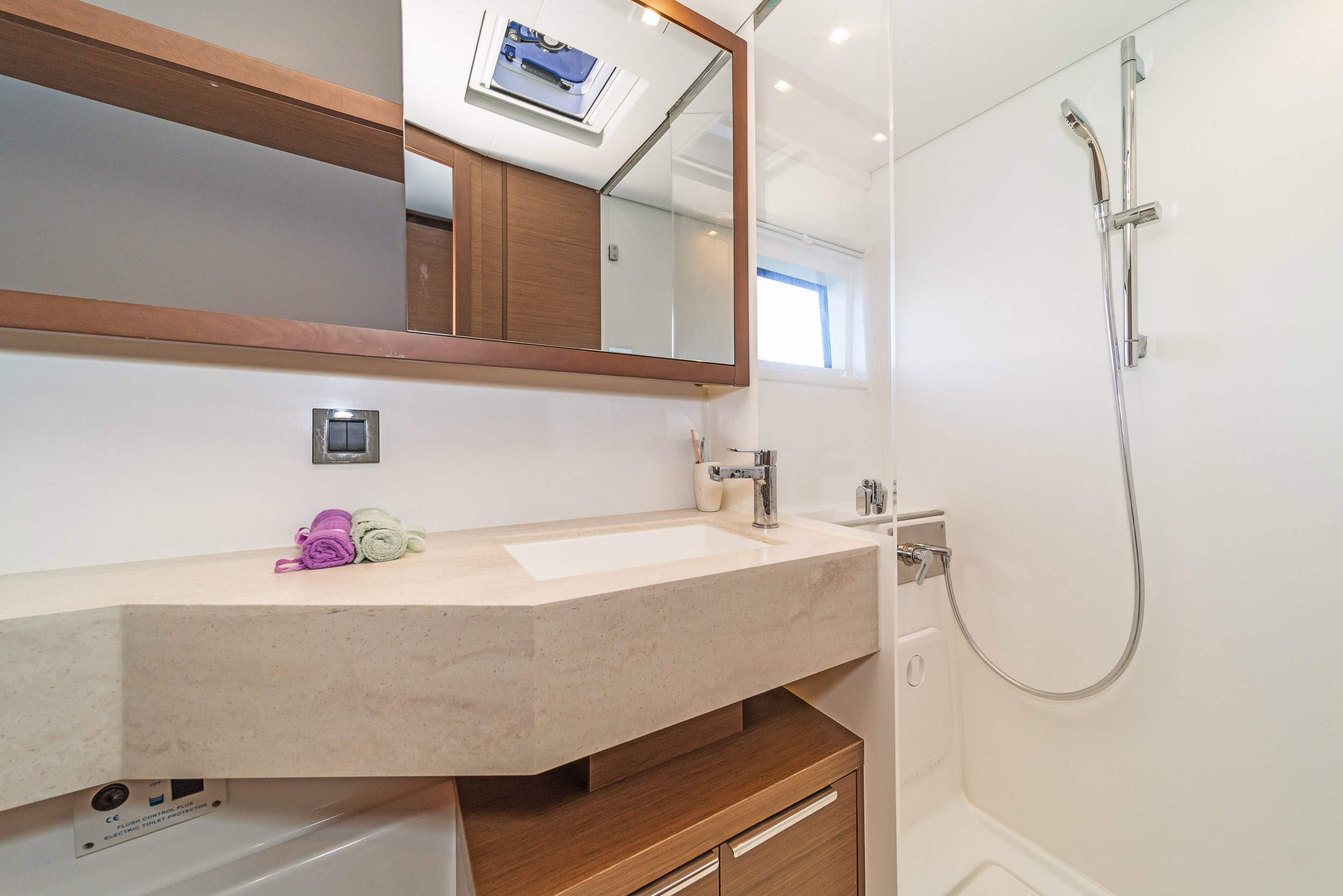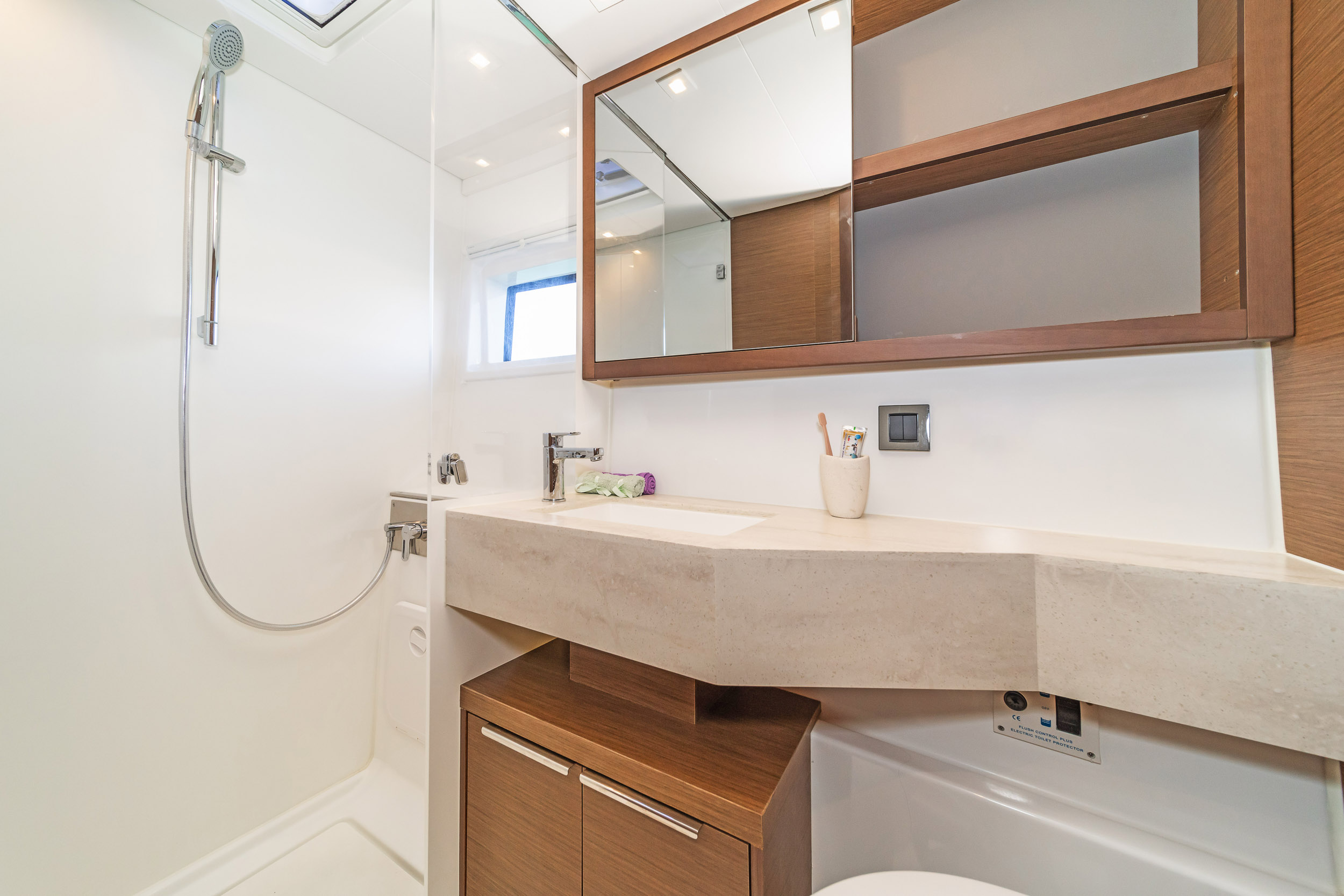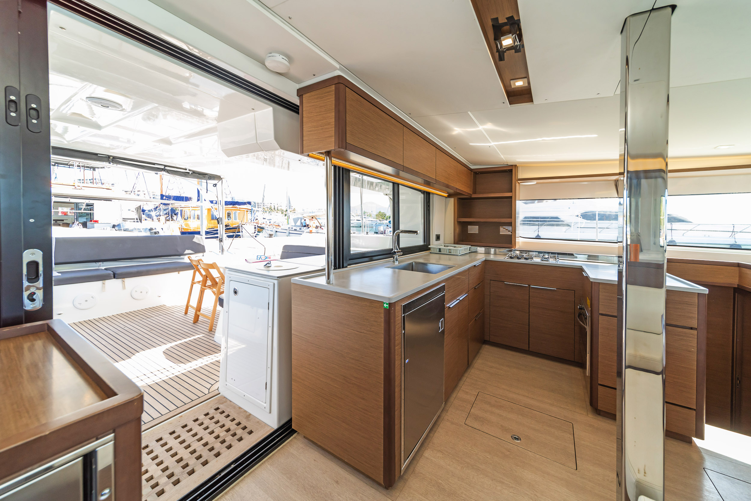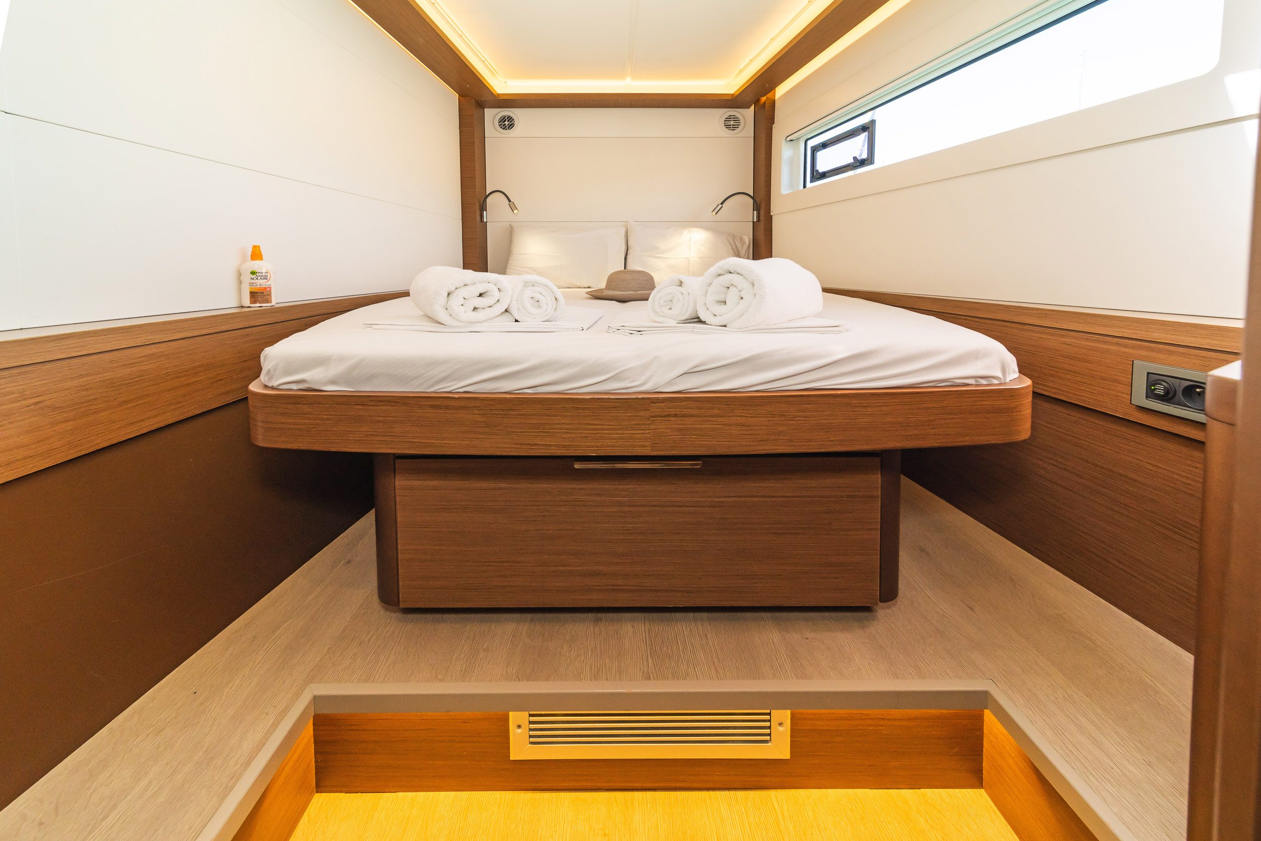 | Inside | 220V Steckdosen, Generator, Heizung, Inverter 12V/220V, Kaffeemaschine, Klimaanlage (ohne Landstrombedarf), Ladegerät, Lautsprecher im Salon, Pantryausstattung, Radio, Radio mit CD, AUX und USB, Radio mit CD, USB, Bluetooth, Watermaker, WC (elektr.) |