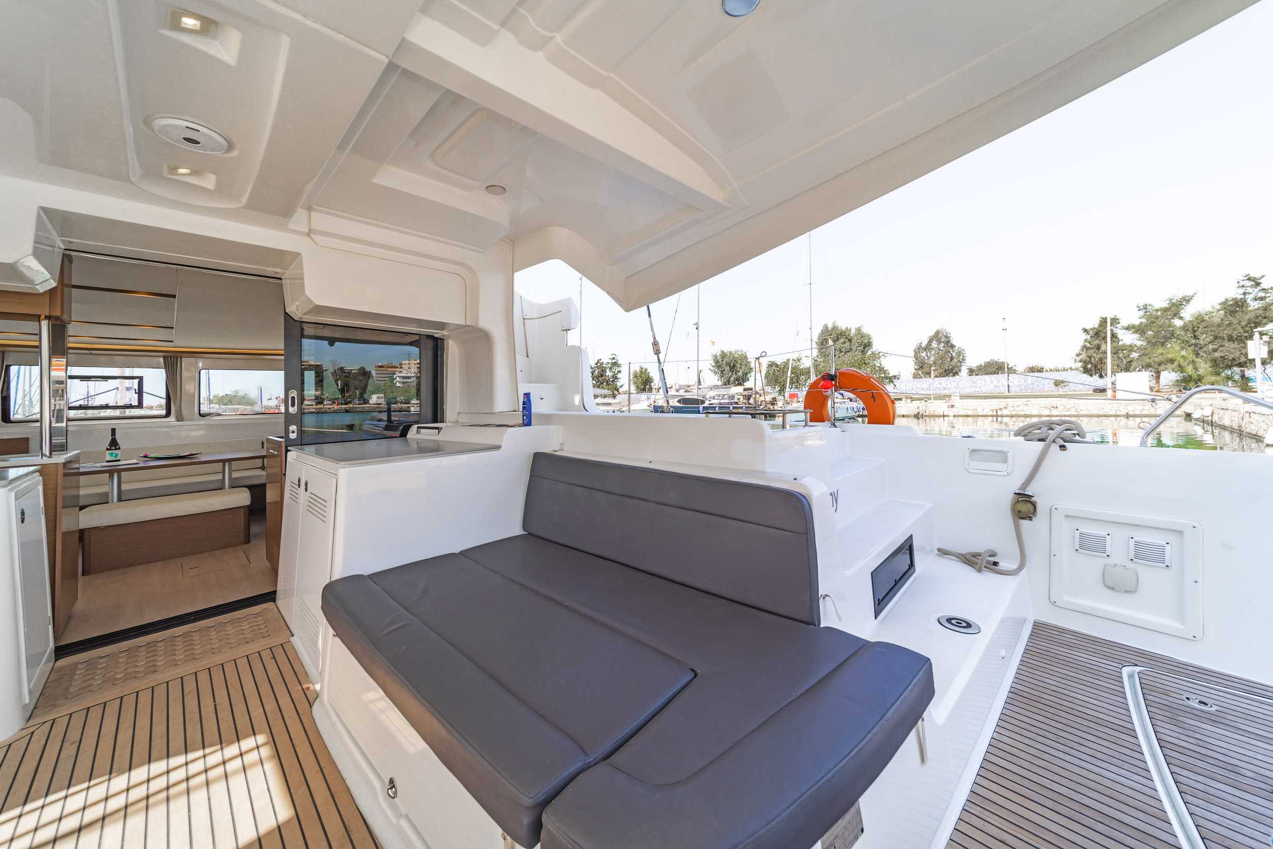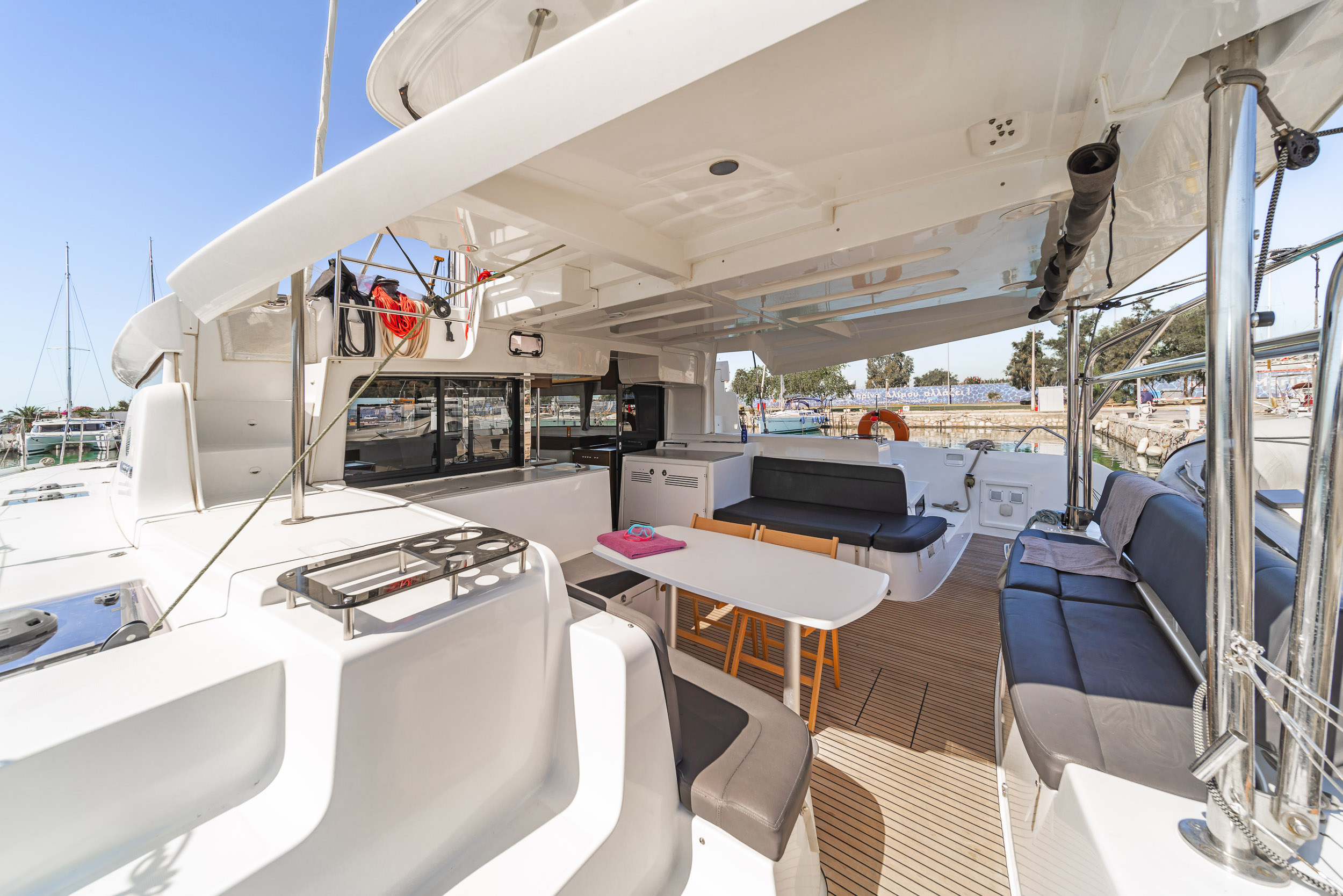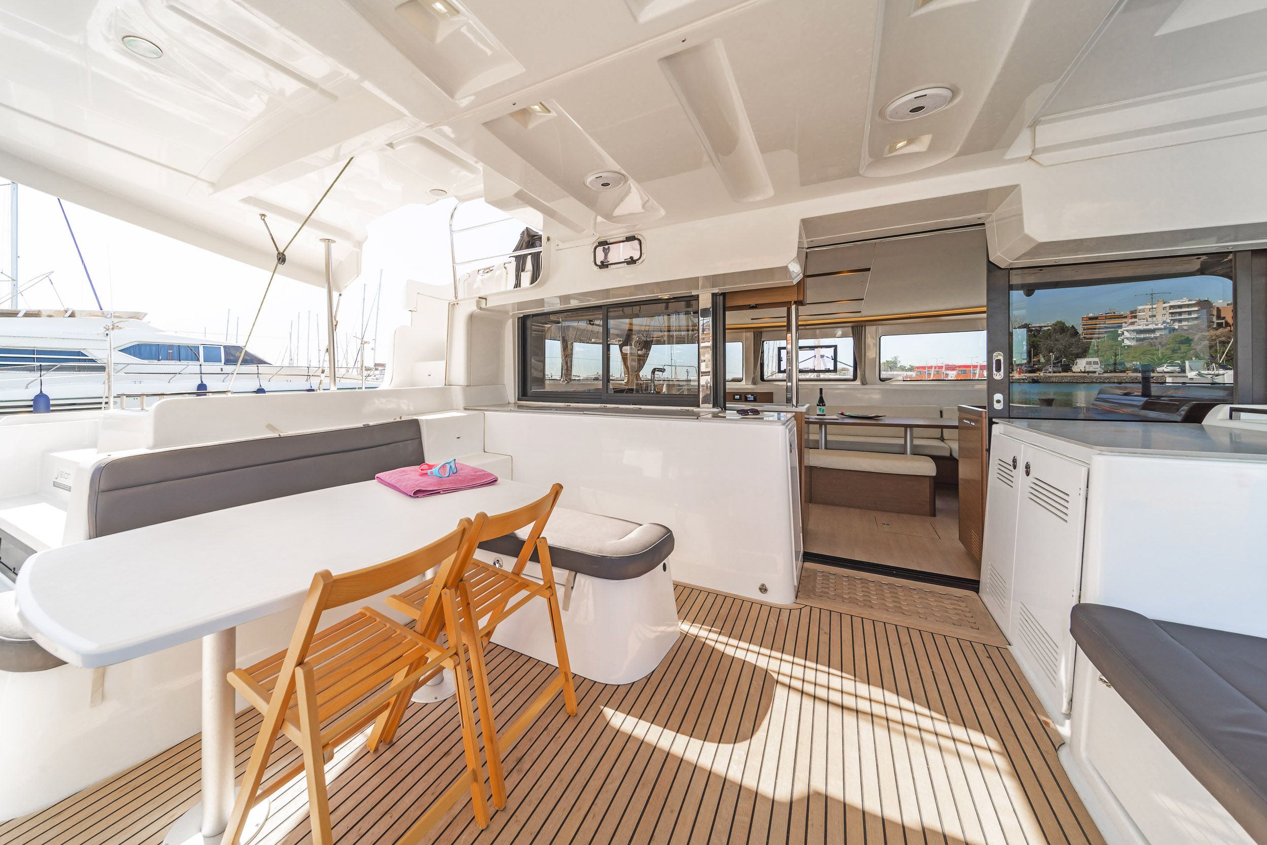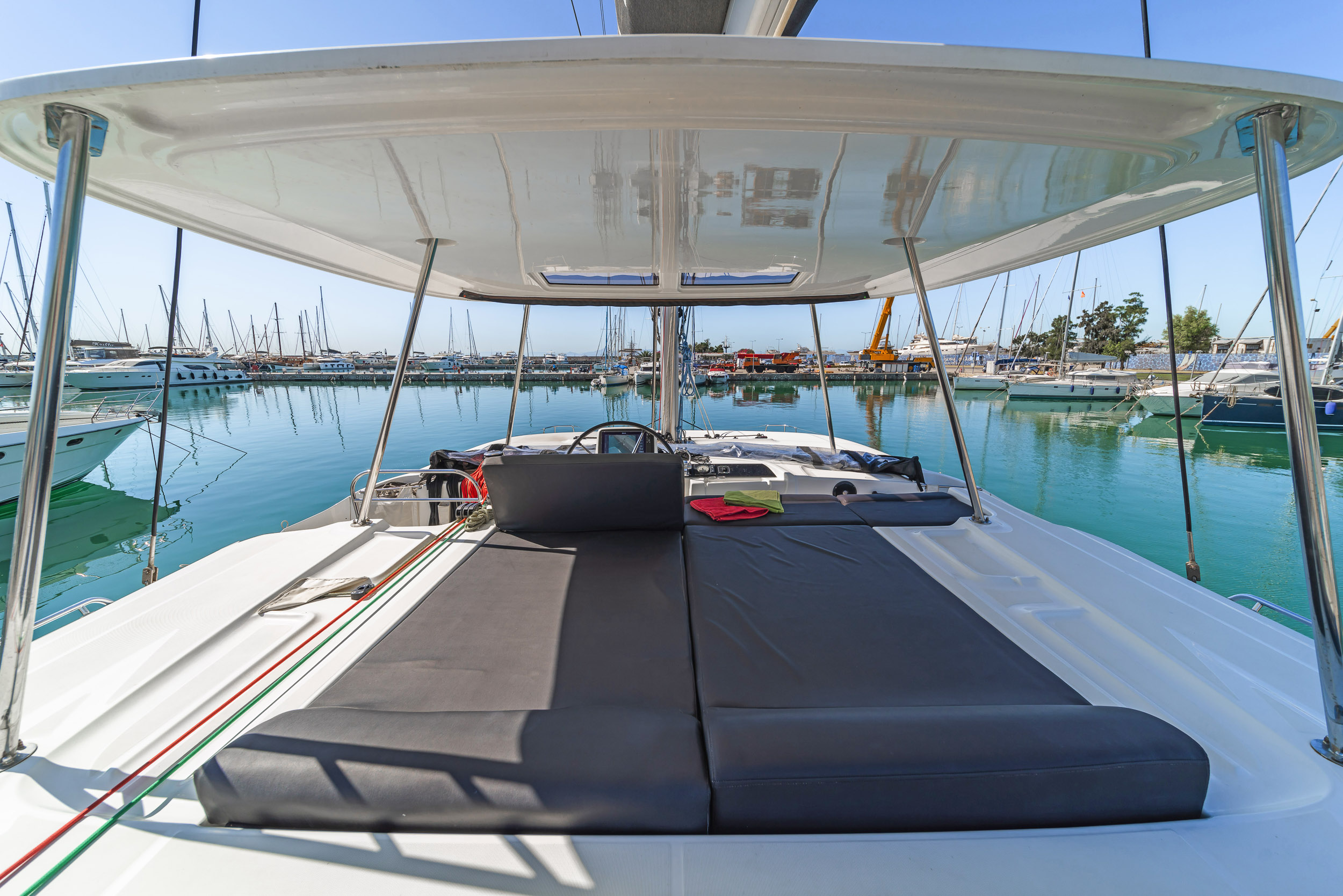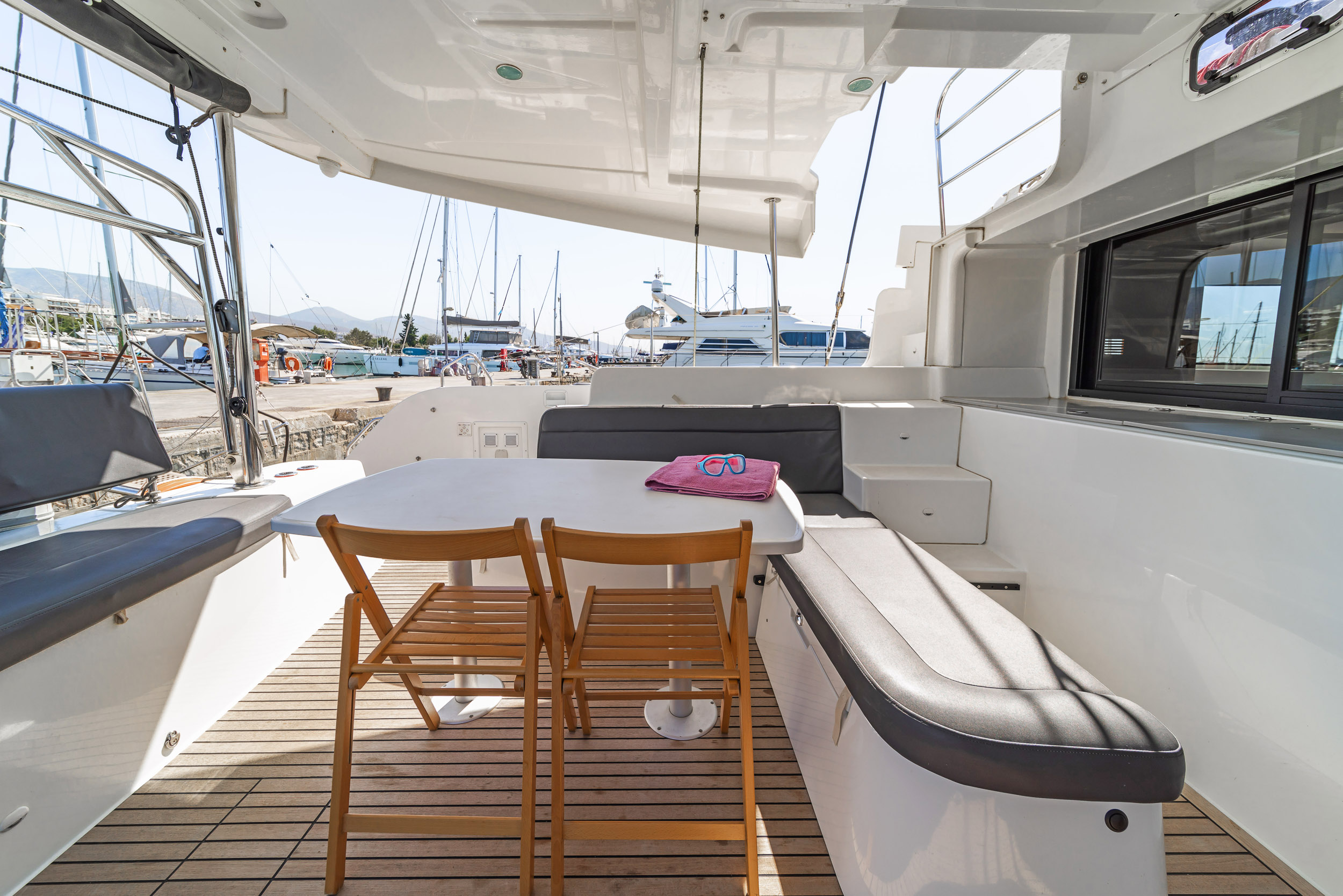 | Outside | Anker mit Kette, Badeleiter, Biminitop, Bootshaken, Cockpitdusche, Cockpitkühlschrank, Cockpitlautsprecher, Cockpitpolster, elektr. Ankerwinsch, Fernsteuerung für elektr. Ankerwinsch, hydraul. Gangway, Solaranlage, Sprayhood |