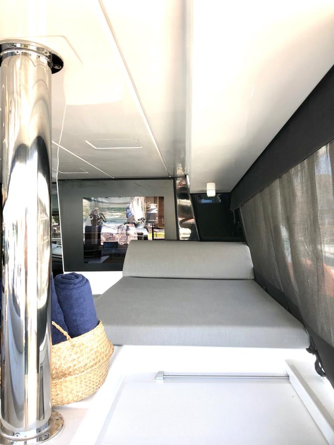 | Outside | Ankerwinsch, Cockpitpolster, Elektr. Ankerwinsch mit Kettenzähler, hydraul. Gangway, Solaranlage, Sprayhood, Wantenschneider |