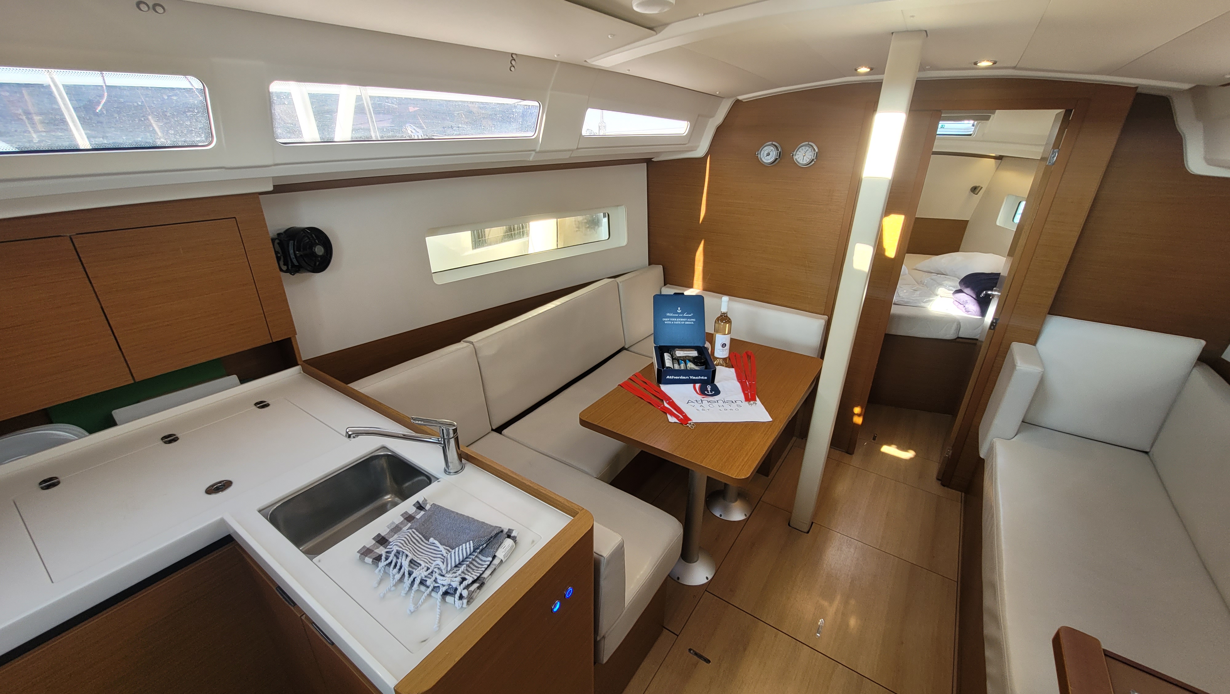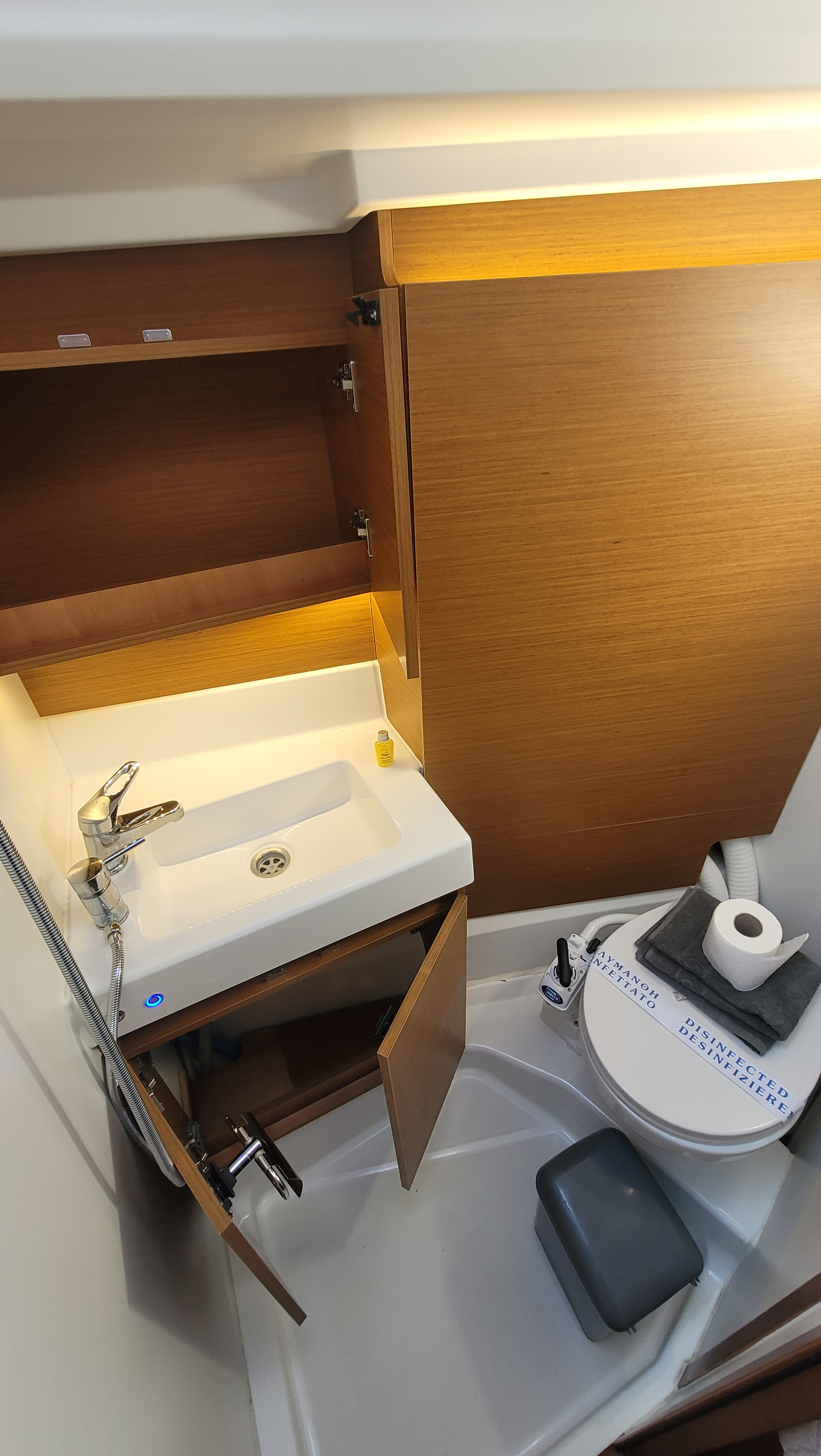 | Inside | 220V Steckdosen, Backofen, Gasherd, Ladegerät, Landstromkabel, Lautsprecher im Salon, Salontisch absenkbar, USB Steckdose, Ventilatoren in Salon und Kabinen, Warmwasser |