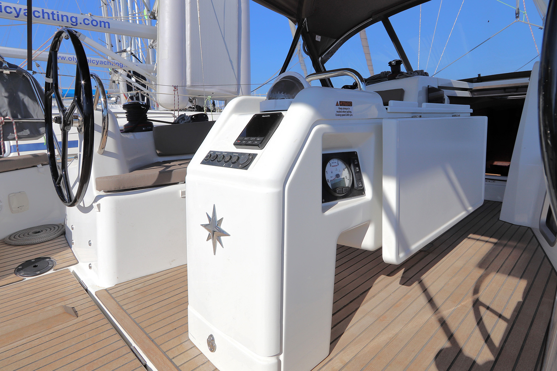 Outside Badeleiter, Badeplattform, Biminitop, Cockpitdusche, Cockpitlautsprecher, Cockpitpolster, Cockpittisch, elektr. Ankerwinsch, Solaranlage, Sprayhood, Teak im Cockpit, Windex