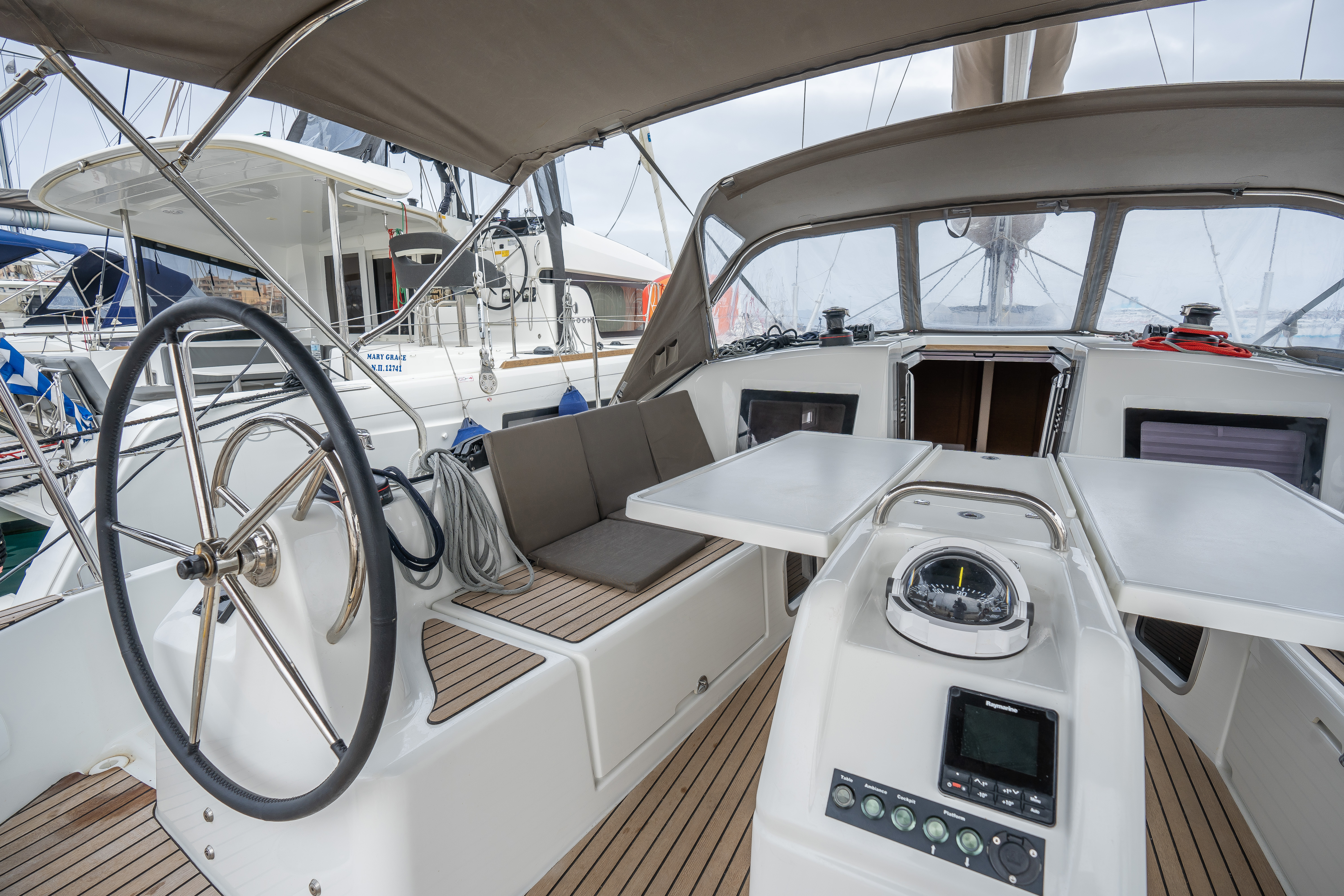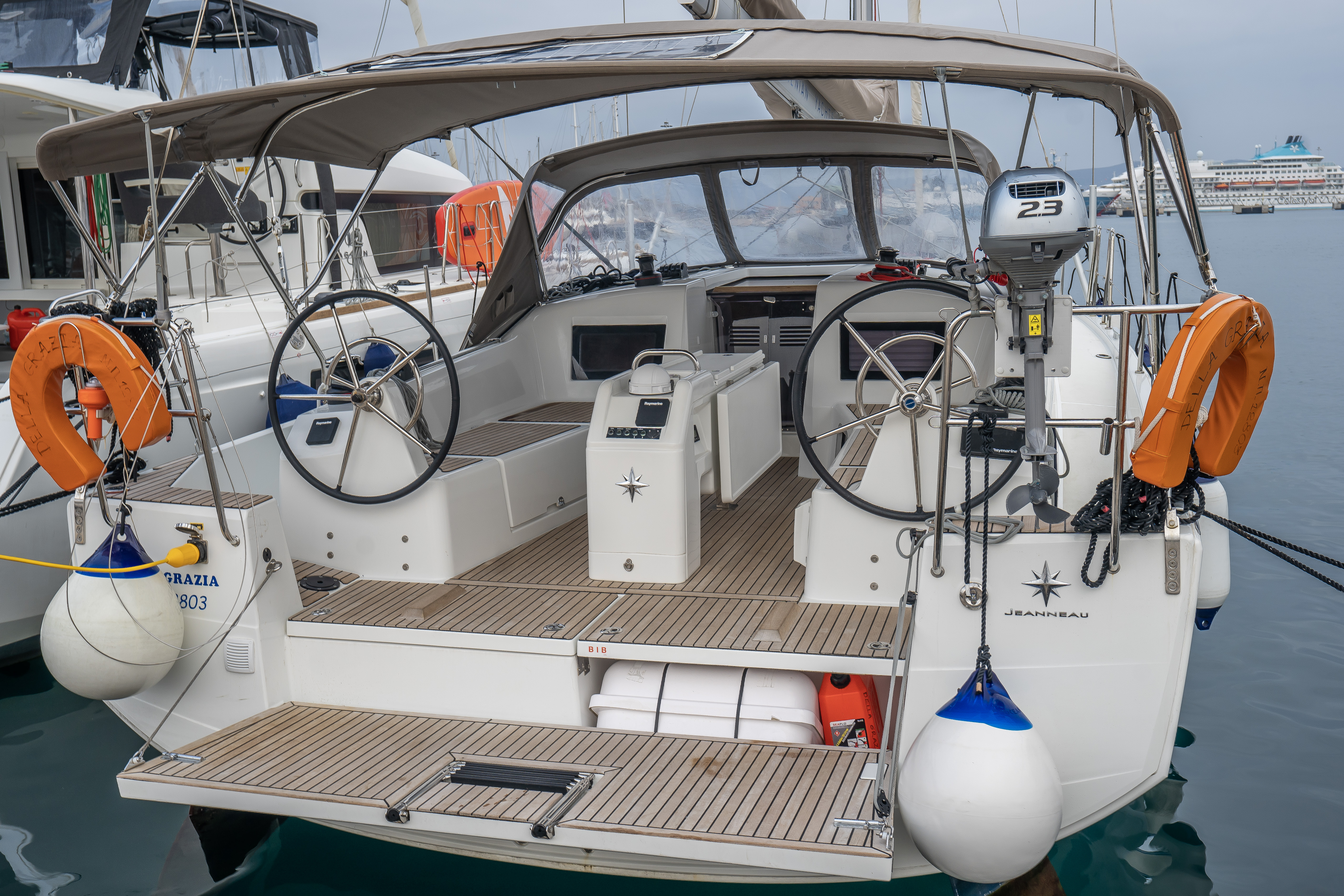 | Outside | 220 V-Landanschluss, Badeleiter, Biminitop, Cockpitdusche, Cockpittisch, elektr. Ankerwinsch, Schnorchelausrüstung, Solaranlage, Sprayhood |