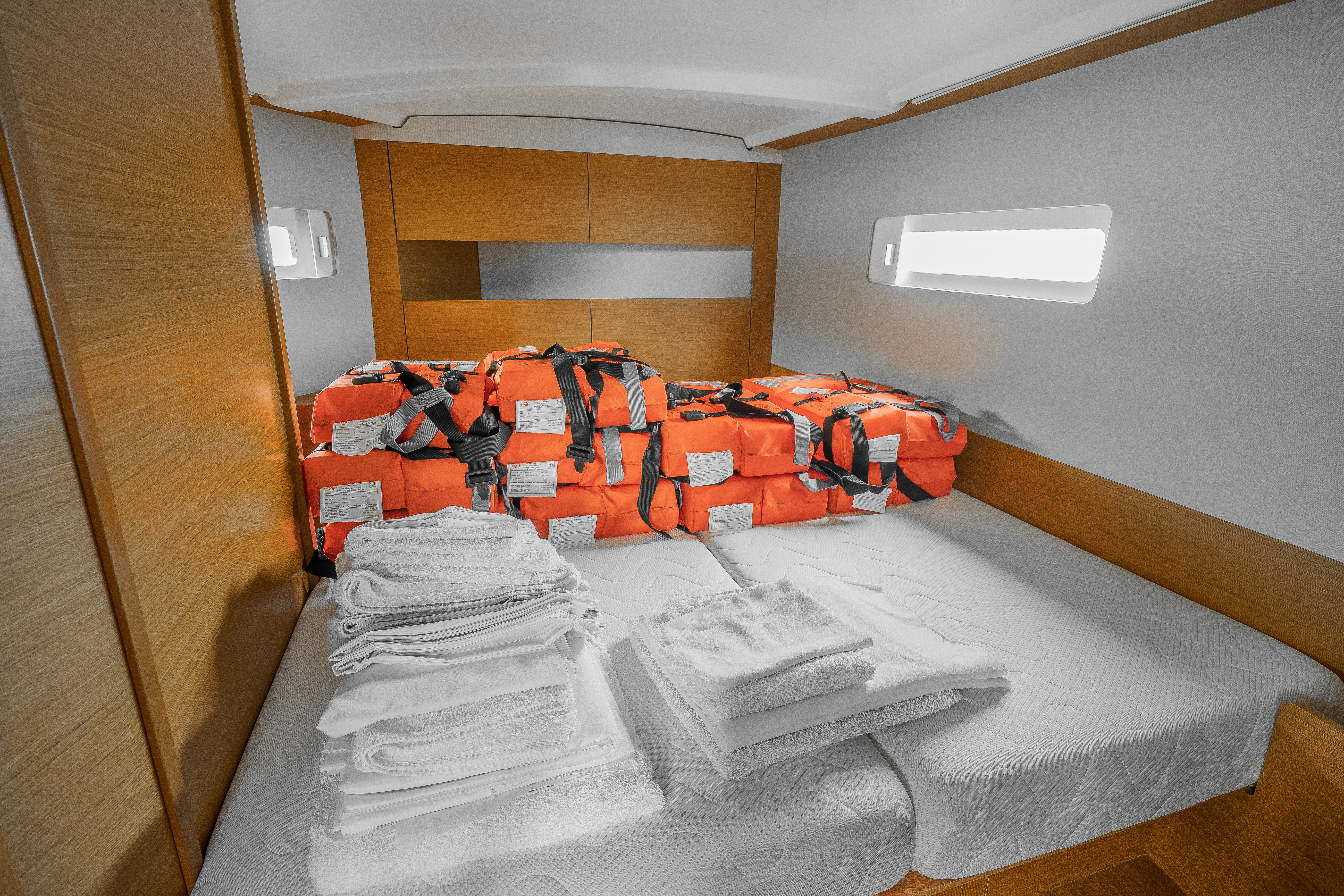 | Safety | Autopilot, Bordapotheke, Bugstrahlruder, Feststoffschwimmwesten, Lifebelts, Rettungsinsel, Rettungskragen, UKW-Funk |