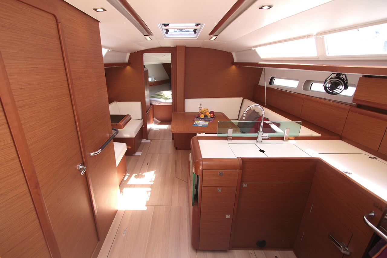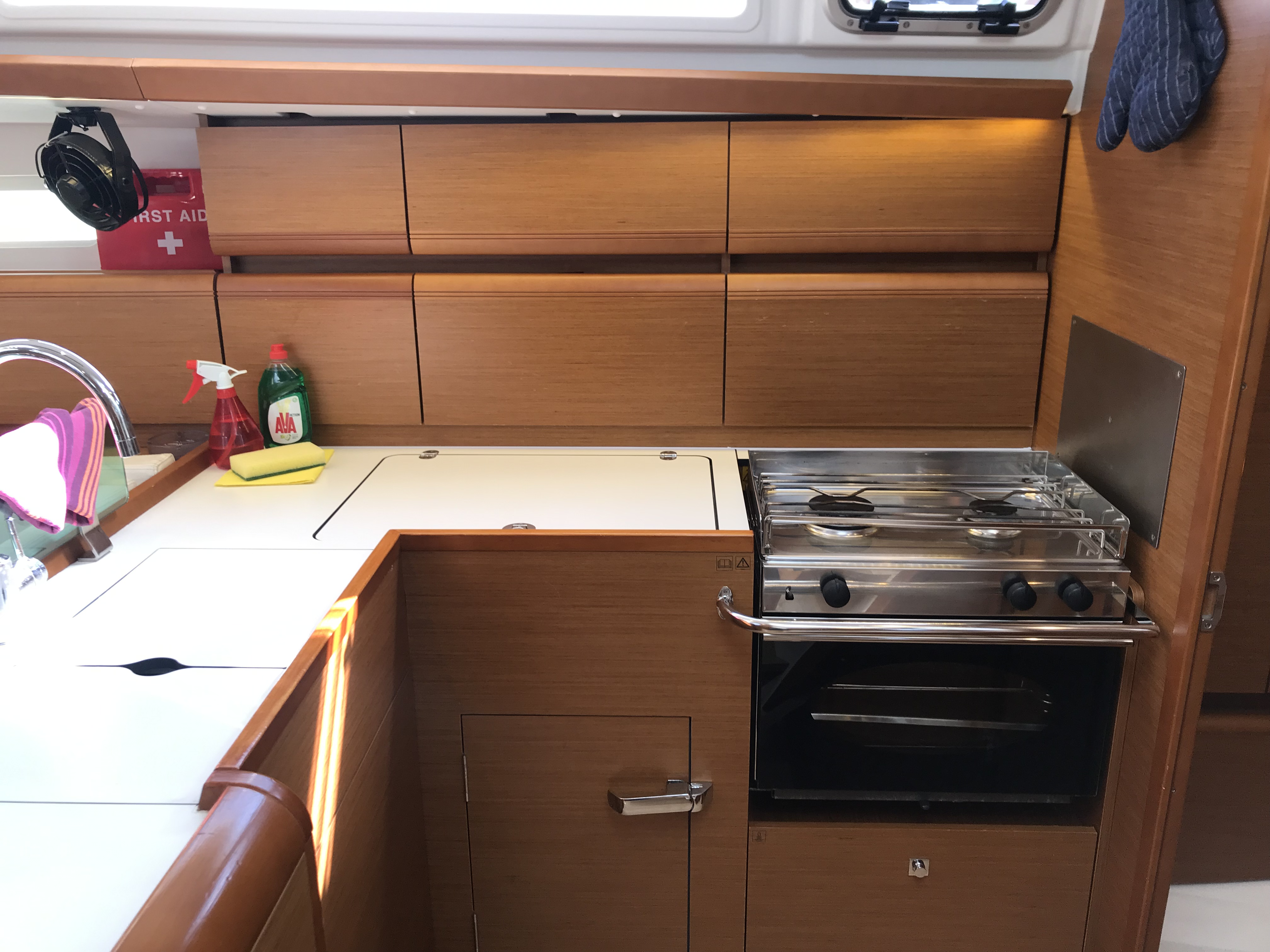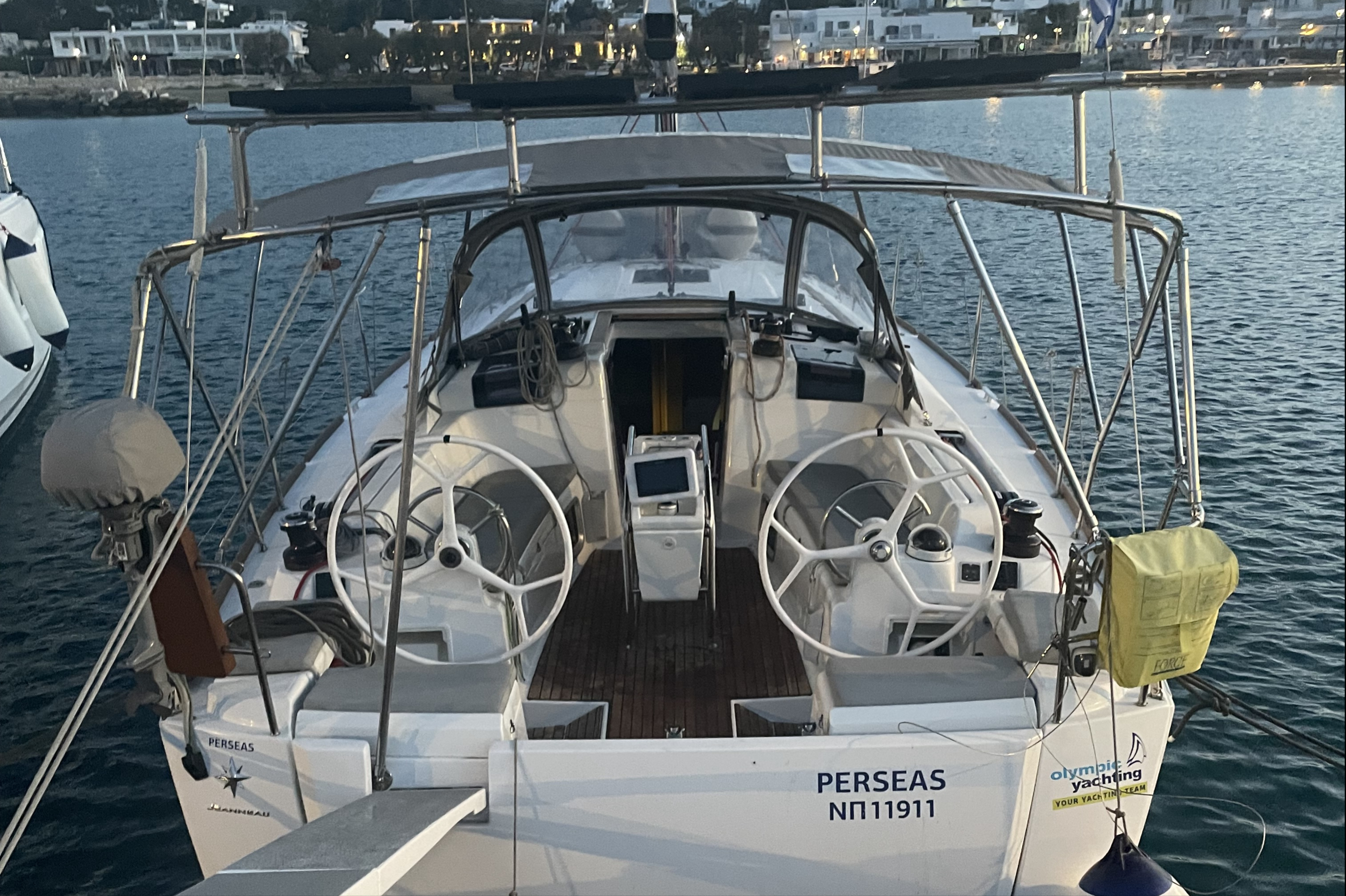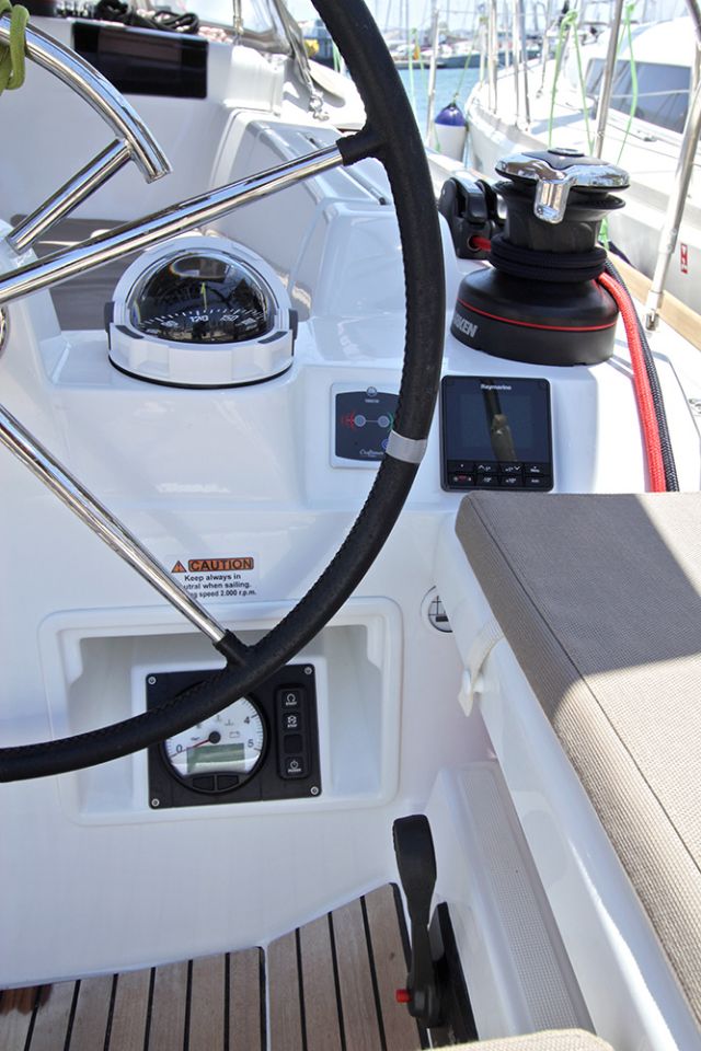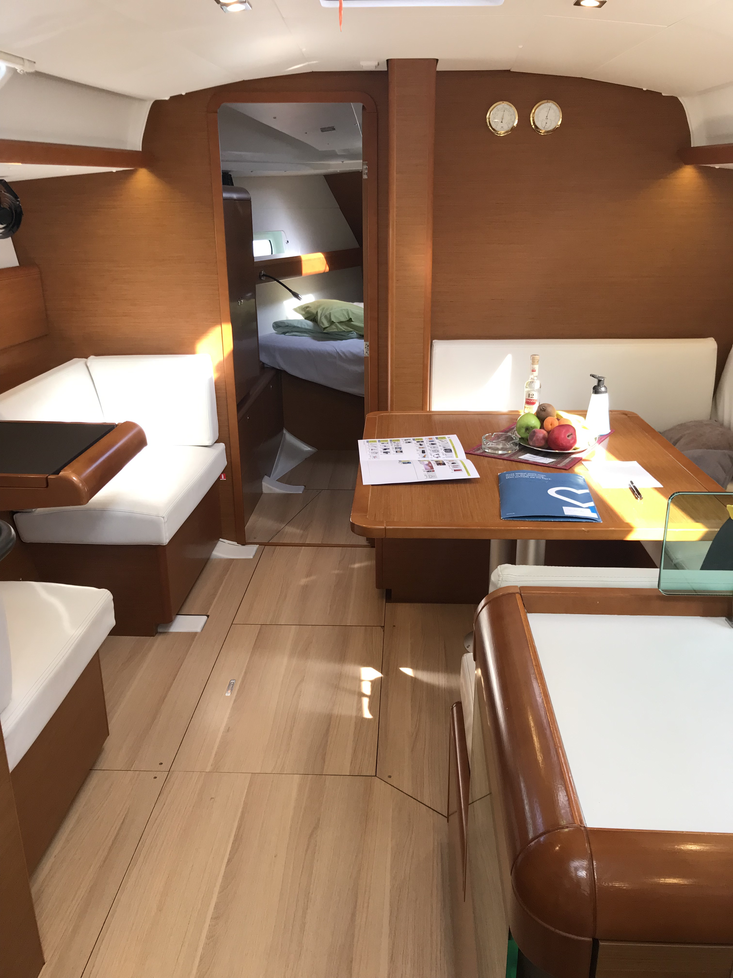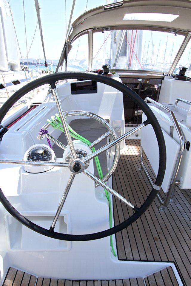 | Outside | Badeleiter, Badeplattform, Biminitop, Cockpitdusche, Cockpitlautsprecher, Cockpitpolster, Cockpittisch, elektr. Ankerwinsch, Solaranlage, Sprayhood, Teak im Cockpit, Windex |