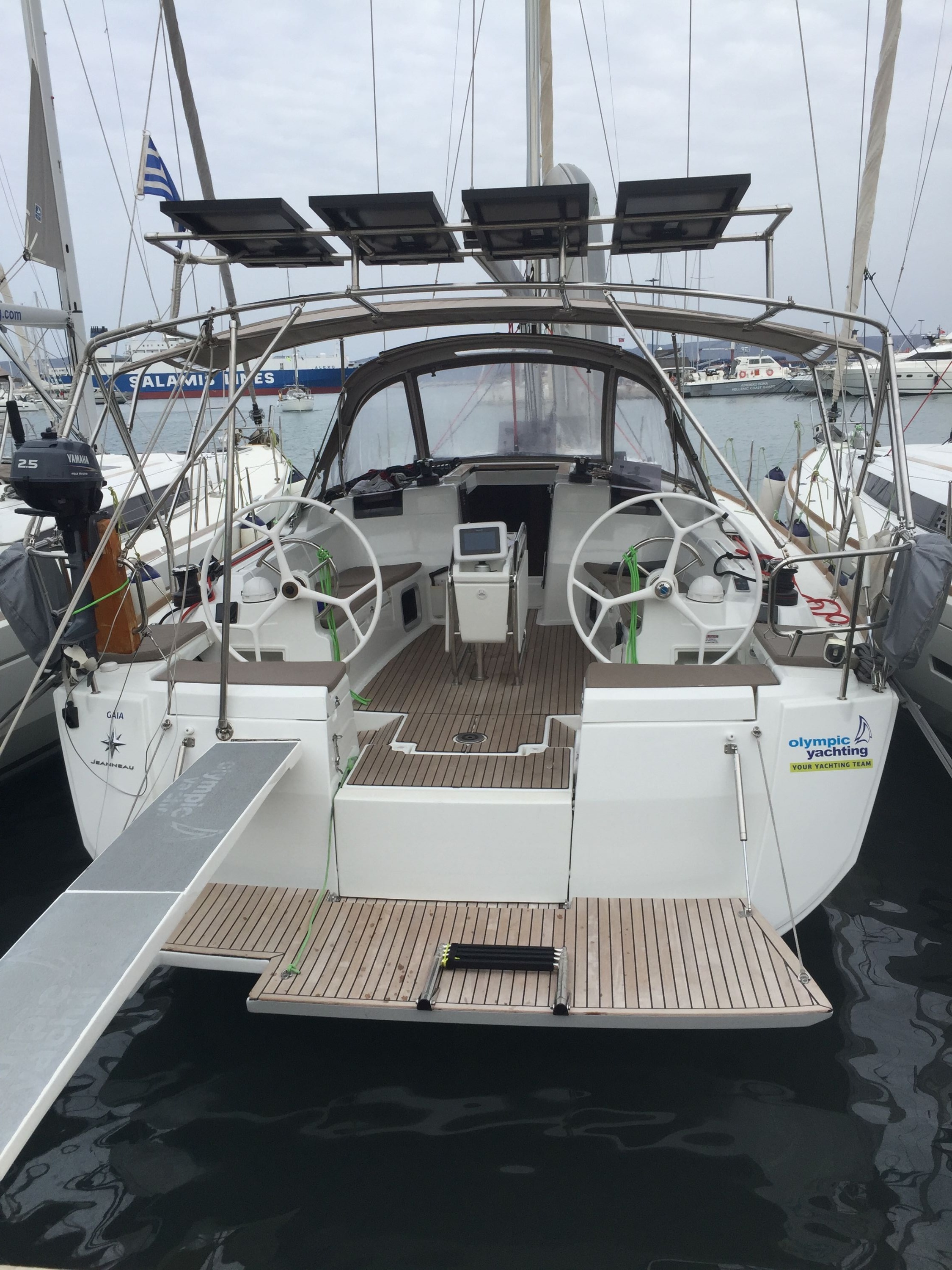 Outside Badeleiter, Badeplattform, Biminitop, Cockpitdusche, Cockpitlautsprecher, Cockpitpolster, Cockpittisch, elektr. Ankerwinsch, Solaranlage, Sprayhood, Teak im Cockpit, Windex