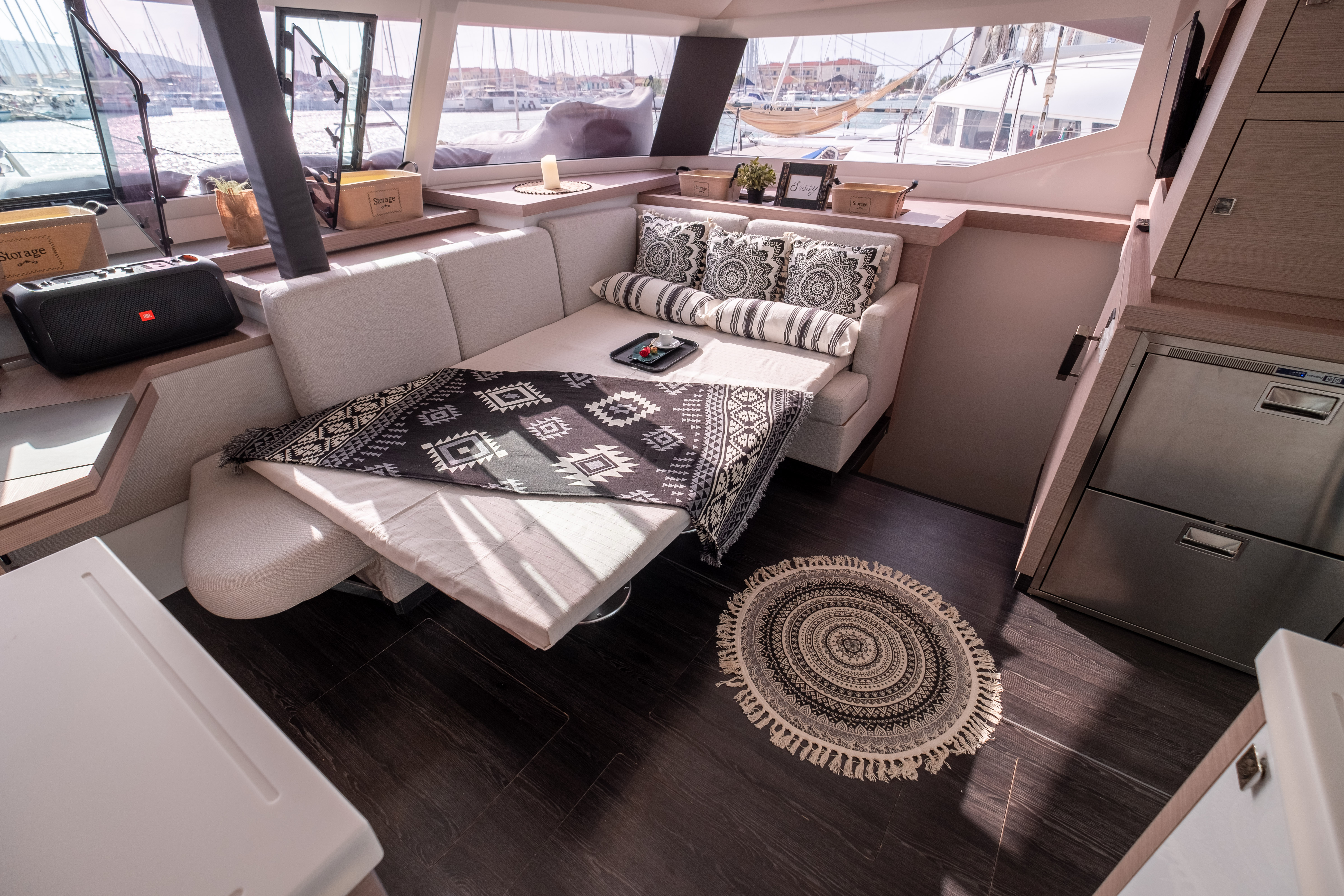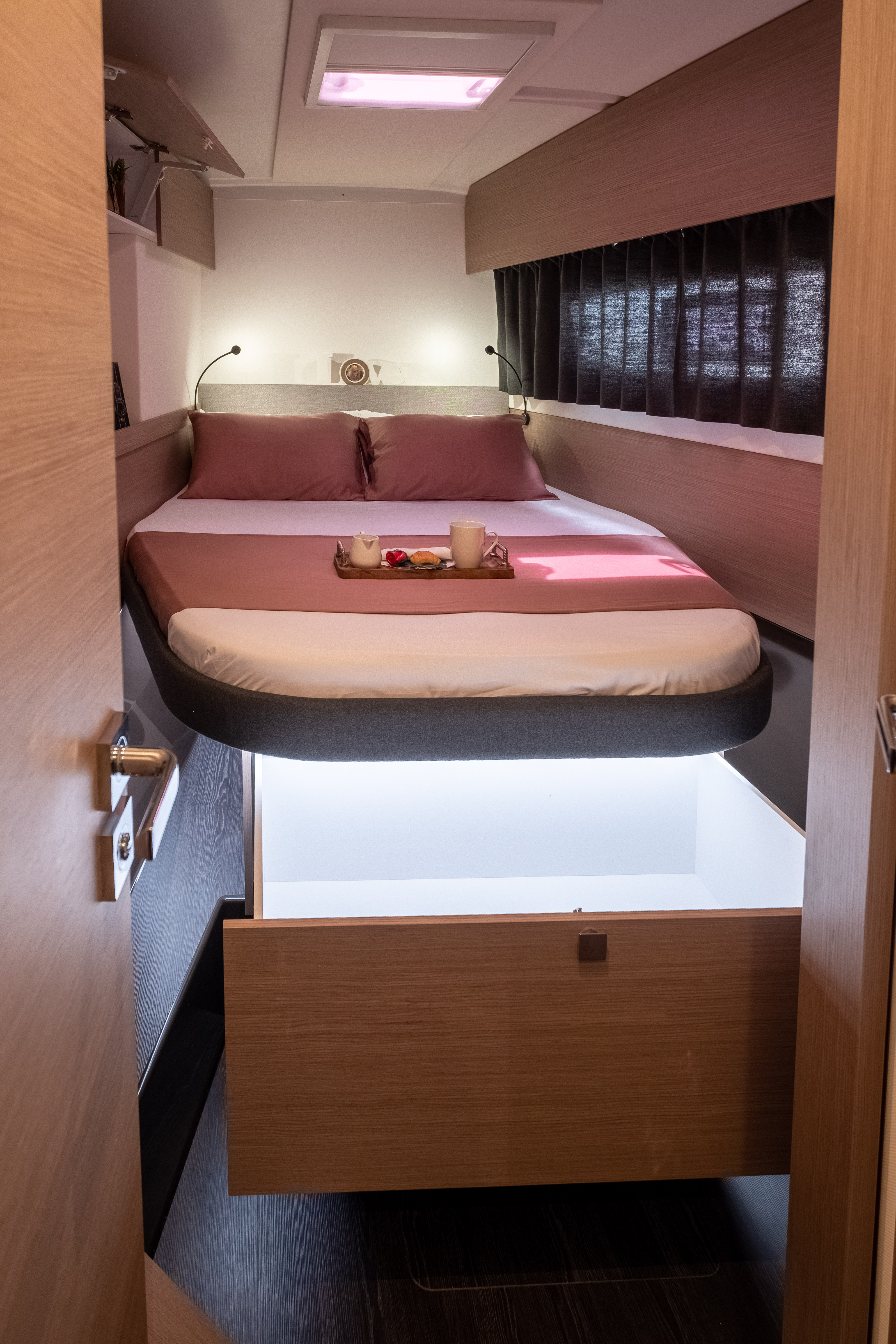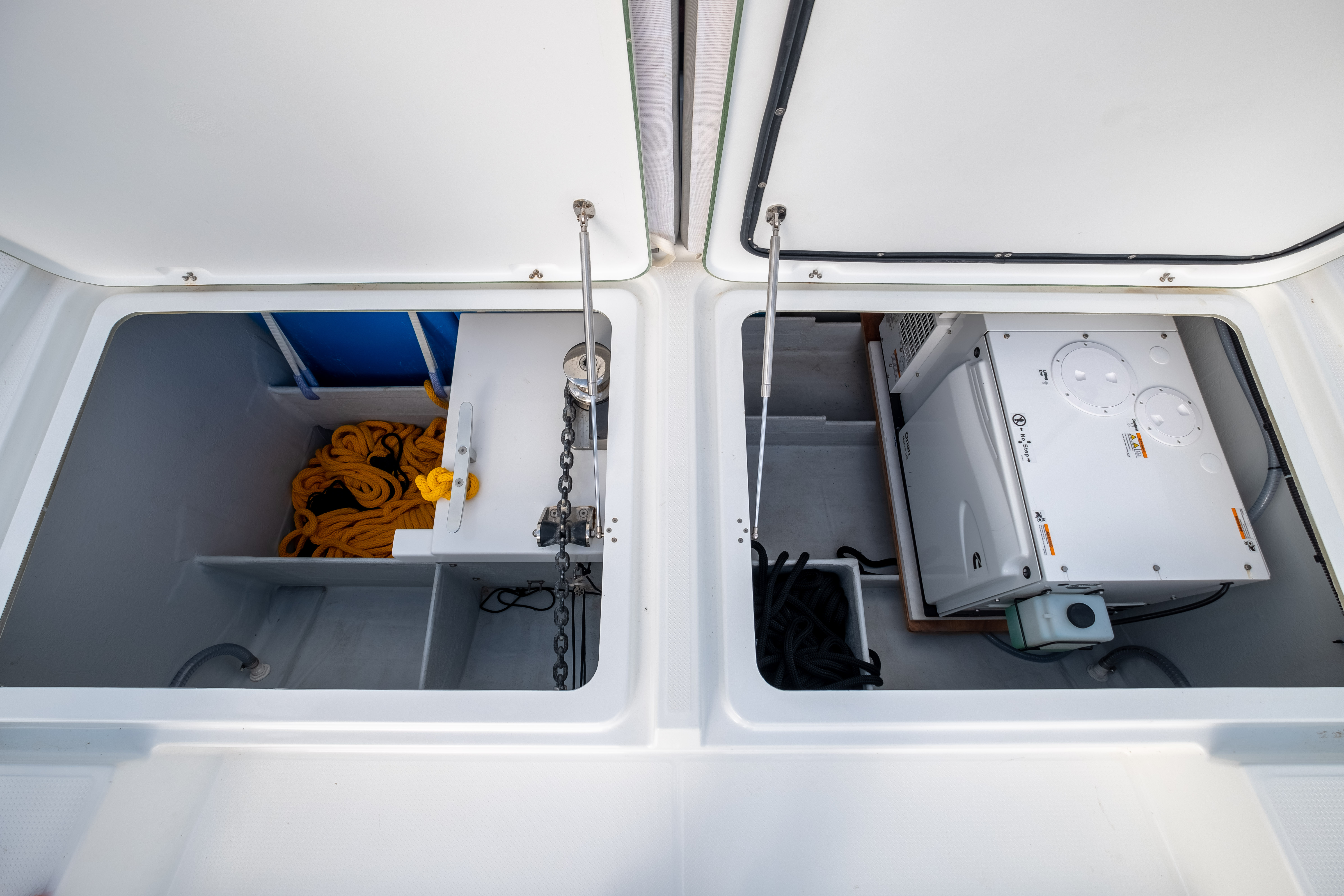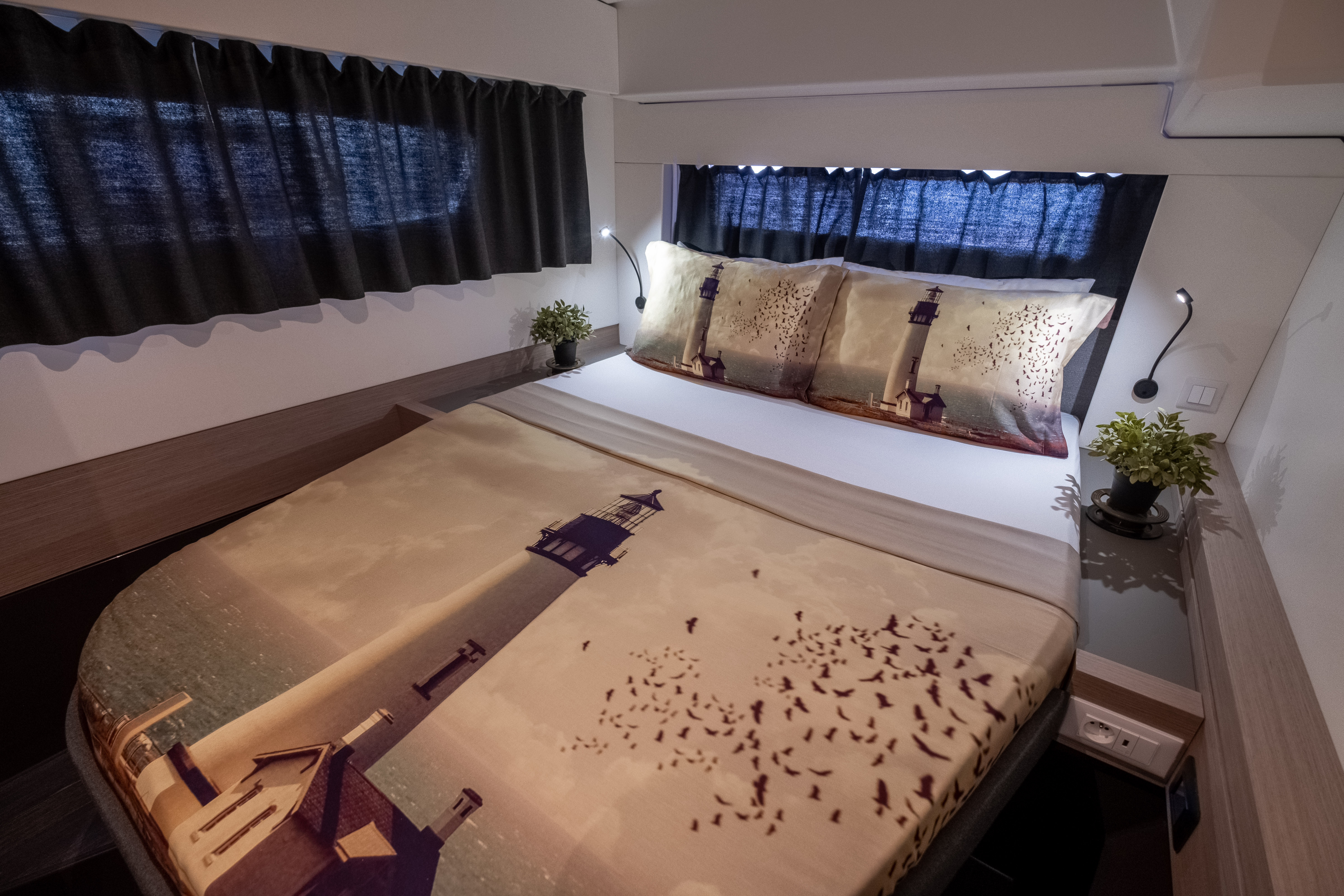 | Inside | FUSION Sound System, Gefrierschrank, Generator, Inverter 12V/220V, Klimaanlage (ohne Landstrombedarf), LED-Innenleuchten, Mikrowelle, Pantryausstattung, Salontisch absenkbar, Trichter, TV, USB Steckdose, Ventilatoren in Salon und Kabinen, Watermaker |