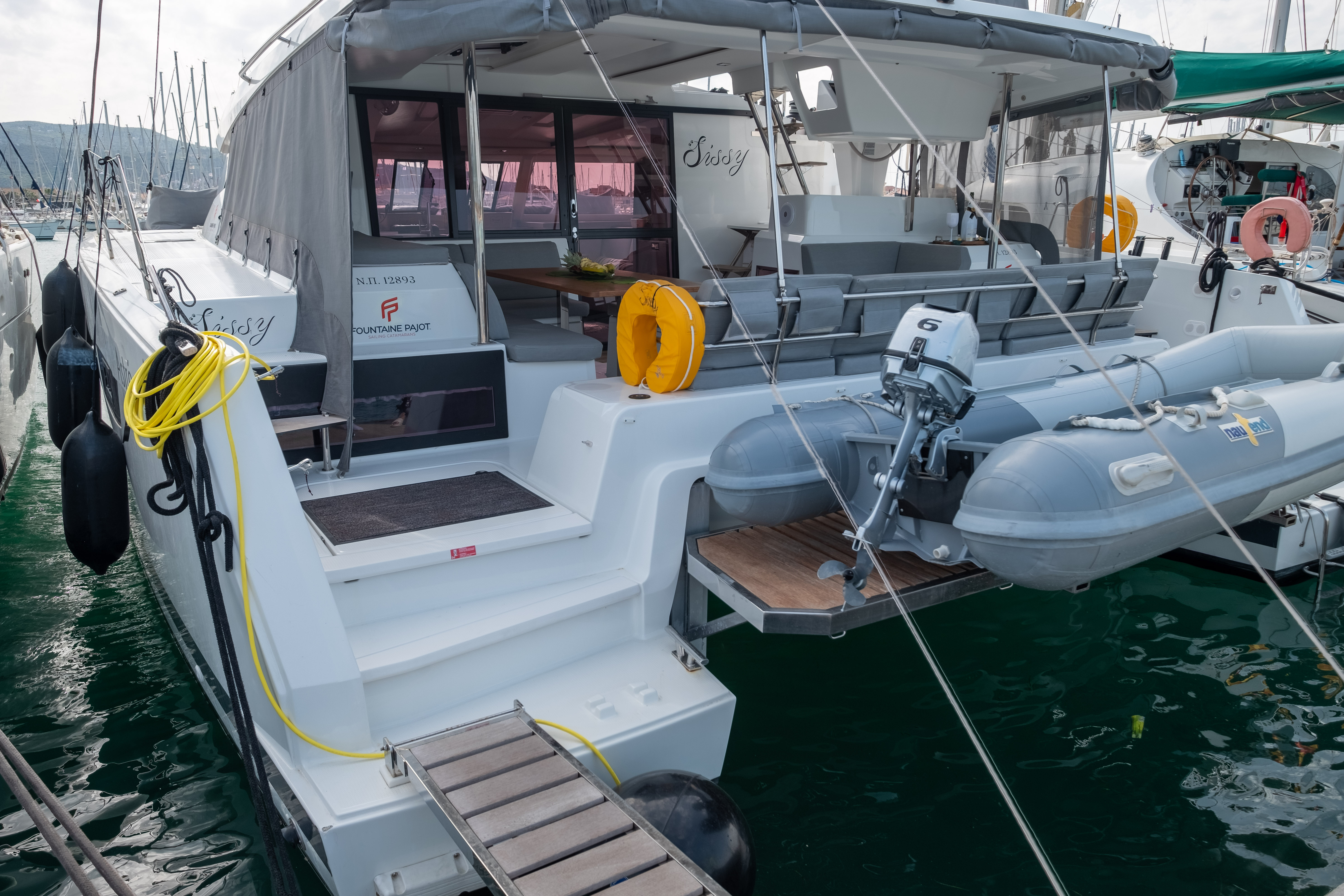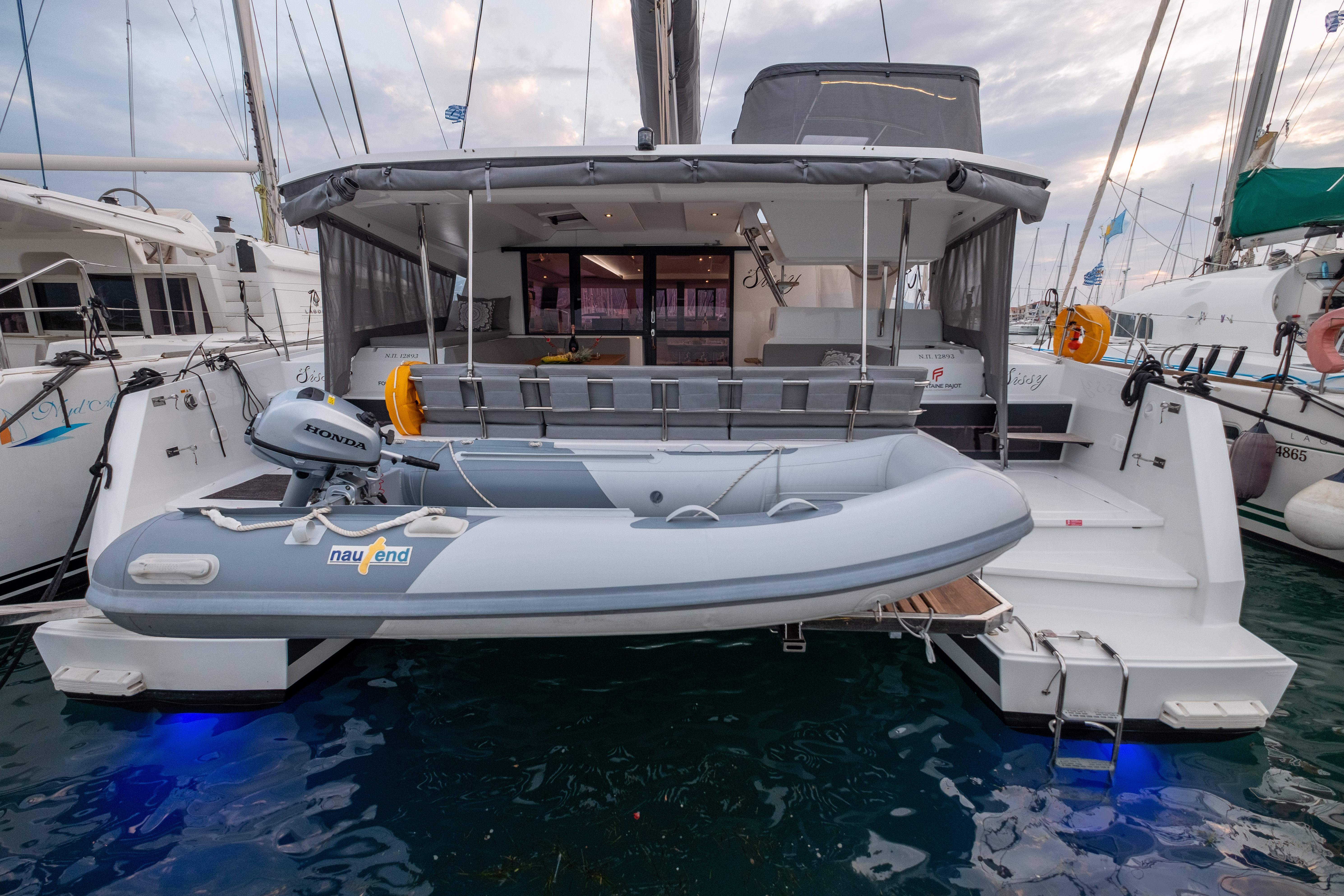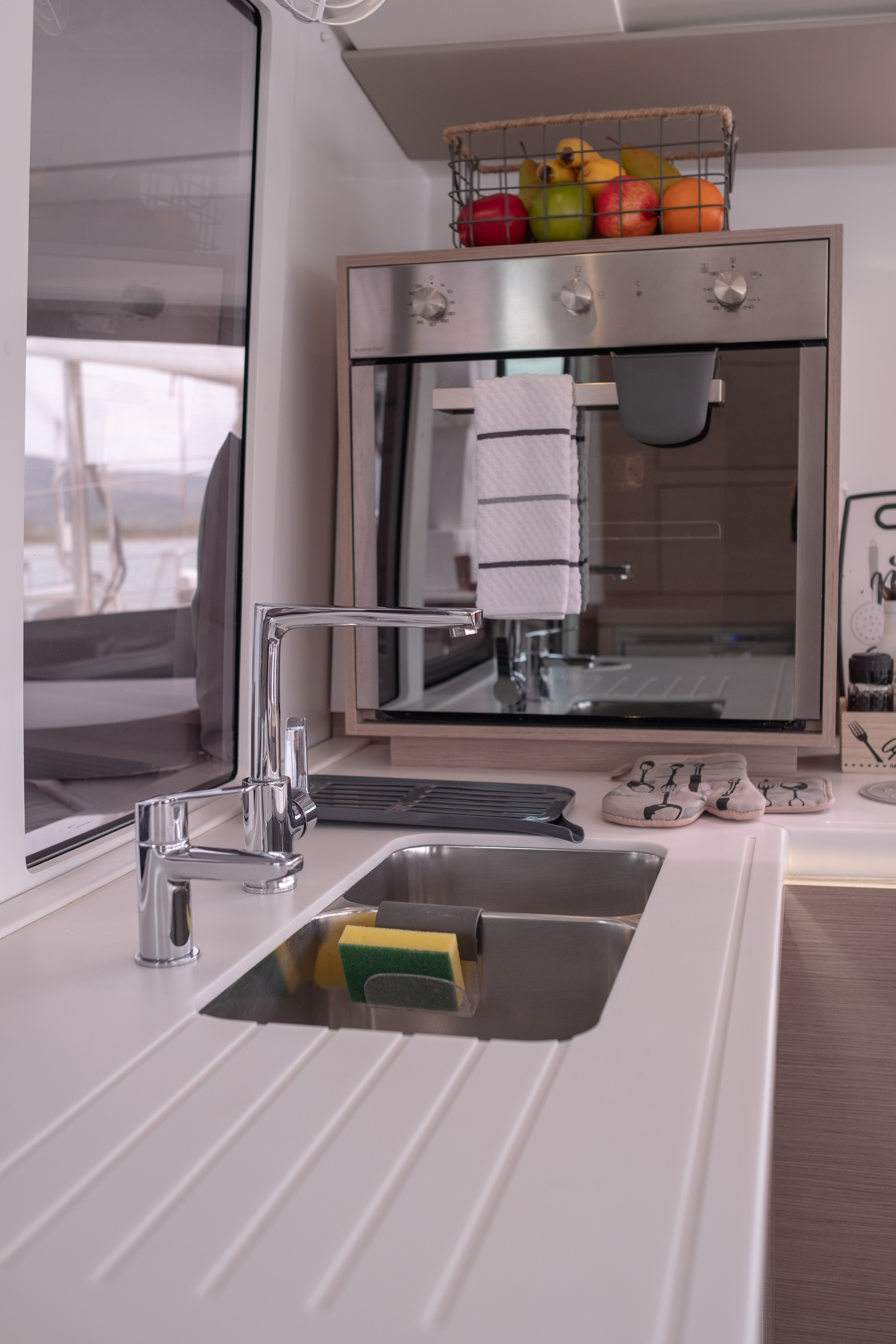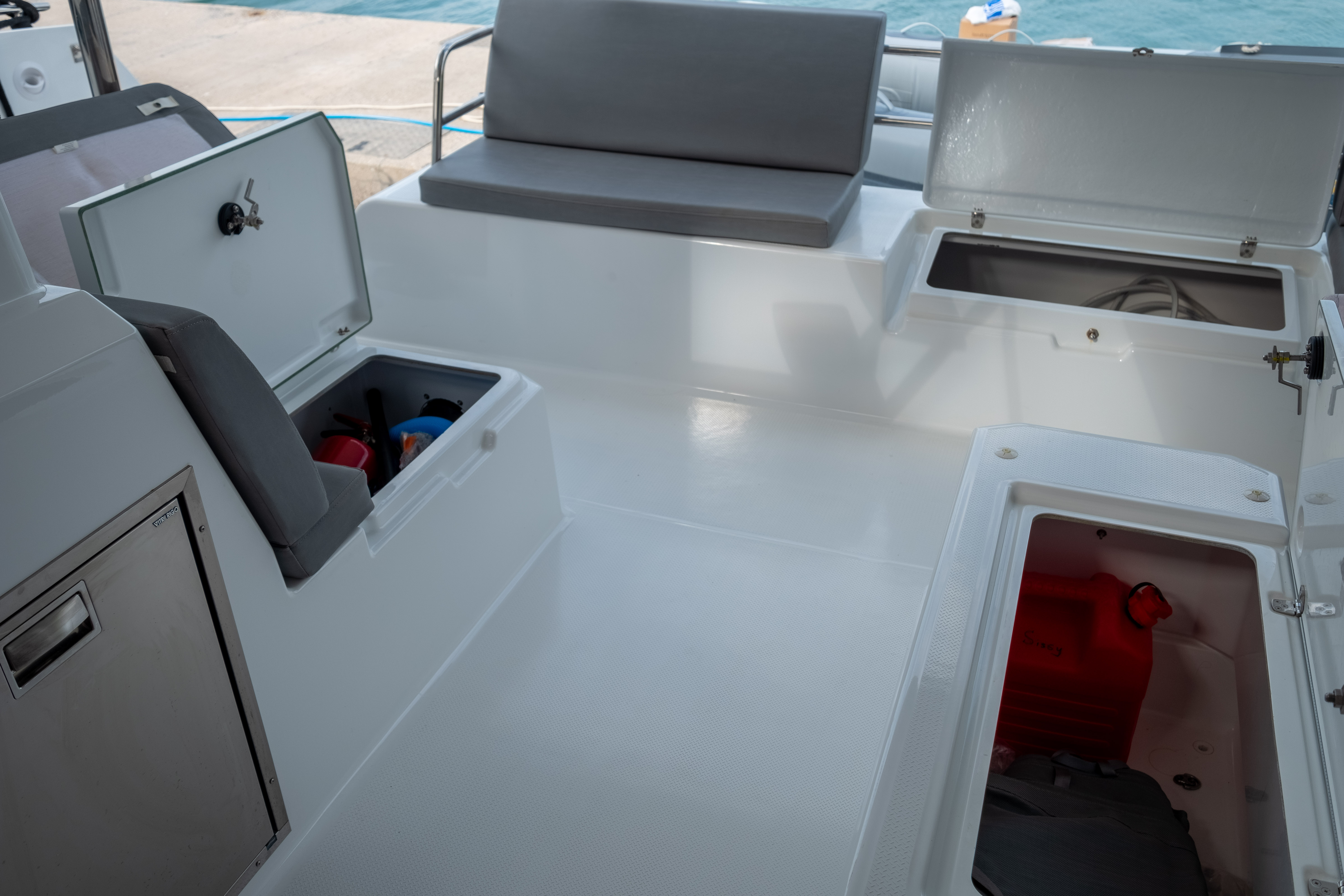 | Inside | FUSION Sound System, Gefrierschrank, Generator, Inverter 12V/220V, Klimaanlage (ohne Landstrombedarf), LED-Innenleuchten, Mikrowelle, Pantryausstattung, Salontisch absenkbar, Trichter, TV, USB Steckdose, Ventilatoren in Salon und Kabinen, Watermaker |