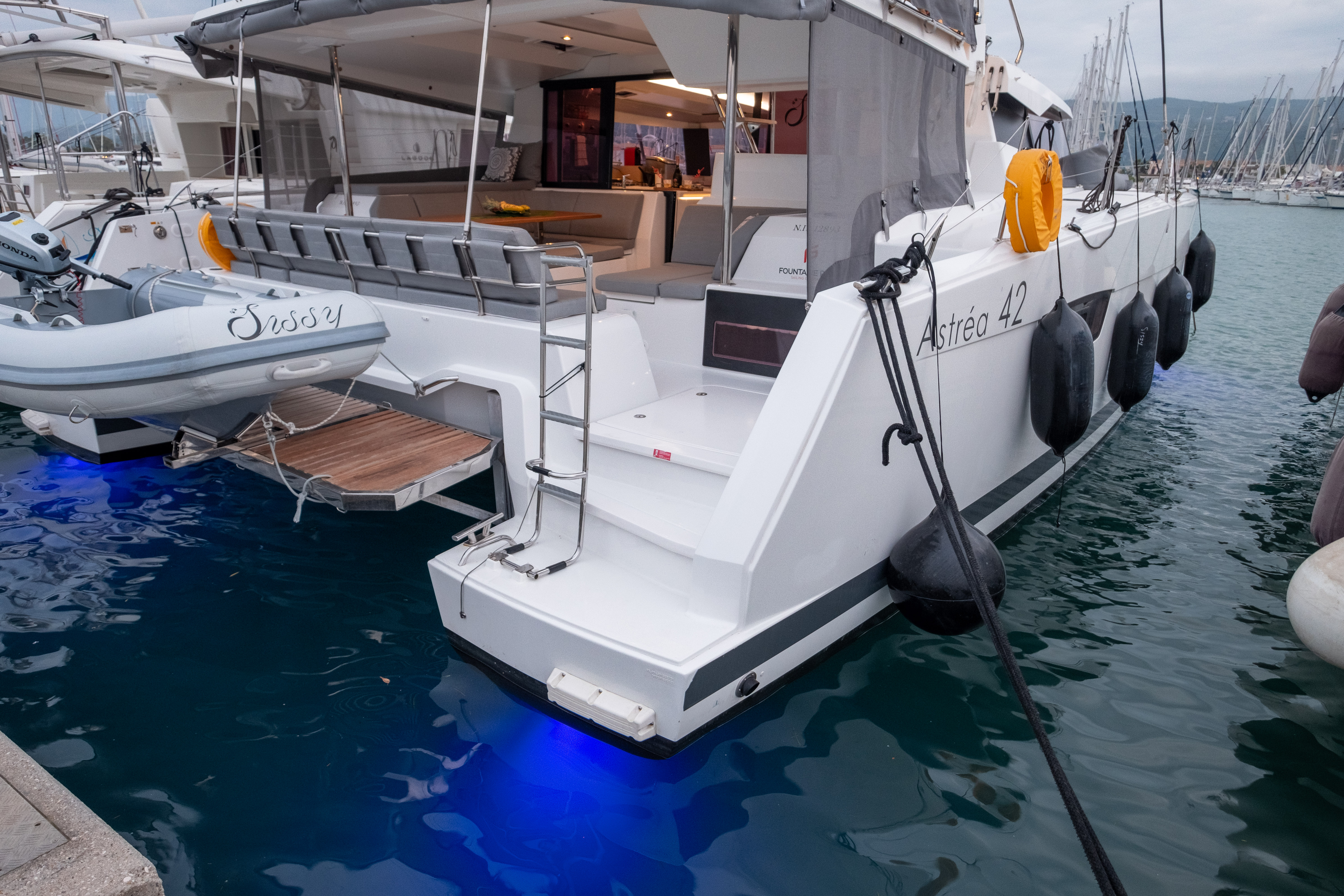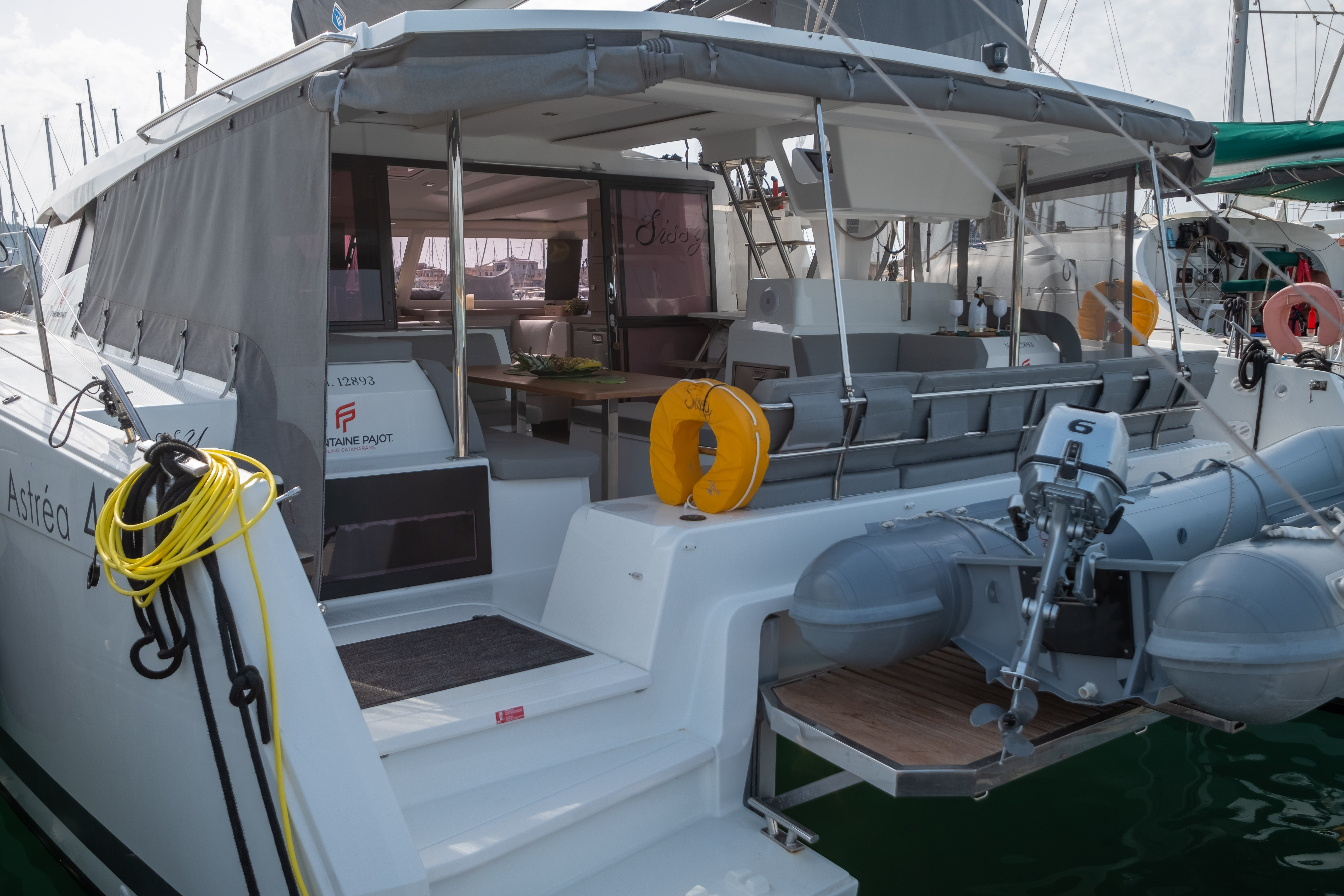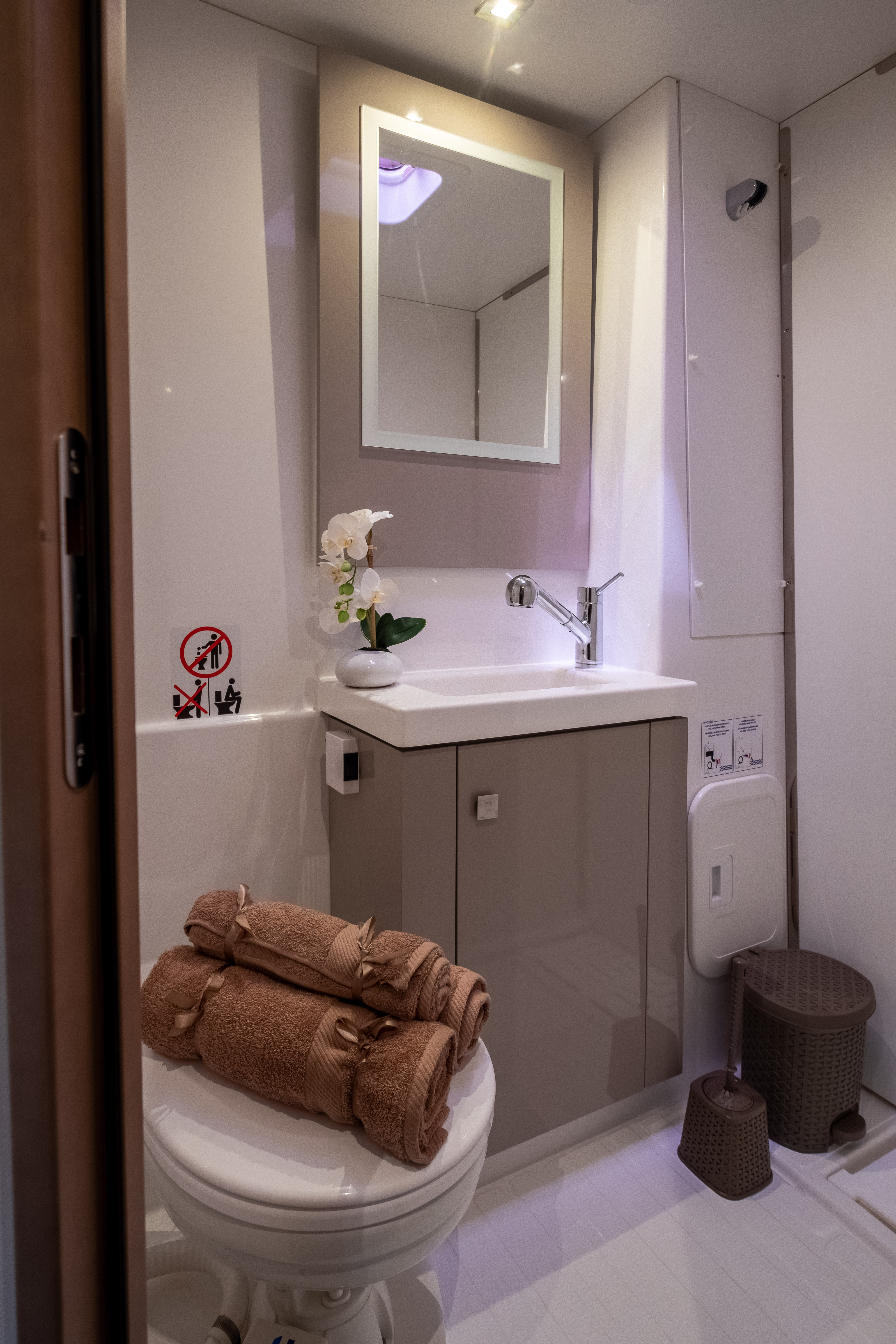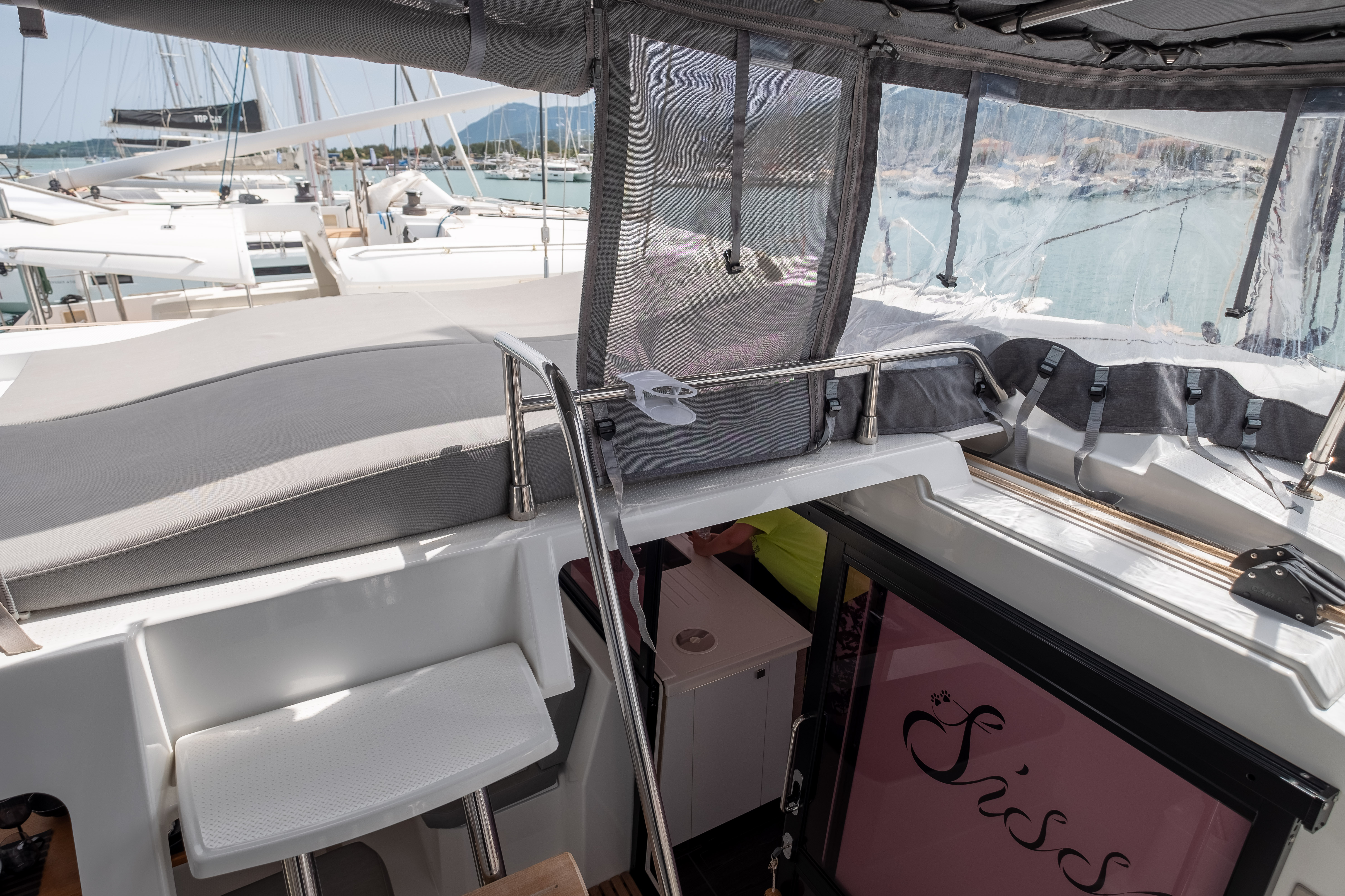| Inside | FUSION Sound System, Gefrierschrank, Generator, Inverter 12V/220V, Klimaanlage (ohne Landstrombedarf), LED-Innenleuchten, Mikrowelle, Pantryausstattung, Salontisch absenkbar, Trichter, TV, USB Steckdose, Ventilatoren in Salon und Kabinen, Watermaker |