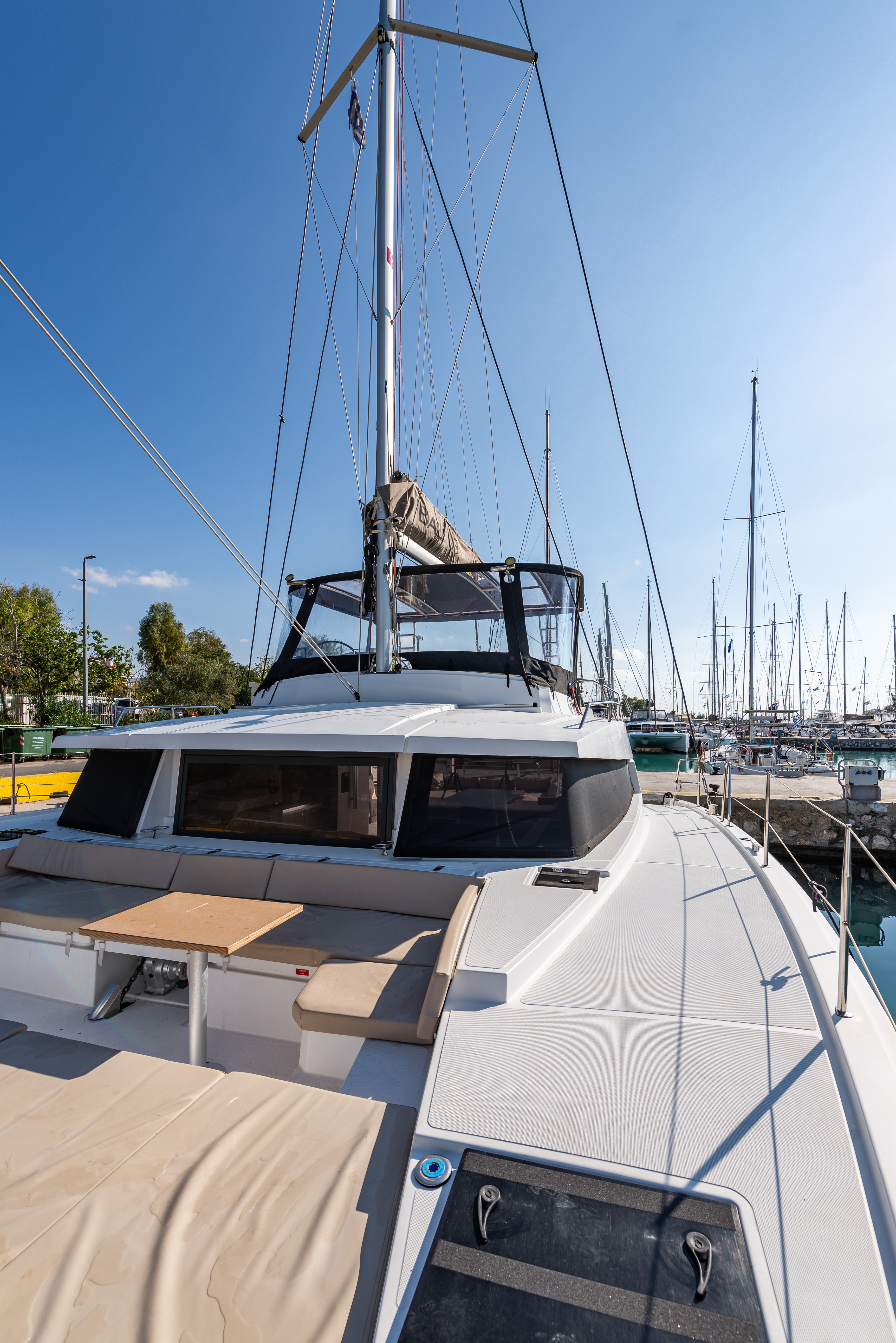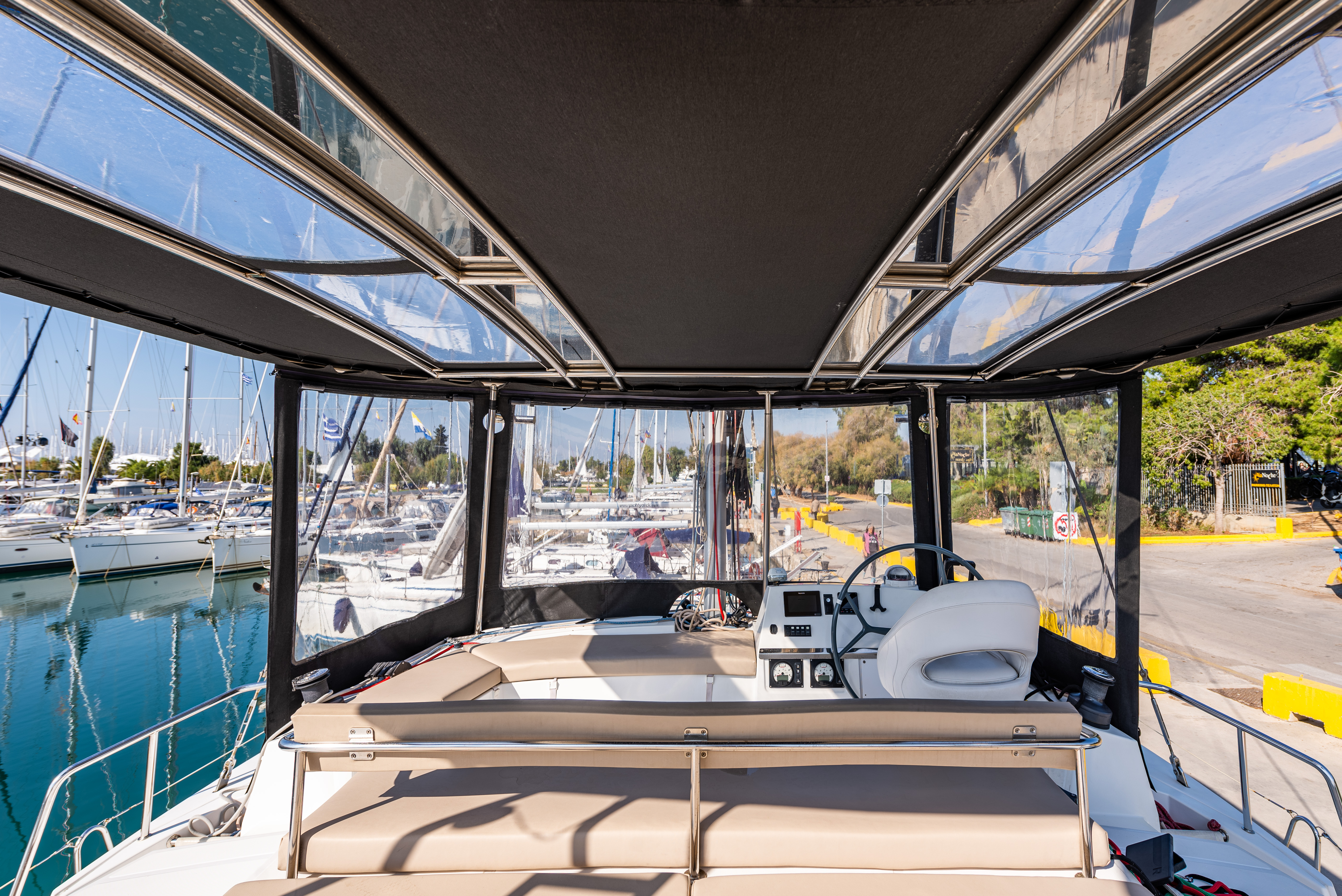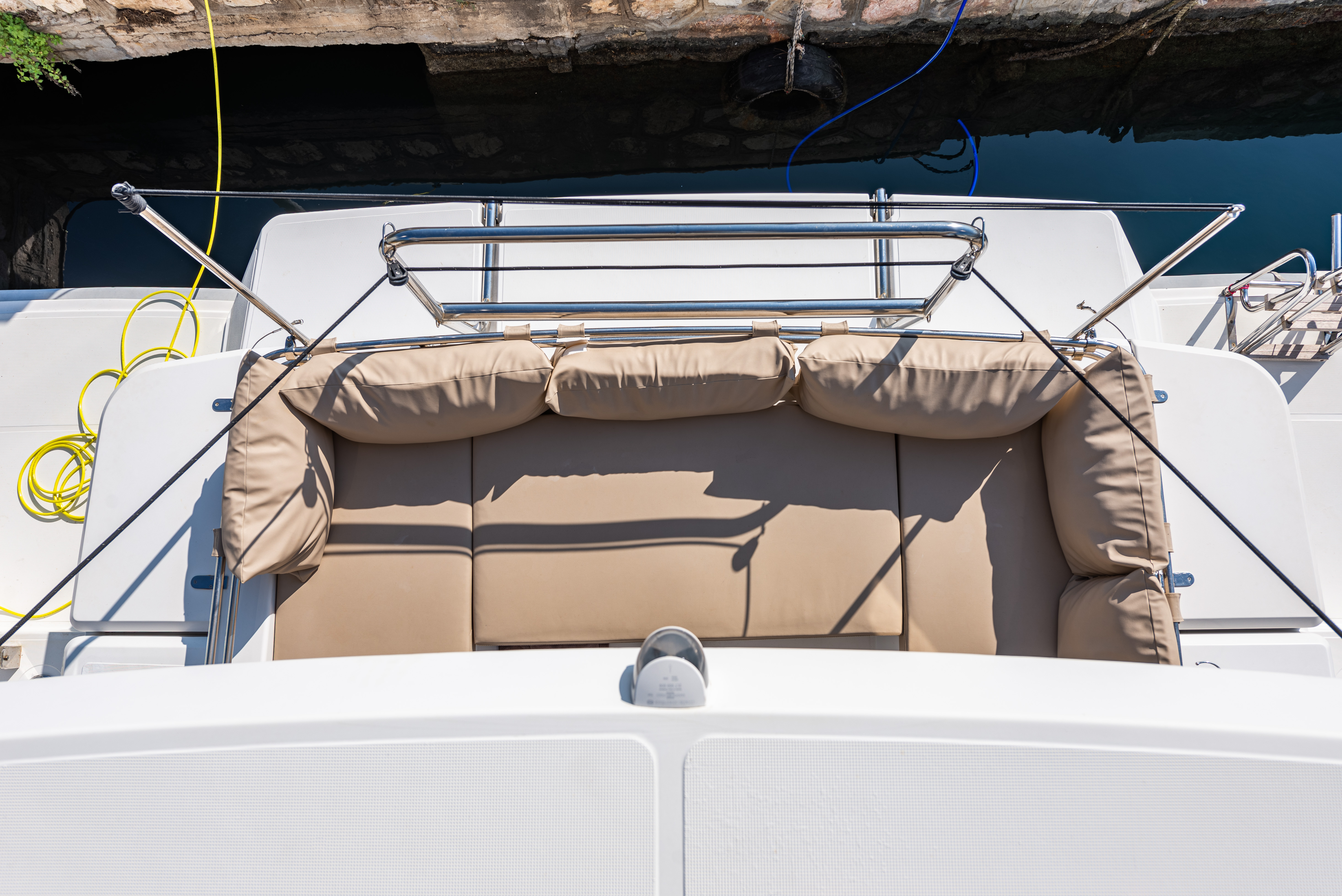 | Outside | Badeleiter, Biminitop, Cockpitdusche, Cockpitpolster, Cockpittisch, Deckpolster, elektr. Ankerwinsch, elektr. Winsch, Segel-Flickwerkzeug, Solaranlage, Sonnendeck, Sprayhood, Treibanker, Windex |