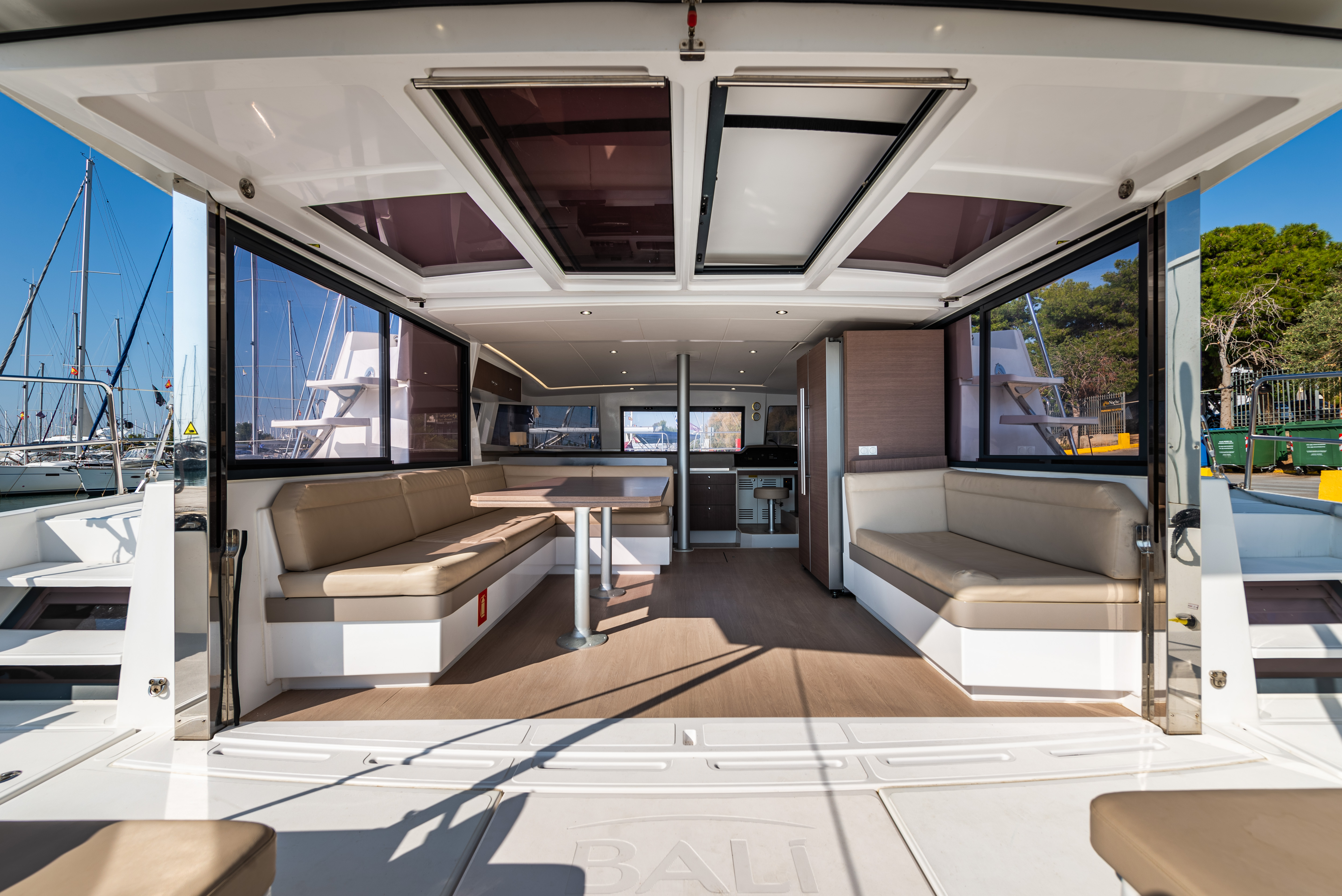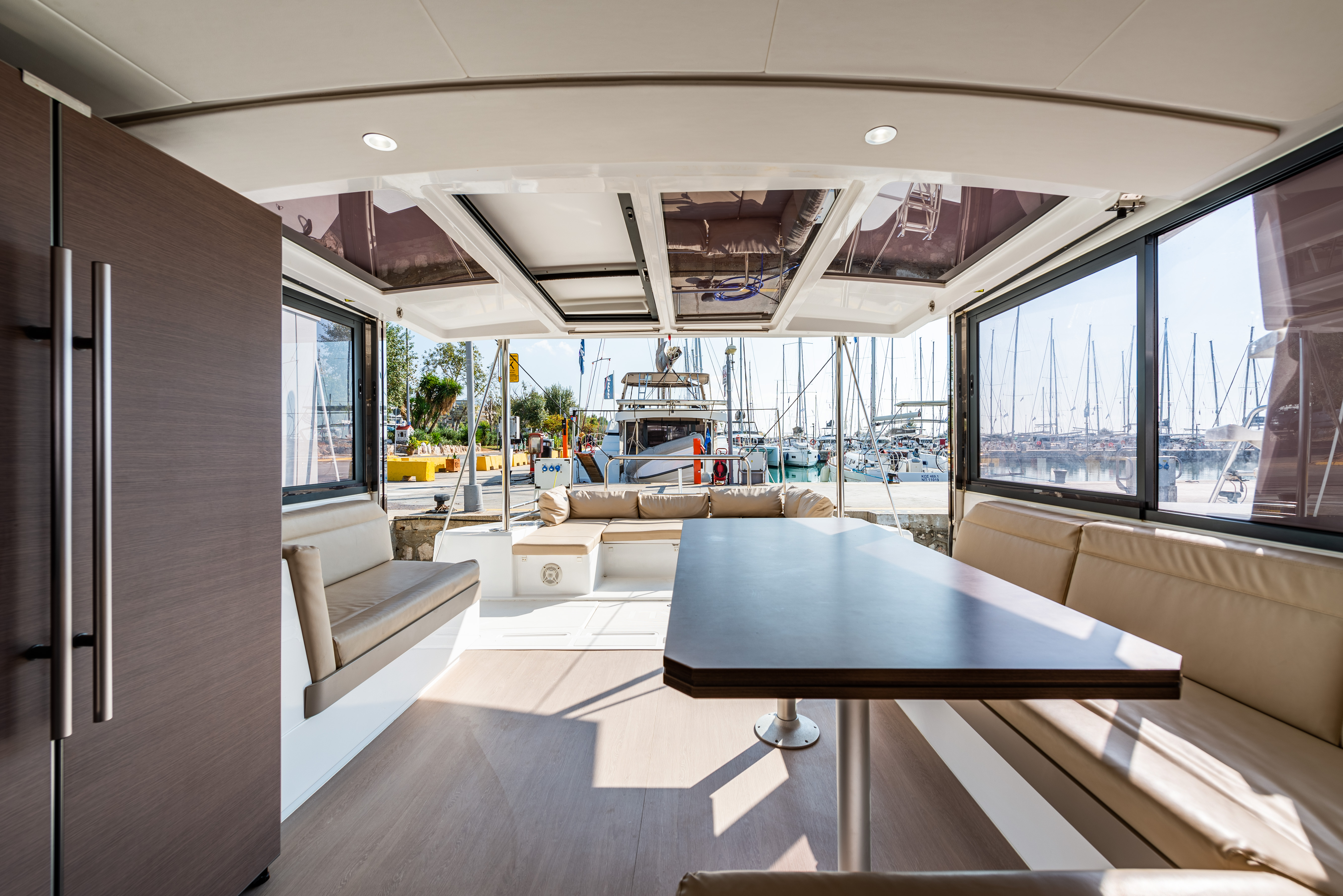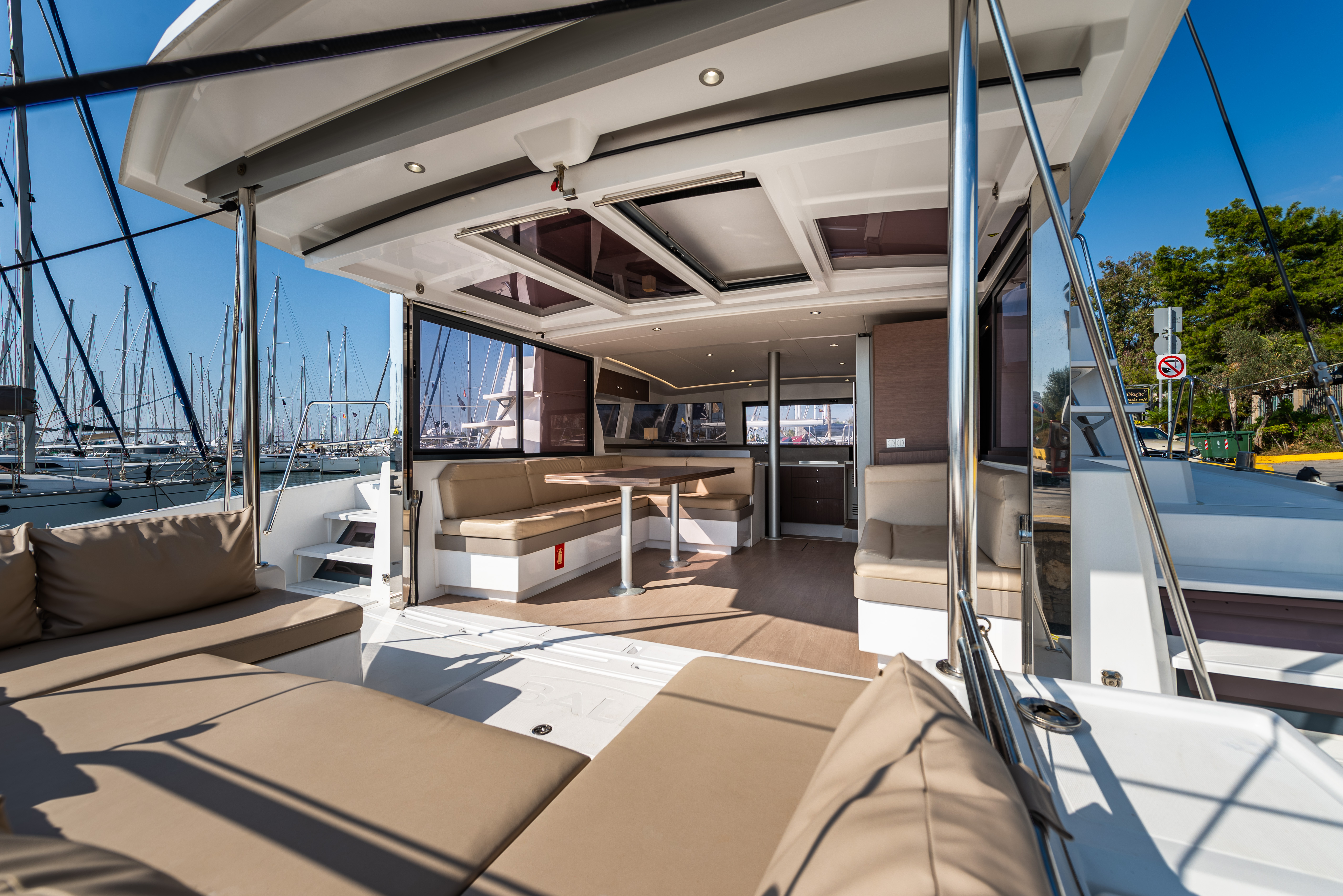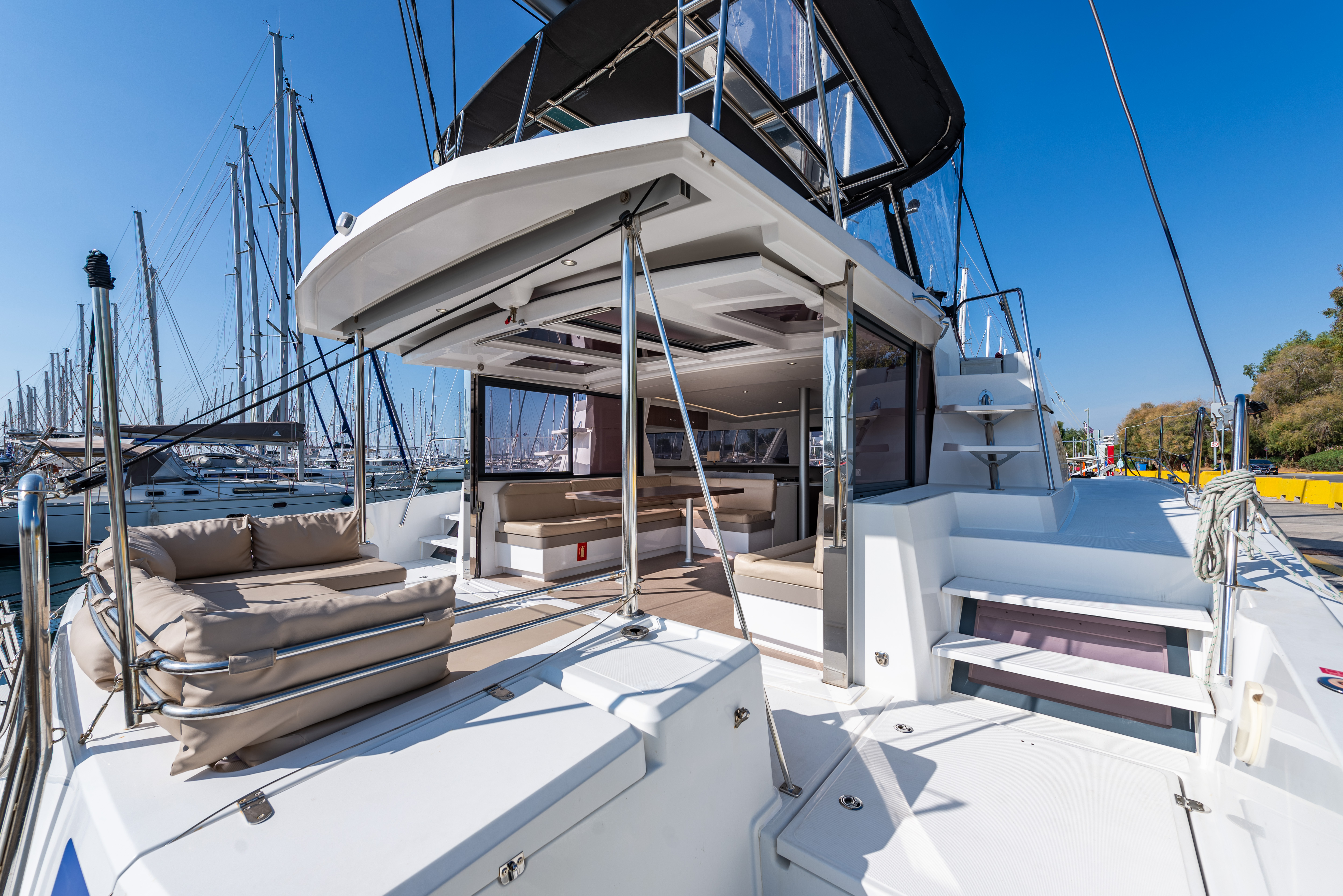 | Outside | Badeleiter, Biminitop, Cockpitdusche, Cockpitpolster, Cockpittisch, Deckpolster, elektr. Ankerwinsch, elektr. Winsch, Segel-Flickwerkzeug, Solaranlage, Sonnendeck, Sprayhood, Treibanker, Windex |