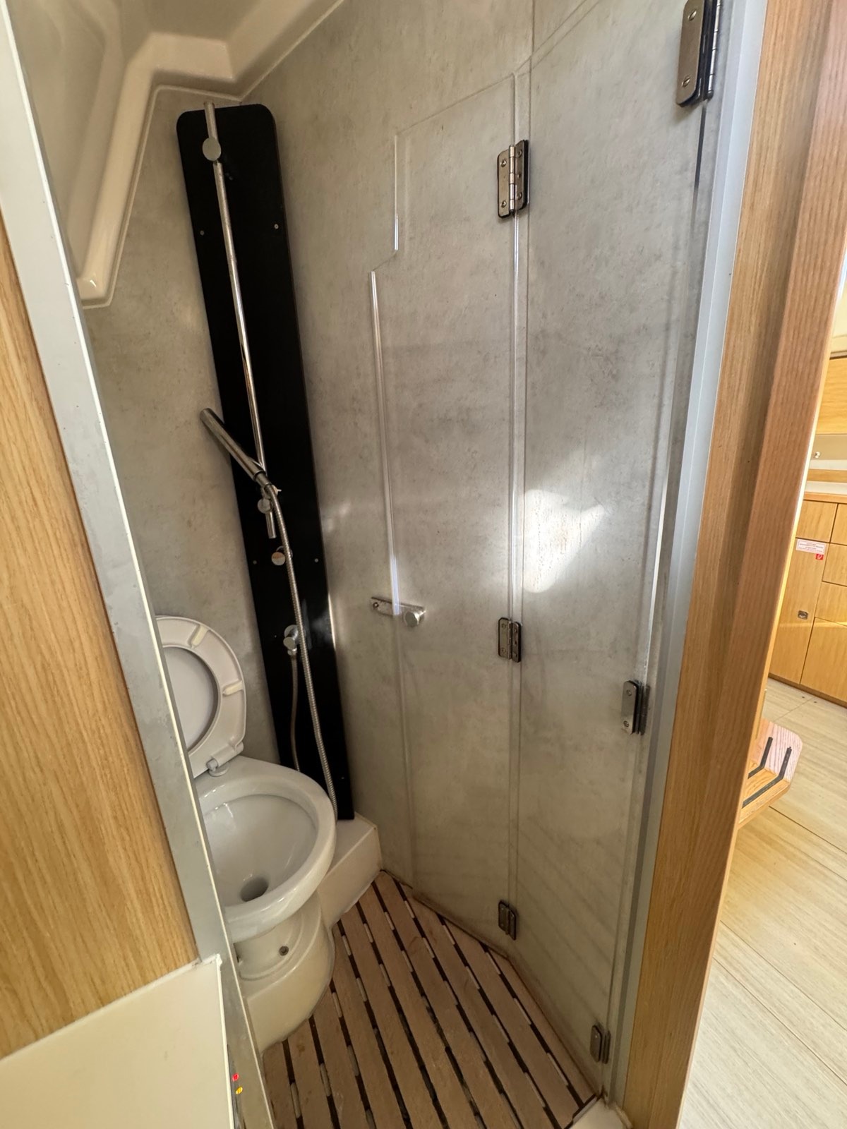 | Inside | 220V Steckdosen, Borduhr, Fäkalientank, Gasherd, Klimaanlage (Landstrom), Kühlschrank, Lautsprecher im Salon, Pantryausstattung, Radio mit CD, Salontisch absenkbar, USB Steckdosen in den Kabinen, Ventilatoren in Kabinen, Warmwasser, WC (elektr.) |
