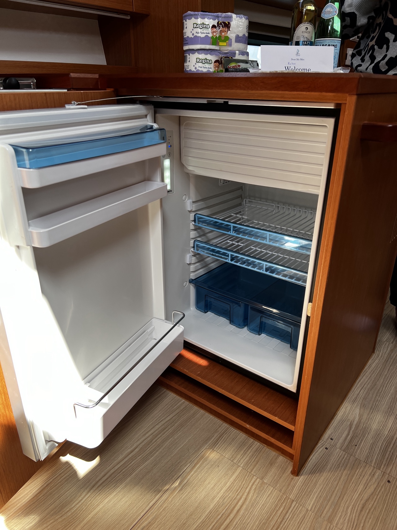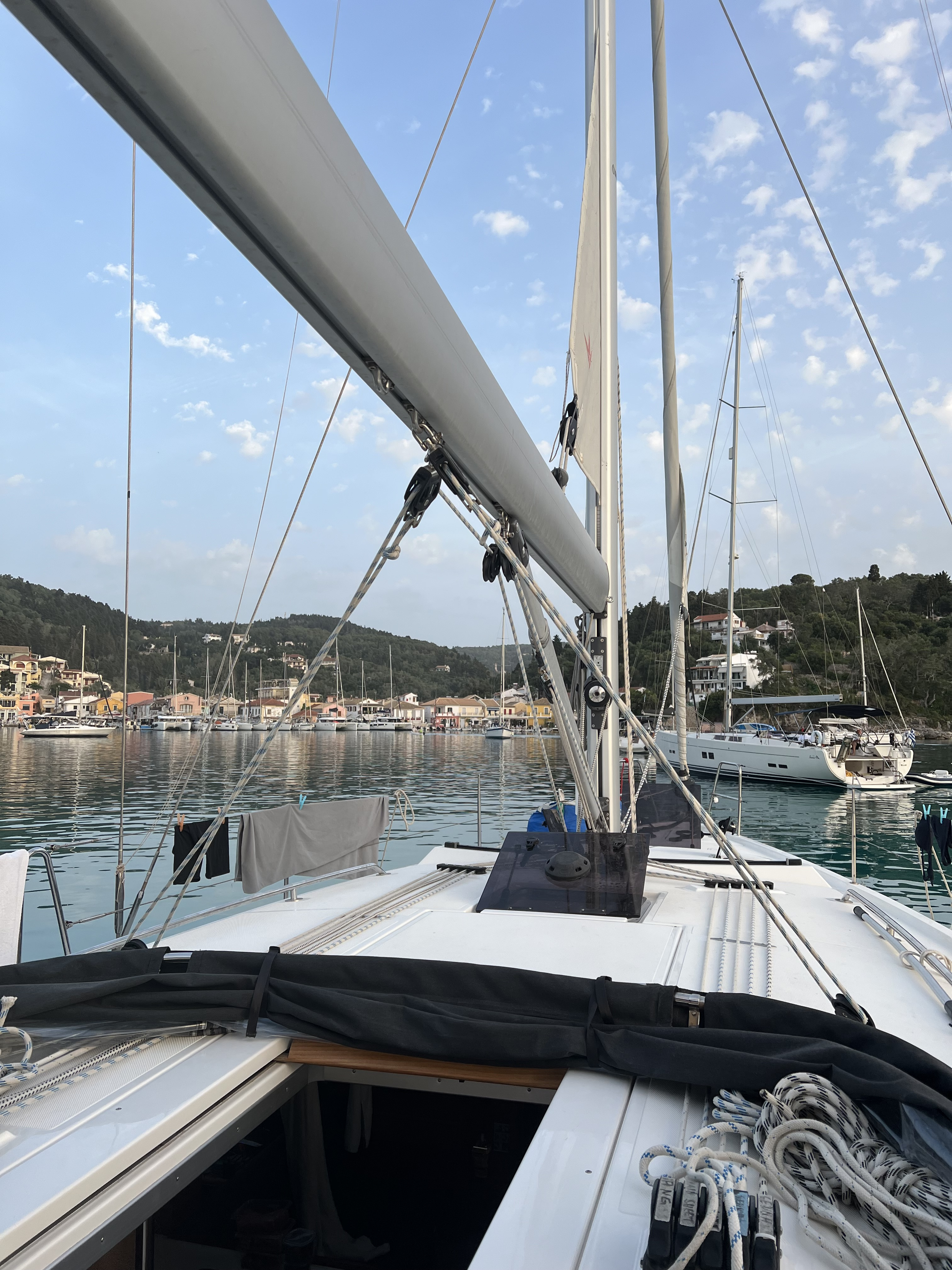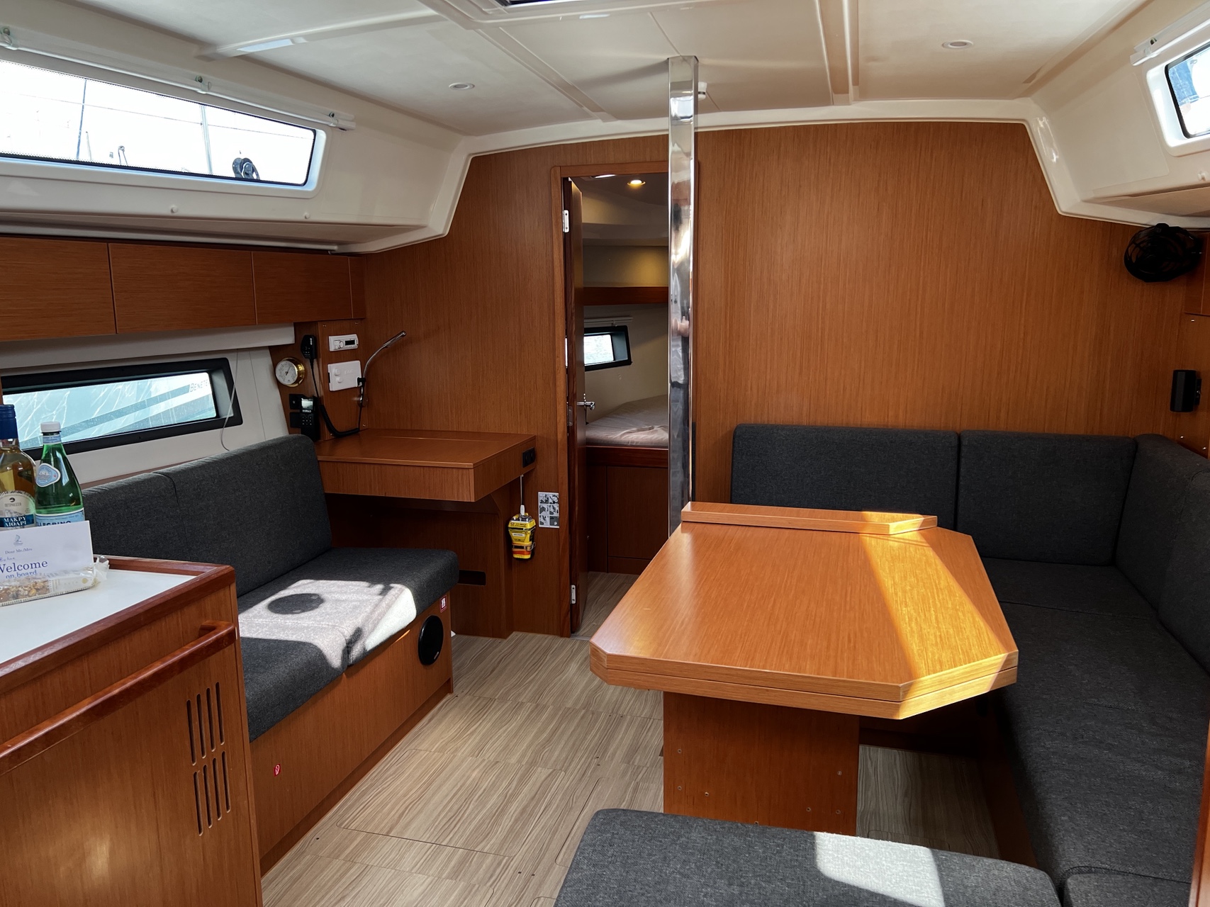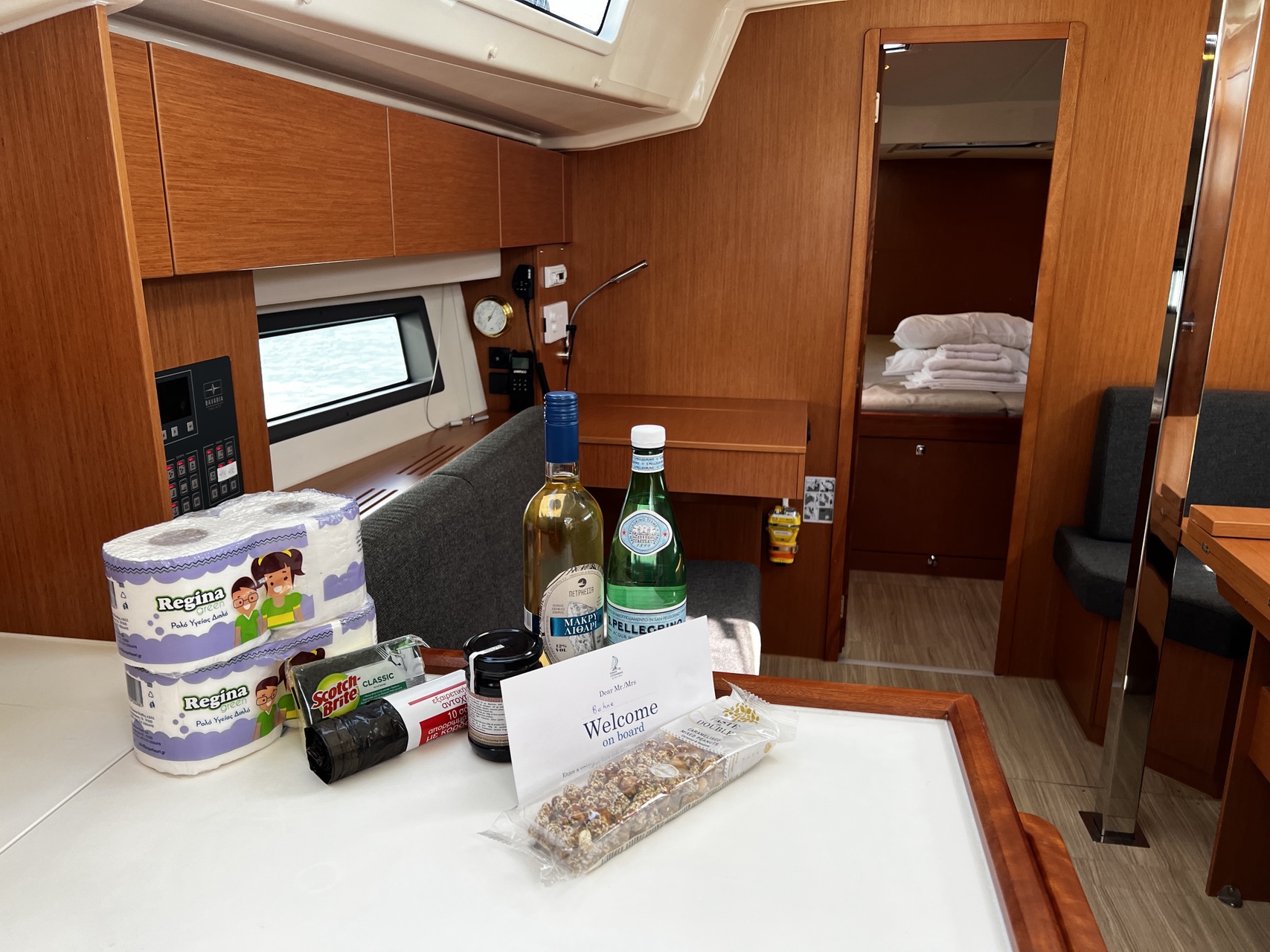 | Outside | Badeleiter, Biminitop, Bootshaken, Cockpitdusche, Cockpitlautsprecher, Cockpitpolster, Cockpittisch, Deckbürste, Dieselkanister , elektr. Ankerwinsch, Fender, Festmacherleinen, Kunststoff-Eimer (Pütz), Solaranlage, Sprayhood, Teak im Cockpit, Winschen |