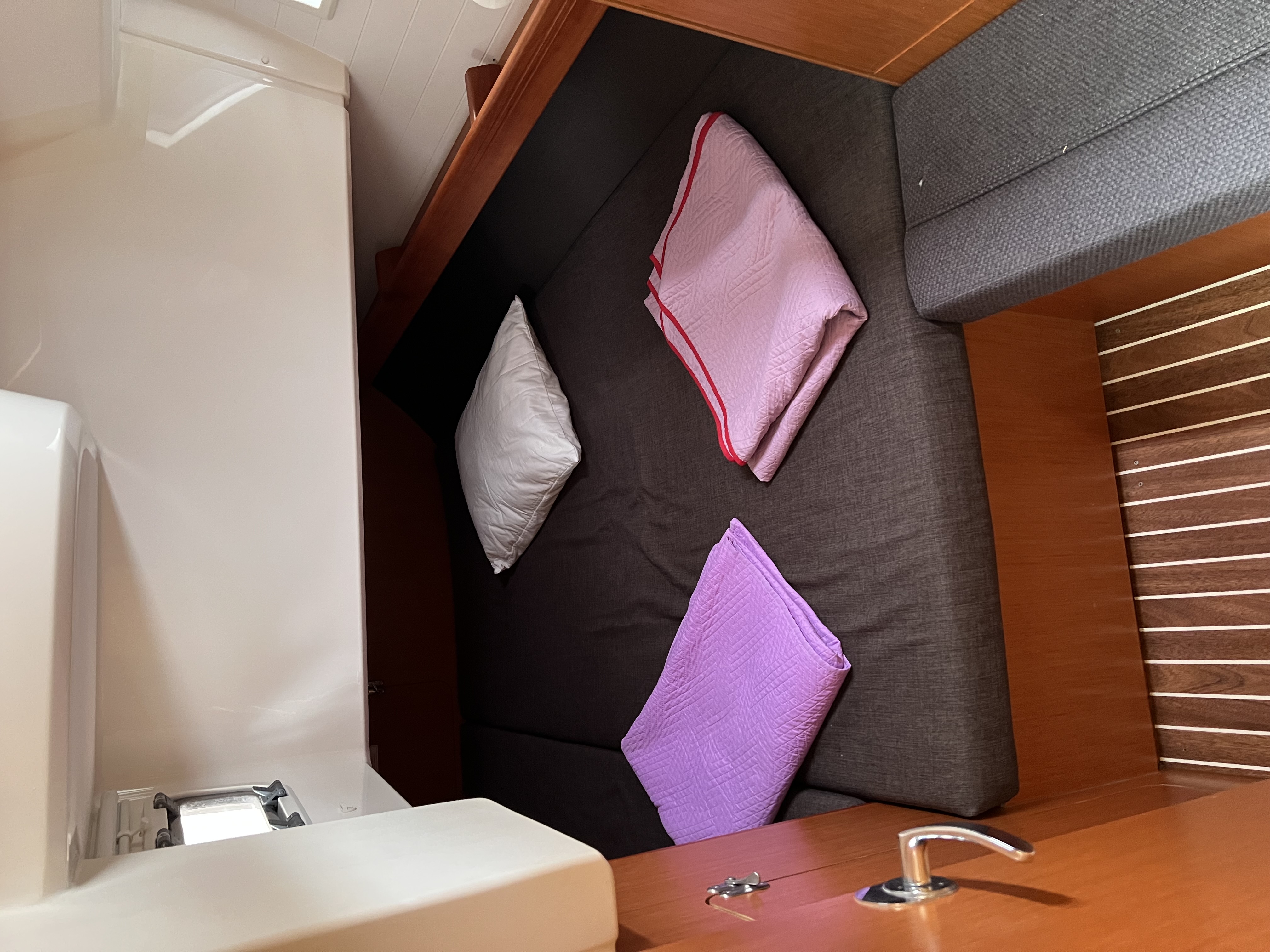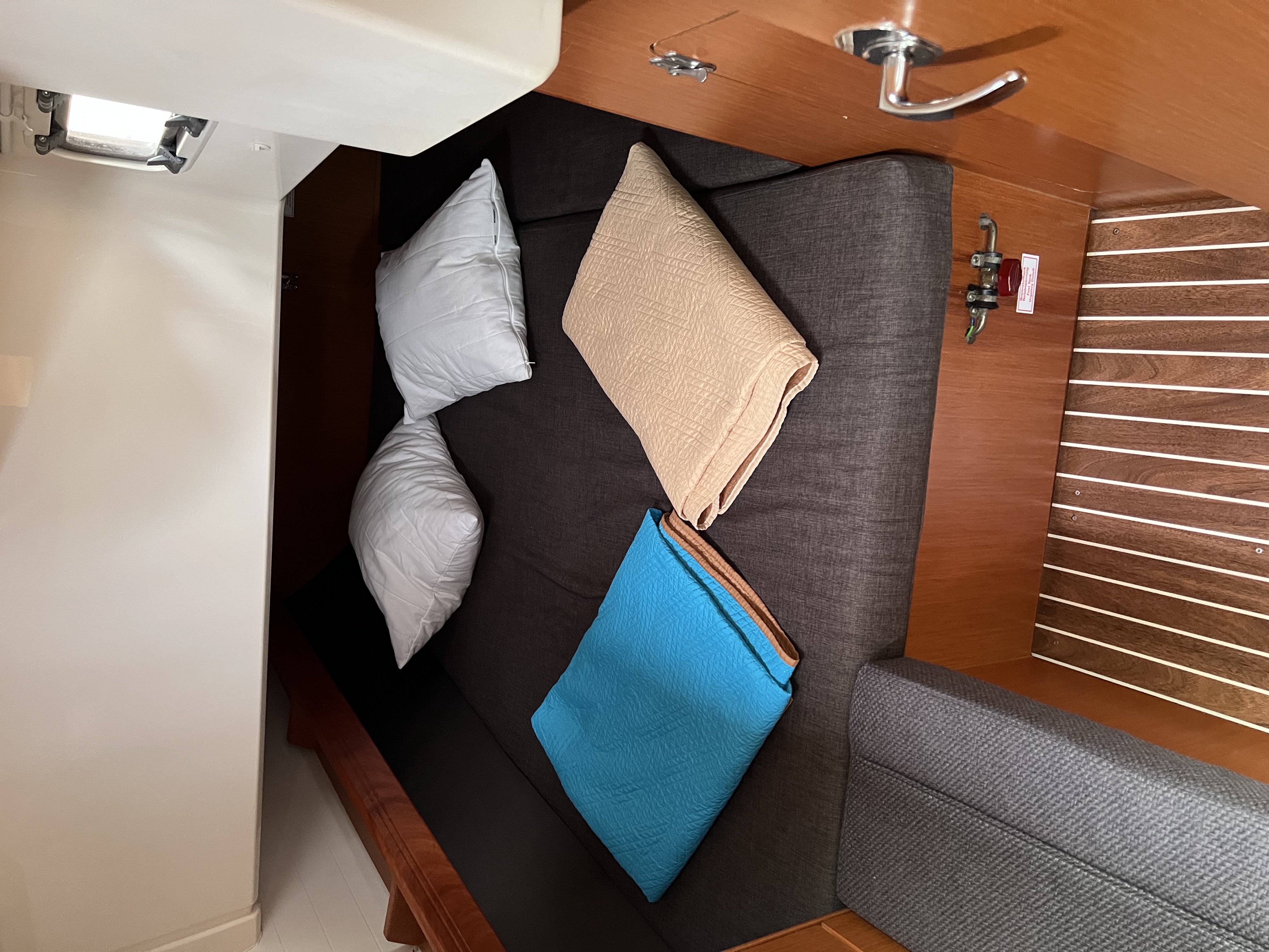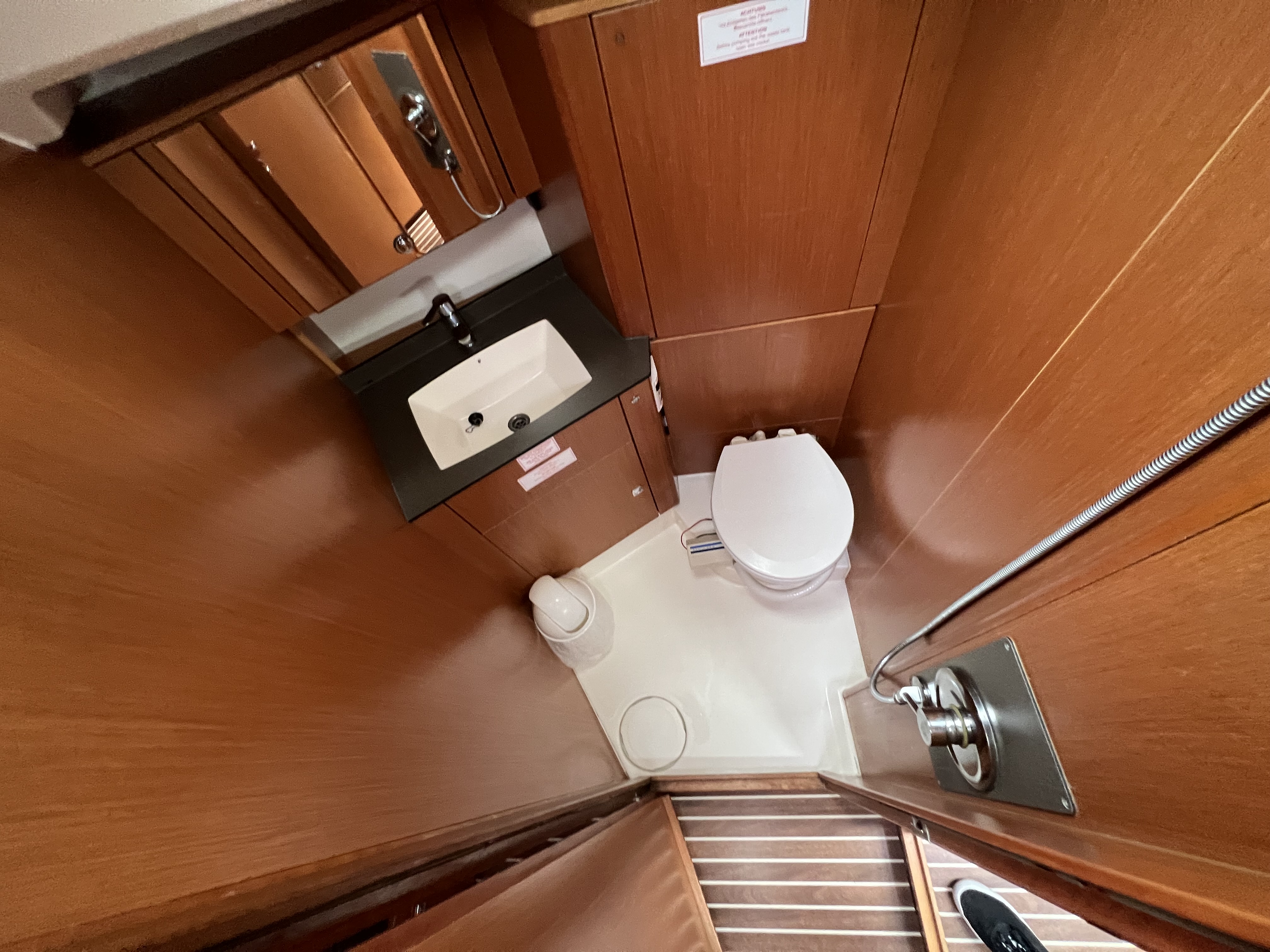 | Outside | Badeleiter, Badeplattform, Biminitop, Cockpitlautsprecher, elektr. Ankerwinsch, Solaranlage, Sprayhood, Teak im Cockpit |