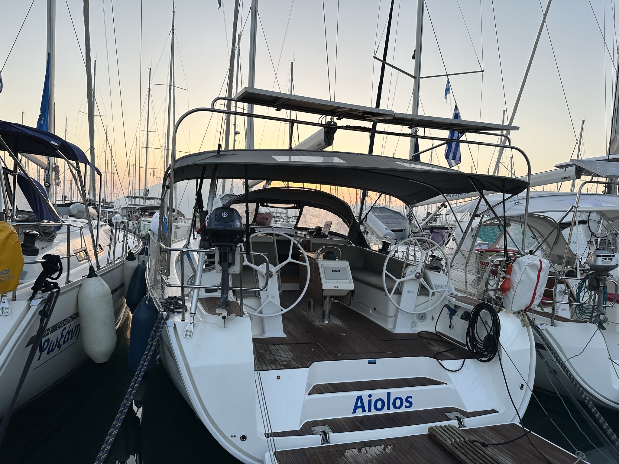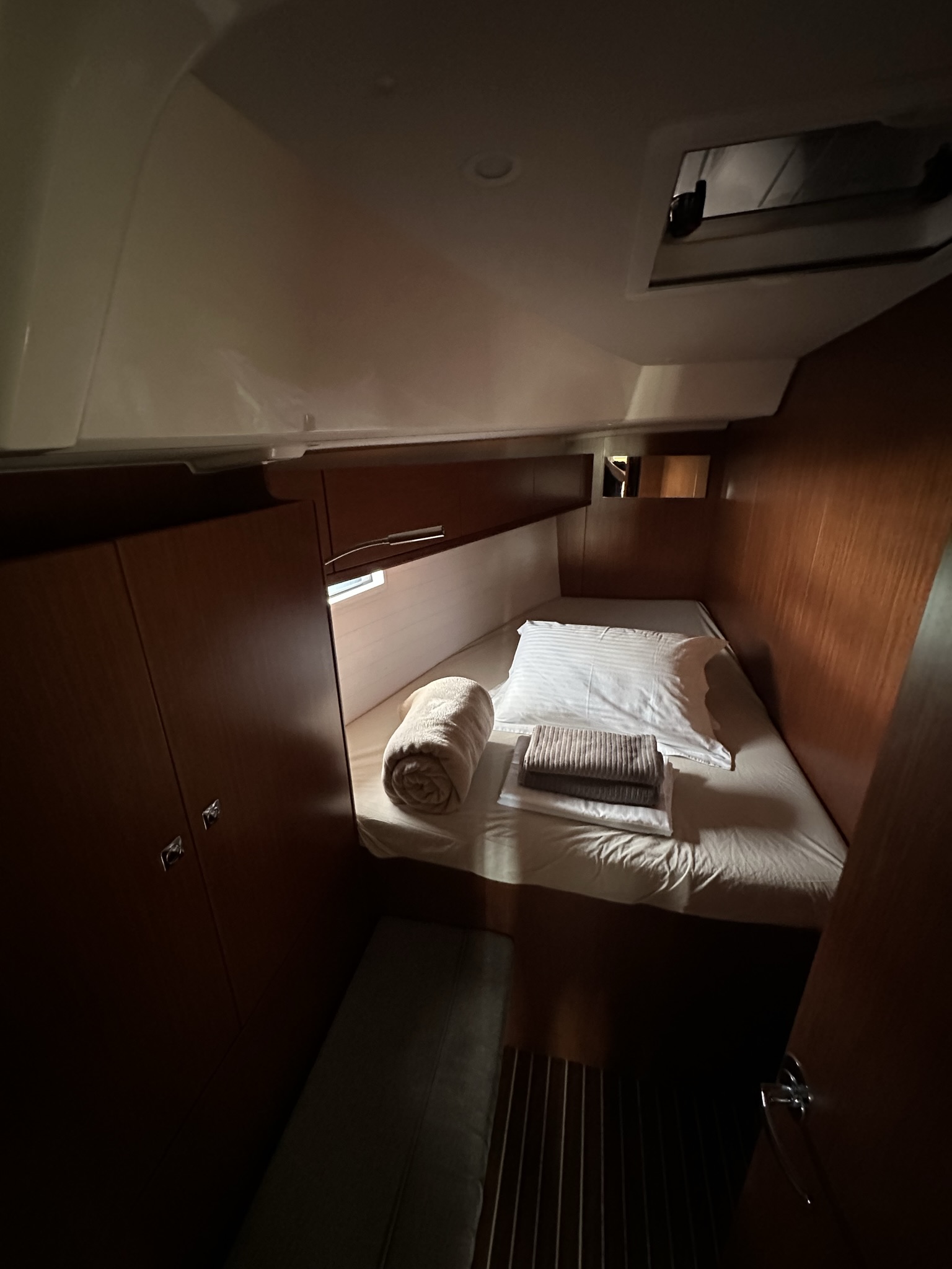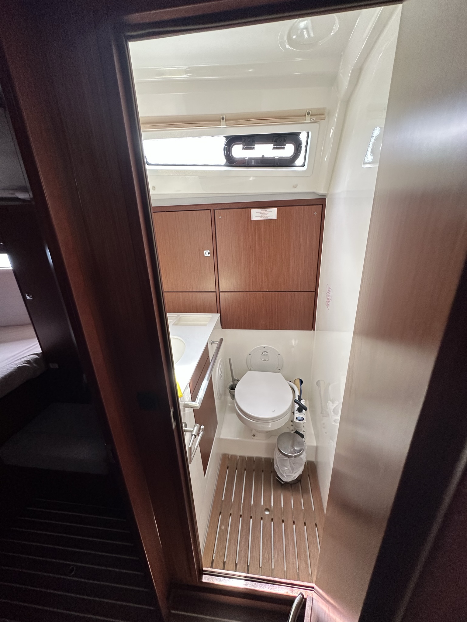 | Outside | Anker mit Kette, Badeleiter, Biminitop, Bootshaken, Cockpitdusche, Cockpitlautsprecher, Cockpitpolster, Cockpittisch, Deckbürste, elektr. Ankerwinsch, Fender, Festmacherleinen, Kugelfender, Solaranlage, Sprayhood, Teak im Cockpit, Wasserkanister , Wasserschlauch, Windex |