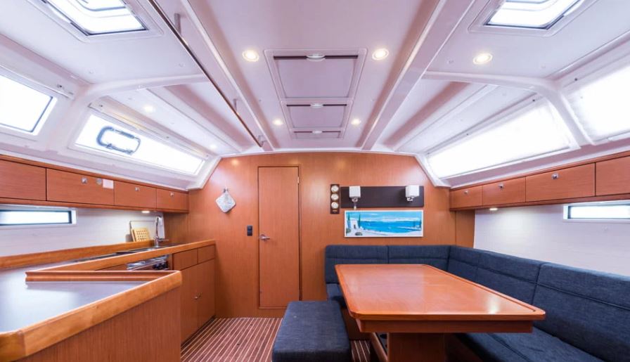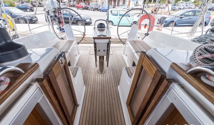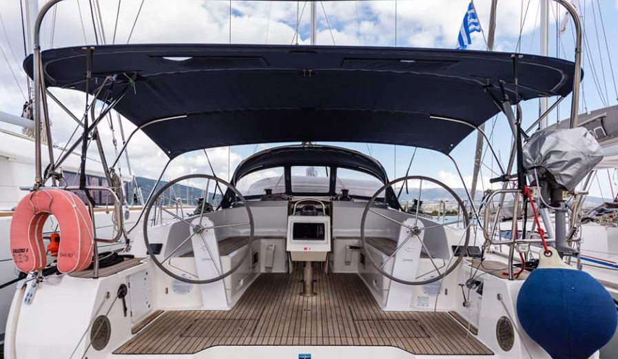 | Outside | Badeleiter, Biminitop, Cockpitdusche, Cockpitlautsprecher, Cockpittisch, elektr. Ankerwinsch, Segel-Flickwerkzeug, Solaranlage, Sprayhood, Teak im Cockpit, Treibanker, Windex |