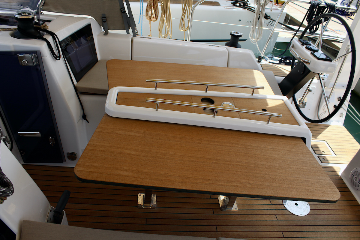 | Outside | 12 V-Anschluss, 220 V-Landanschluss, Ankerwinsch, Badeleiter, Badeplattform, Biminitop, Cockpitdusche, Cockpitlautsprecher, Cockpitpolster, Cockpittisch, Delta-Anker, elektr. Ankerwinsch, Fender, Fernsteuerung für elektr. Ankerwinsch, Gangway, Grill, Heckdusche, Solaranlage, Sprayhood |