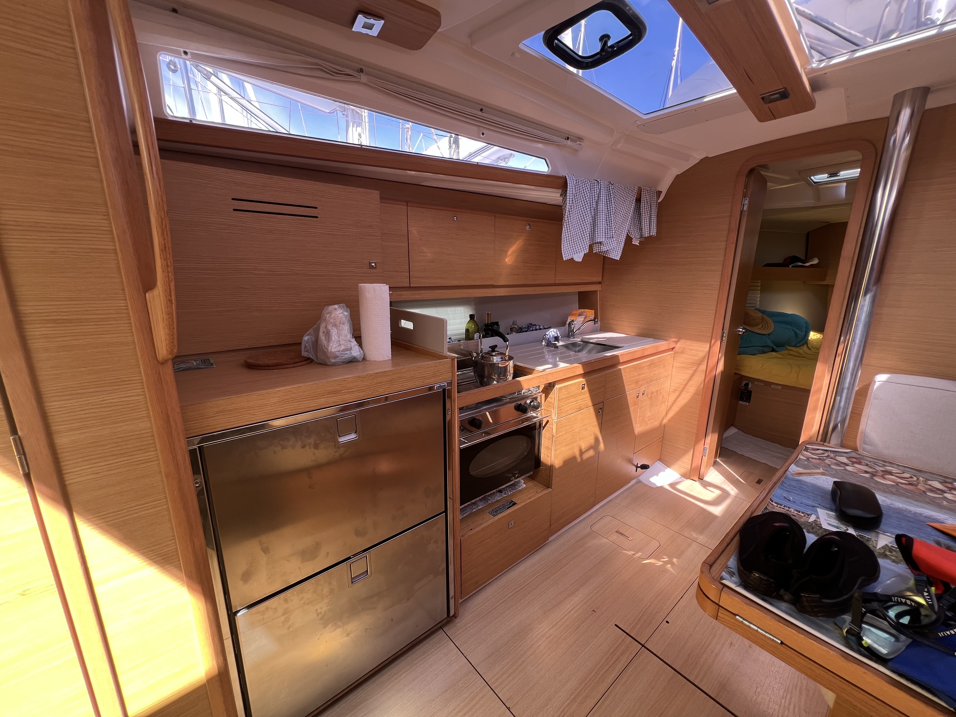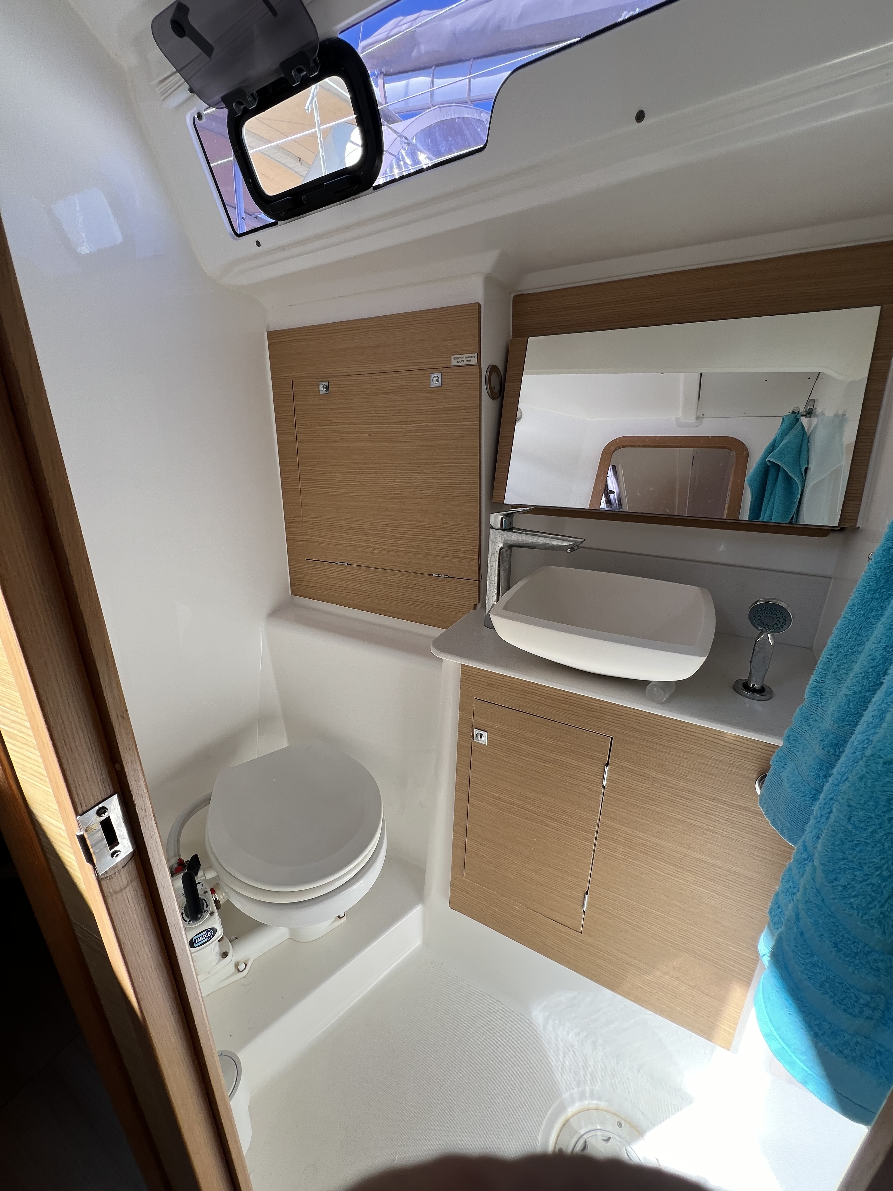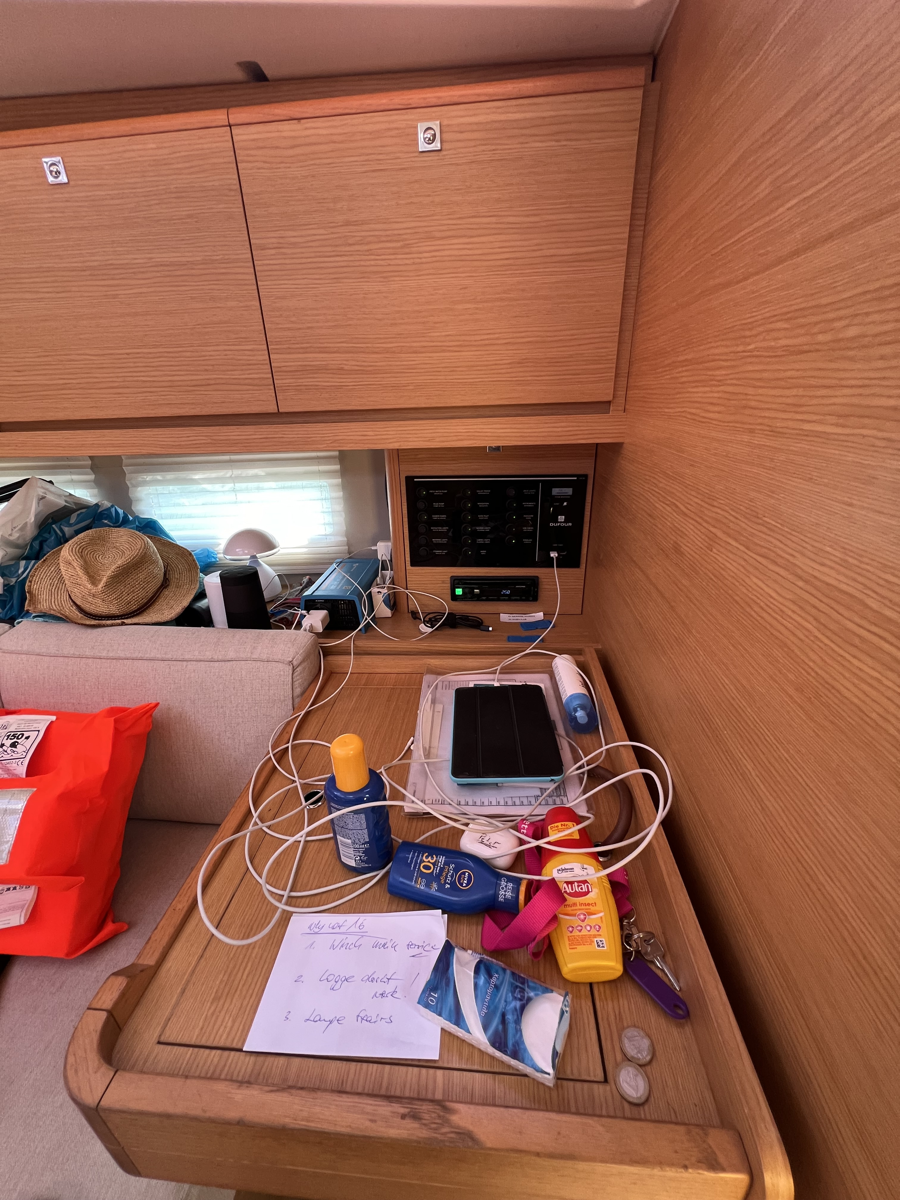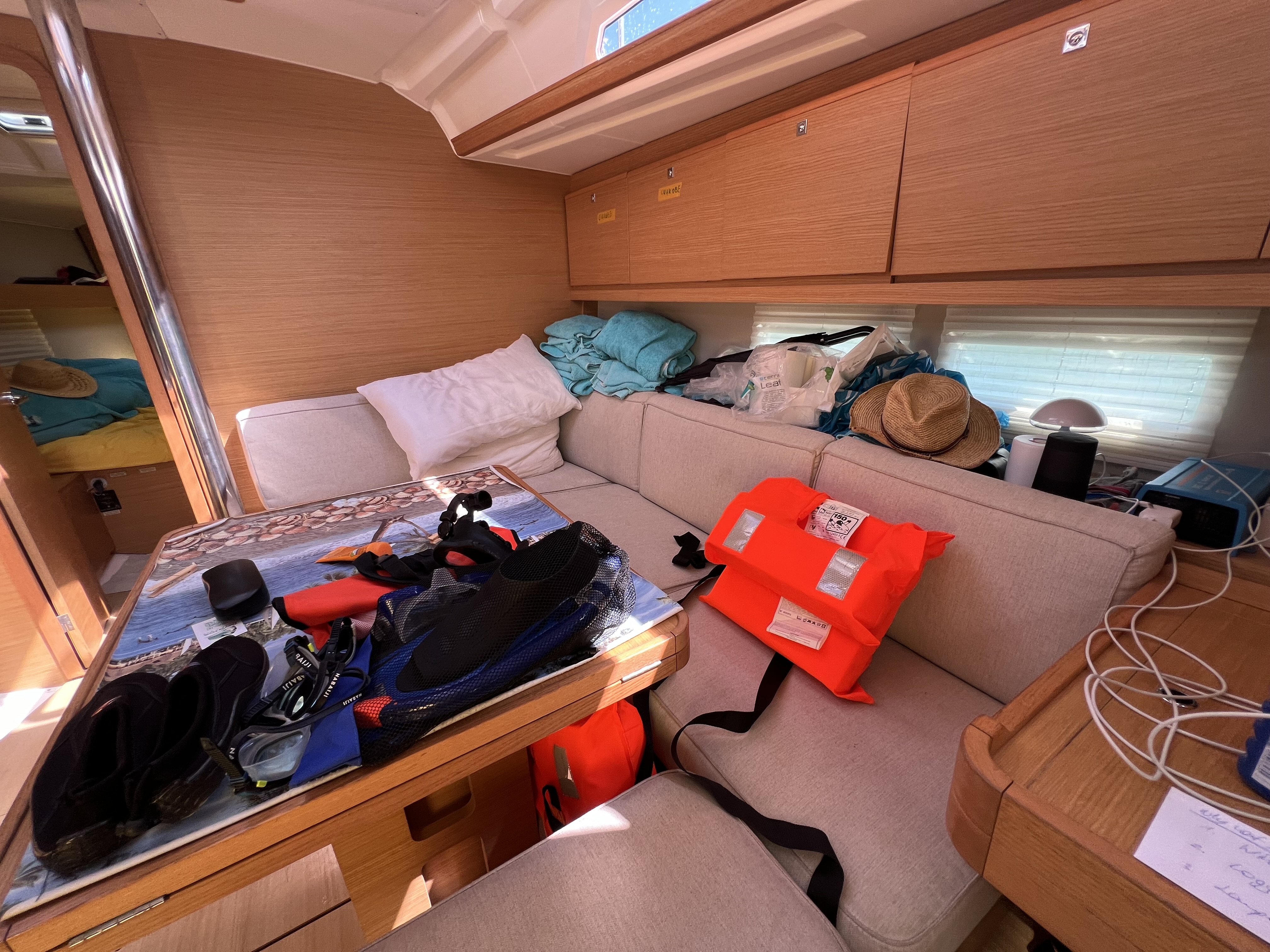 | Outside | 220 V-Landanschluss, Anker mit Kette, Ankerwinsch, Badeplattform, Biminitop, Cockpitdusche, Cockpitlautsprecher, Cockpitpolster, Cockpittisch, Fender, Gangway, Grill, Solaranlage, Sprayhood, Windex |