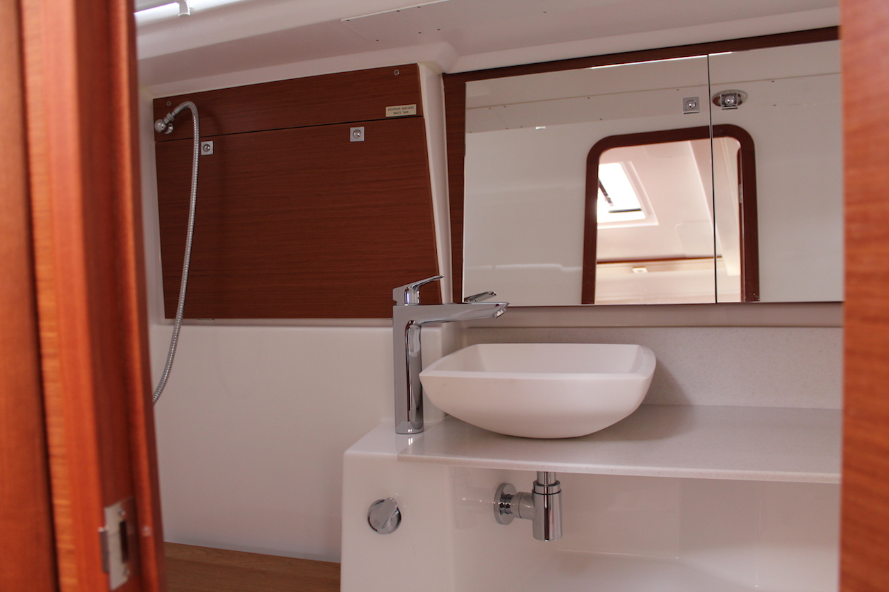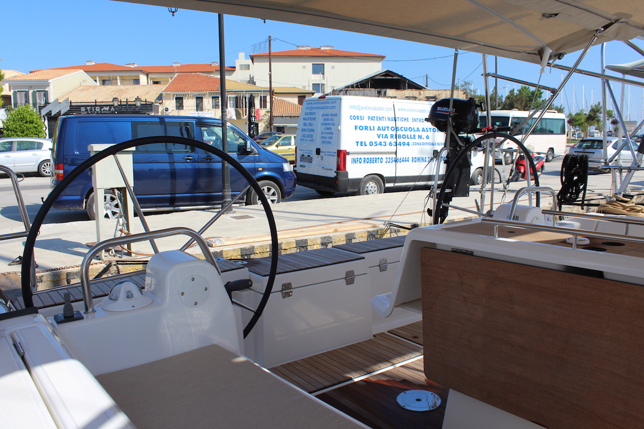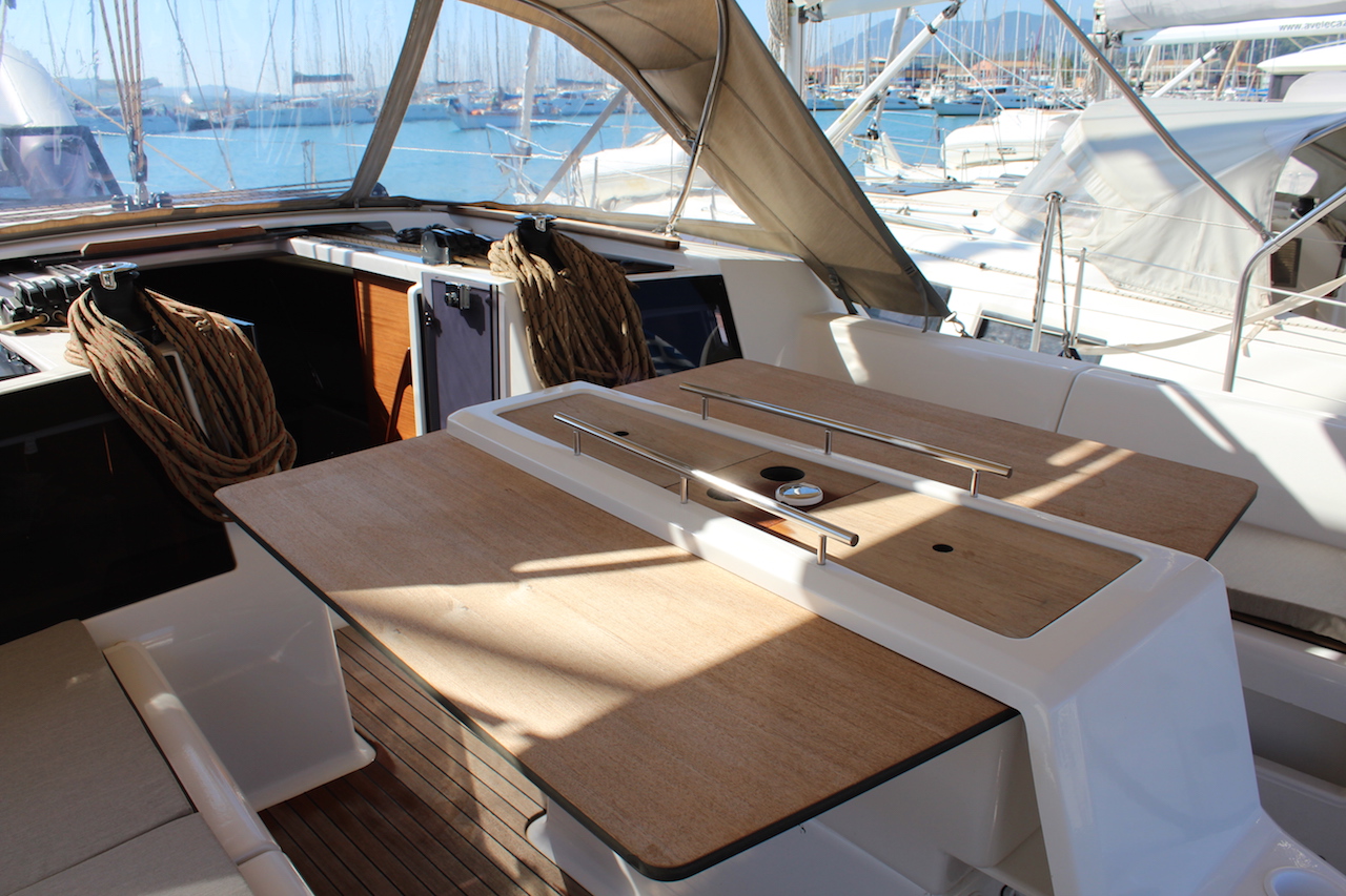 | Outside | 220 V-Landanschluss, Anker mit Kette, Ankerwinsch, Badeleiter, Badeplattform, Biminitop, Cockpitlautsprecher, Cockpitpolster, Cockpittisch, elektr. Ankerwinsch, Fender, Gangway, Grill, Solaranlage, Sprayhood, Windex |