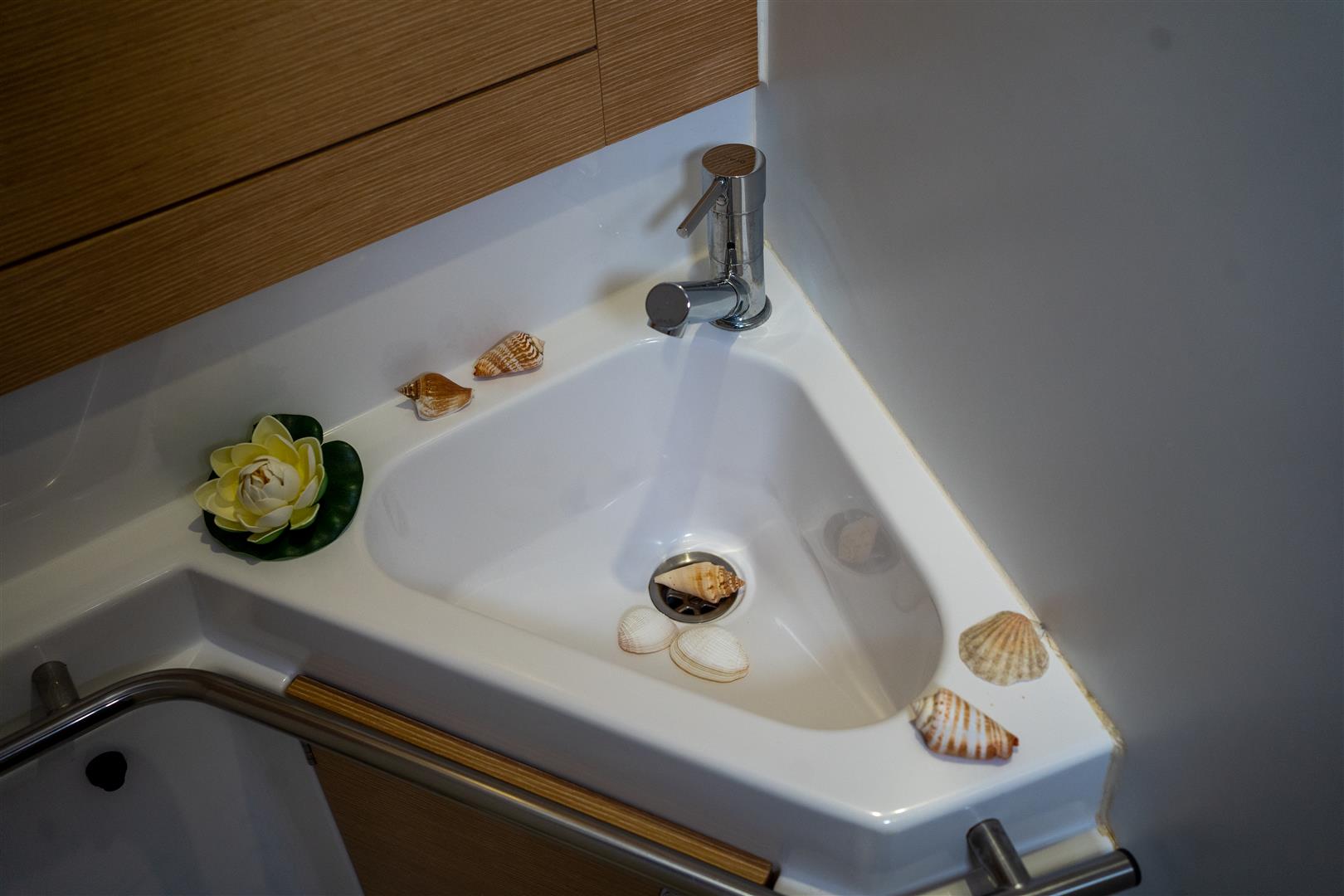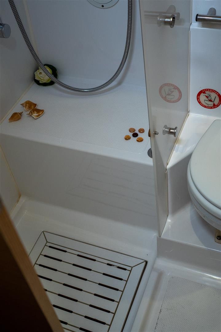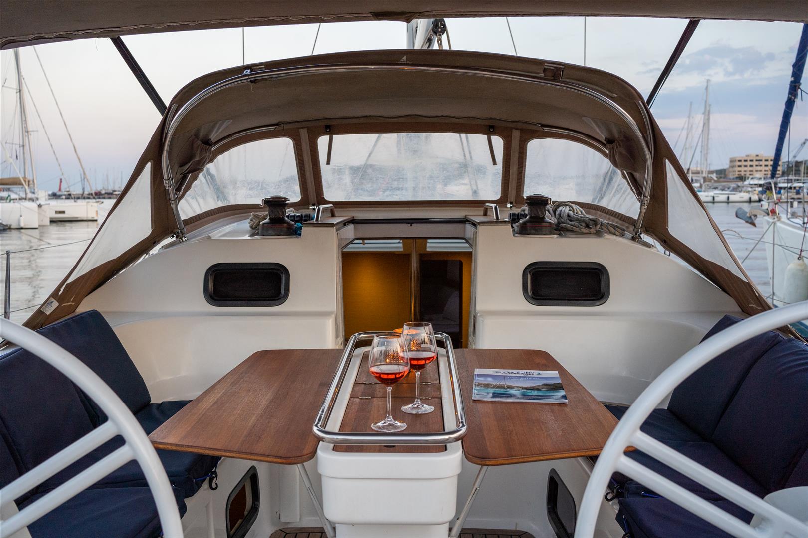 | Outside | Anker mit Kette, Badeleiter, Benzinkanister, Biminitop, Bootshaken, Cockpitdusche, Cockpitpolster, Deckbeleuchtung, Deckbürste, Dieselkanister , elektr. Ankerwinsch, Gangway, Kunststoff-Eimer (Pütz), Segel-Flickwerkzeug, Sprayhood, Teak im Cockpit, Wantenschneider, Wasserschlauch, Windex, Winschen |